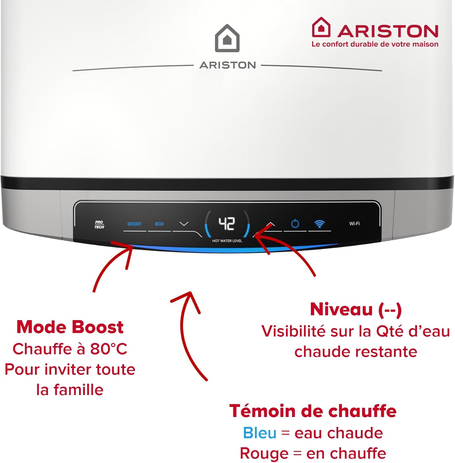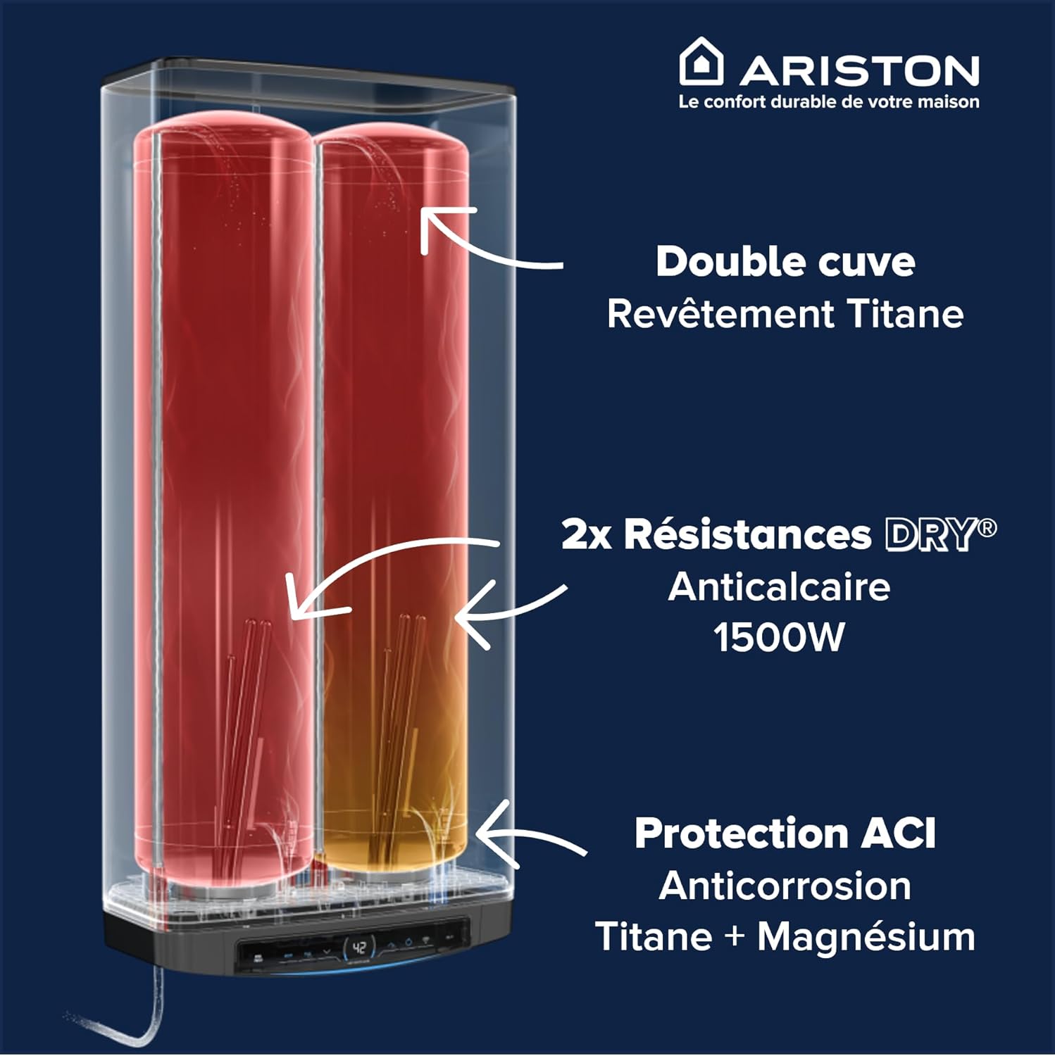 Energy Flexible Service optimizes water heater energy consumption by adjusting heating time during off-peak hours, improving overall comfort and saving energy for smart daily use. Energy Saving: Up to 25% energy consumption can be reduced using the ECO/EVO function and remote control via the Ariston NET app. Suitable for 3-4 people. Energy Efficiency Rating B. Highest ACI Protection: Two enamel-coated steel tanks with titanium coating, two wear-resistant titanium anodes, and two magnesium anodes ensure maximum durability! Dry Heating Technology: Each tank is equipped with dual non-immersion, scale-resistant dry heating elements. Ultra-fast heating, maintenance-free operation without draining, and uninterrupted hot water supply. Reliability Guarantee: Lifetime free tank replacement thanks to Energy Flexible Service. The product is certified to French and European standards and comes with a 2-year warranty covering labor, travel, and parts costs. Space Saving: Ultra-thin water heater, only 27cm thick, can be installed flexibly vertically or horizontally (left-side outlet only). Ideal for small apartments, maximizing space savings. Ariston Velis Evo Dry Wifi Water Heater: Energy Flexibility and Environmental Responsibility. The Ariston Velis Evo Dry Wifi water heater features the innovative "Energy Flexibility Service." This intelligent system automatically adjusts heating cycles to optimize your energy consumption, avoid peak-hour electricity usage, and promote the use of renewable energy. Reduce your carbon footprint while enjoying a continuous supply of hot water. Performance and Comfort. This instant water heater has a 45-liter capacity and quickly heats 110 liters of hot water (V40) at 40SpendC, ensuring you have a hot shower in just 45 minutes. Its intuitive touchscreen allows you to easily adjust the temperature and daily programs, while automatic antifreeze mode and heat sterilization function ensure safe operation. Flexible Installation to Meet Your Individual Needs: The compact and versatile Ariston Velis Evo Dry Wifi water heater, with its vertical or horizontal installation (left-side outlet only) and 27.5 cm depth, perfectly adapts to your space. 230V power, a self-diagnostic system, and included insulation accessories make installation even easier. Choose the Ariston Velis Evo Dry Wifi electric water heater and enjoy both energy efficiency and comfort.