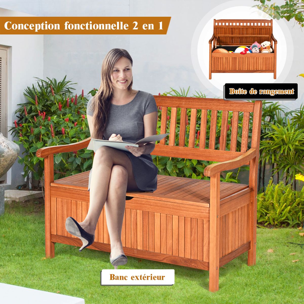This bench features ample storage space, perfect for storing blankets, cushions, books, toys, and more. Made of acacia wood, its sturdy structure boasts a strong load-bearing capacity. The spacious seat comfortably seats two people side-by-side. The slightly reclined backrest and wide armrests ensure comfortable seating and relaxation. The removable inner pocket makes it easy to clean. The storage compartments feature recessed handles for easy opening and closing. Its classic look and natural color make this bench a beautiful addition to your outdoor living space. Product Features: Solid Wood Construction: This practical bench is crafted from robust acacia wood, capable of supporting up to 360 kg. The bench structure is resistant to warping and breakage. The wood slats are waterproof and meticulously polished for a classic style. Ample Storage Space: A spacious storage compartment lies beneath the lid, perfect for storing blankets, pillows, books, and other items you desire. The lid features a recessed handle for easy lifting and closing. Removable Lining: Equipped with a zippered inner pocket, items stored in the compartments remain dry, even outdoors. The inner bag is made of breathable material, ensuring long-term storage without odor. The inner bag features a Velcro closure for easy disassembly and cleaning. Versatile: This bench combines seating and storage space. The spacious seat comfortably accommodates two people. Its elegant style suits various indoor and outdoor spaces, such as patios, patios, gardens, pool areas, living rooms, or anywhere else you need it. Easy to Assemble and Maintain: All necessary tools and detailed instructions are provided for quick and easy assembly. You can assemble it yourself. The smooth surface can be easily cleaned with a damp cloth. Product Features: Made of acacia wood for a sturdy structure; features a lid with a grooved handle; equipped with a durable internal storage bag; a slightly reclined backrest and curved armrests provide comfortable rest; the natural teak color adds an elegant, exotic touch to your home d��cor. Create comfortable seating and ample storage space at home or on your patio; add a beautiful touch to indoor or outdoor spaces; easy to assemble simply by following the instructions. Specifications: Color: Natural wood; Material: Acacia wood; Dimensions: 107 x 59 x 90 cm (L x W x H); Internal dimensions: 97 x 30.5 x 38 cm (L x W x H); Load capacity: 360 kg; Net weight: 19.8 kg. Package includes: 1 x Garden bench with storage; 1 x Instruction manual.