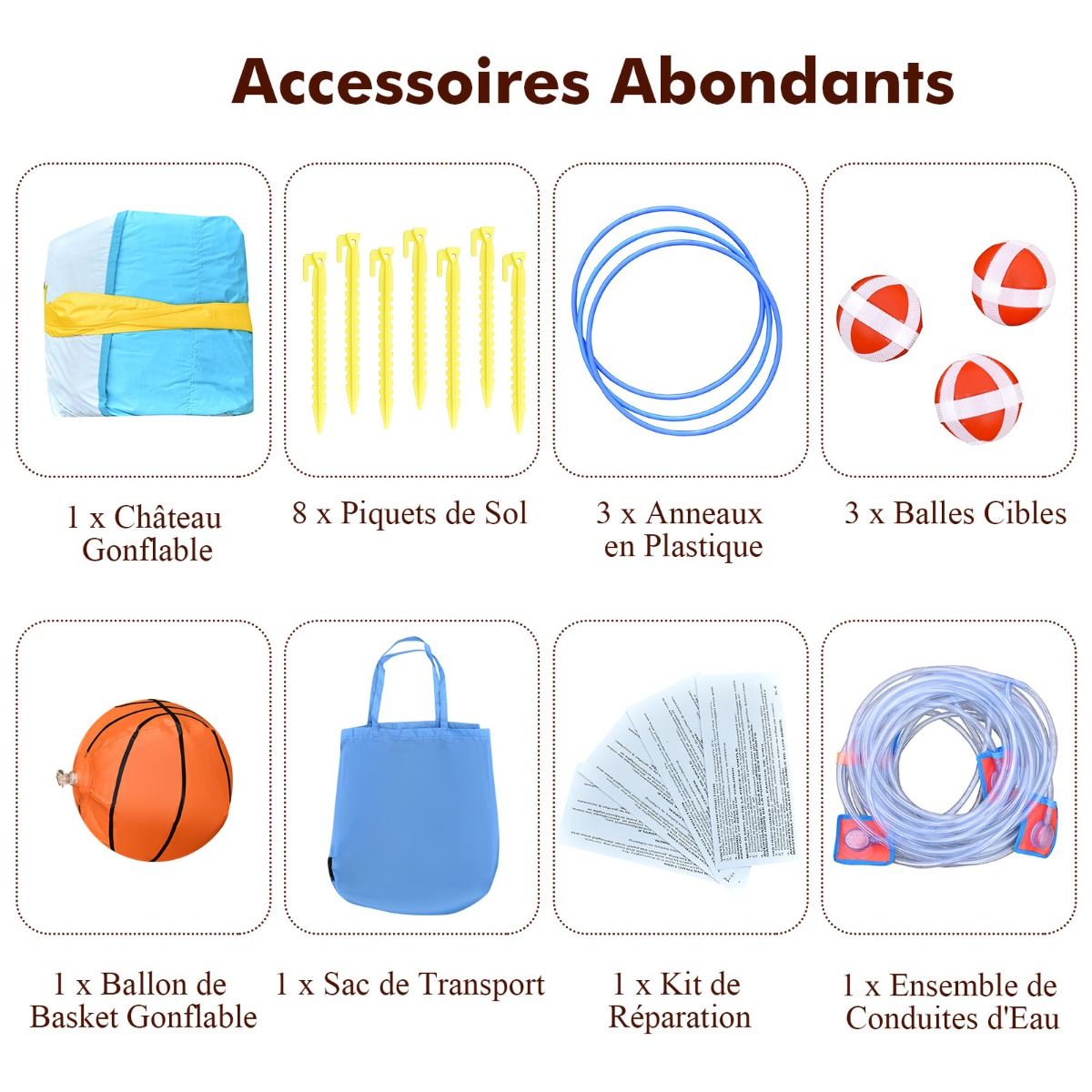 Our brightly colored inflatable water house, complete with fun games, is sure to be the talk of the town! It includes a variety of children's favorite games, such as an inflatable castle, basketball hoop, water gun, and two slides, allowing kids to make new friends. Three plastic rings, three target balls, and an inflatable basketball provide even more fun. This inflatable water slide is made of Oxford cloth, making it puncture-resistant and durable. The mesh walls offer both breathability and protection, creating a comfortable and safe play environment. Notably, the unique deflation tube design allows you to easily deflate the basketball in just a few minutes. A portable storage bag makes it easy to quickly store all the accessories and prevent loss. Key Features: Multiple Play Areas This inflatable trampoline comes with two slides, a trampoline, a basketball hoop, a water gun, a climbing wall, a target launcher, a ring toss game, and a water gun. The excellent play areas allow your child to jump, slide, climb, and throw to their heart's content, enjoying hours of non-stop fun. Puncture-resistant material and safe design: This inflatable trampoline is made of durable Oxford cloth, offering high strength and resilience. Notably, both the trampoline and slide are equipped with safety netting at the top for added safety for children. Abundant accessories: Includes 3 target balls, allowing you and your friends to immediately start a thrilling throwing game. Additionally, the included target balls, target balloons, and inflatable basketball provide even more fun for your child. A necessary repair kit is also included to extend its lifespan. User-friendly design: The water slide can be securely fixed to an outdoor lawn using 8 pegs. A unique deflation tube allows for deflation in seconds. Afterwards, you can easily store the children's inflatable castle and other accessories in the included storage bag. Perfect gift for children: This inflatable castle is suitable for children aged 3 to 10 and can accommodate up to 3 people. This product can be used for jumping and sliding, making it ideal for physical exercise and providing children with hours of fun. It's perfect as a children's gift or as entertainment for parties or festivals. Product features: Connect the included water hose to use it as a water park. Includes a slide, trampoline, basketball, water gun, climbing wall, and ball thrower. A safety net prevents overcrowding and enhances safety. Made of puncture-resistant Oxford cloth for durability. Ground pegs enhance stability. Includes 3 balls, 3 target balls, and an inflatable basketball, suitable for both boys and girls. Easy to assemble and disassemble in minutes. Comes with a carrying bag for convenient transport. A repair kit makes maintenance easier. Product Specifications: Colors: Multi-color; Material: Oxford cloth; Product Dimensions: 503 x 290 x 216 cm (L x W x H); Net Weight: 19.5 kg. Recommended Age: 3-10 years; Maximum Number of Children Allowed: 3; Maximum Weight Capacity: 135 kg; Maximum Individual Weight: 45 kg; Recommended Blower Power: 680 watts (not included); Package Includes: 1 inflatable house, 8 ground pegs, 3 plastic rings, 3 targets, 1 inflatable basketball, 1 storage bag, 1 repair kit, 1 set of hoses.