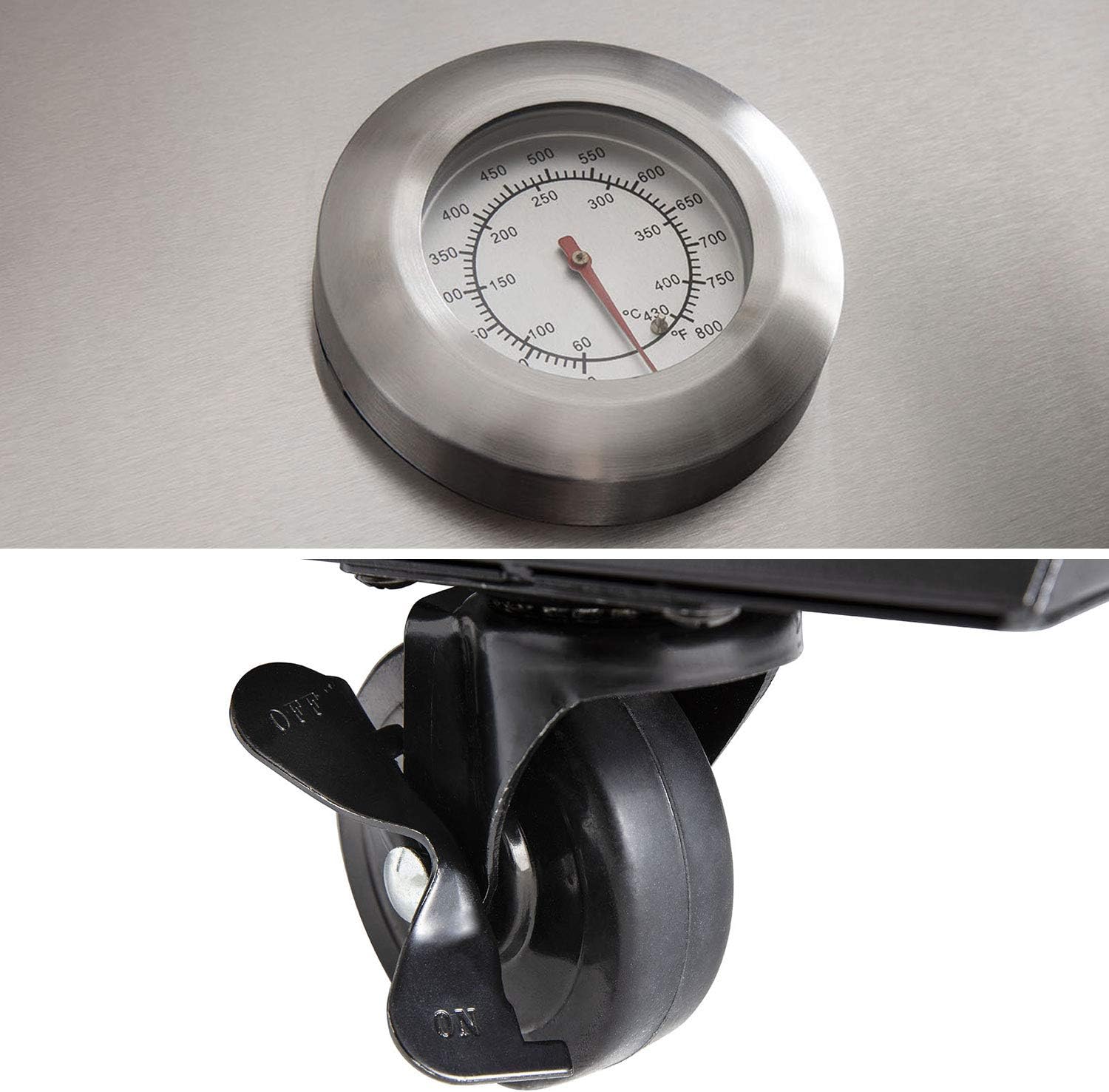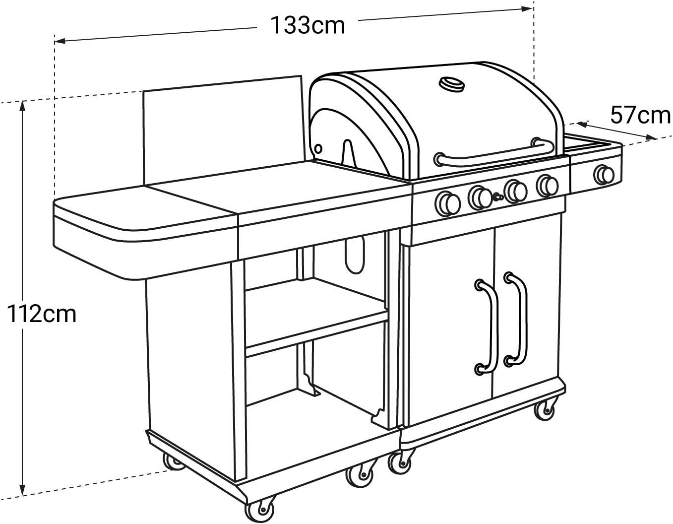 This gas grill comes with a side table, allowing you to enjoy outdoor cooking. Dimensions: Grill: 133cm (L) * 57cm (W) * 112cm (H); Side table: 60cm (L) * 51.5cm (W) * 108cm (H). Materials: Grill: Enameled cast iron and stainless steel; Side table: Metal and stainless steel. Colors: Grill: Black and stainless steel; Side table: Black and silver. Self-assembly required (instructions included); 2-year warranty; delivered in two packages. Product Description: This gas grill set includes a gas grill and a side table, allowing you to rediscover the joy of grilling. In summer, you can use this four-burner gas grill (including one side burner) to cook grilled meats and grilled vegetables. The side table can be used as a preparation table or work surface, and you can also combine this set with other products in the FIDGI range. Detailed Information: Dimensions: - Overall: 193 cm (L) * 57 cm (W) * 112 cm (H) - Grill Area: 133 cm (L) * 57 cm (W) * 112 cm (H) - Cooking Area: 70 cm (L) * 42 cm (W) - Side Table: 60 cm (L) * 51.5 cm (W) * 108 cm (H) - Worktop: 60 cm (L) * 45.5 cm (W) Material: - Frame: Metal - Burner Lid and Warmer Rack: Stainless Steel - Grill and Frying Pan: Enameled Cast Iron - Firebox: Painted Steel - Front Panel: Stainless Steel Color: - Frame and Cooking Area: Black - Front Panel and Burner: Stainless Steel - Side Table: Black and Silver Optional Accessories: - Piezoelectric Ignition - Lid with Thermometer - 4 Burners + 1 Side Burner - 2 Grills + 1 Warmer Rack - 1 Frying Pan - 2 Shelves - Baffle - 8 multi-directional casters with brakes. Other information: - Quantity of cutlery: 10 - Total power: 14.5kW - Maximum load capacity: 30kg (tabletop) / 15kg (shelf) - Gas type: Butane/Propane - Compatibility: FIDGI sink - Gas cylinder, hose, and regulator not included - Assembly required (instructions included)