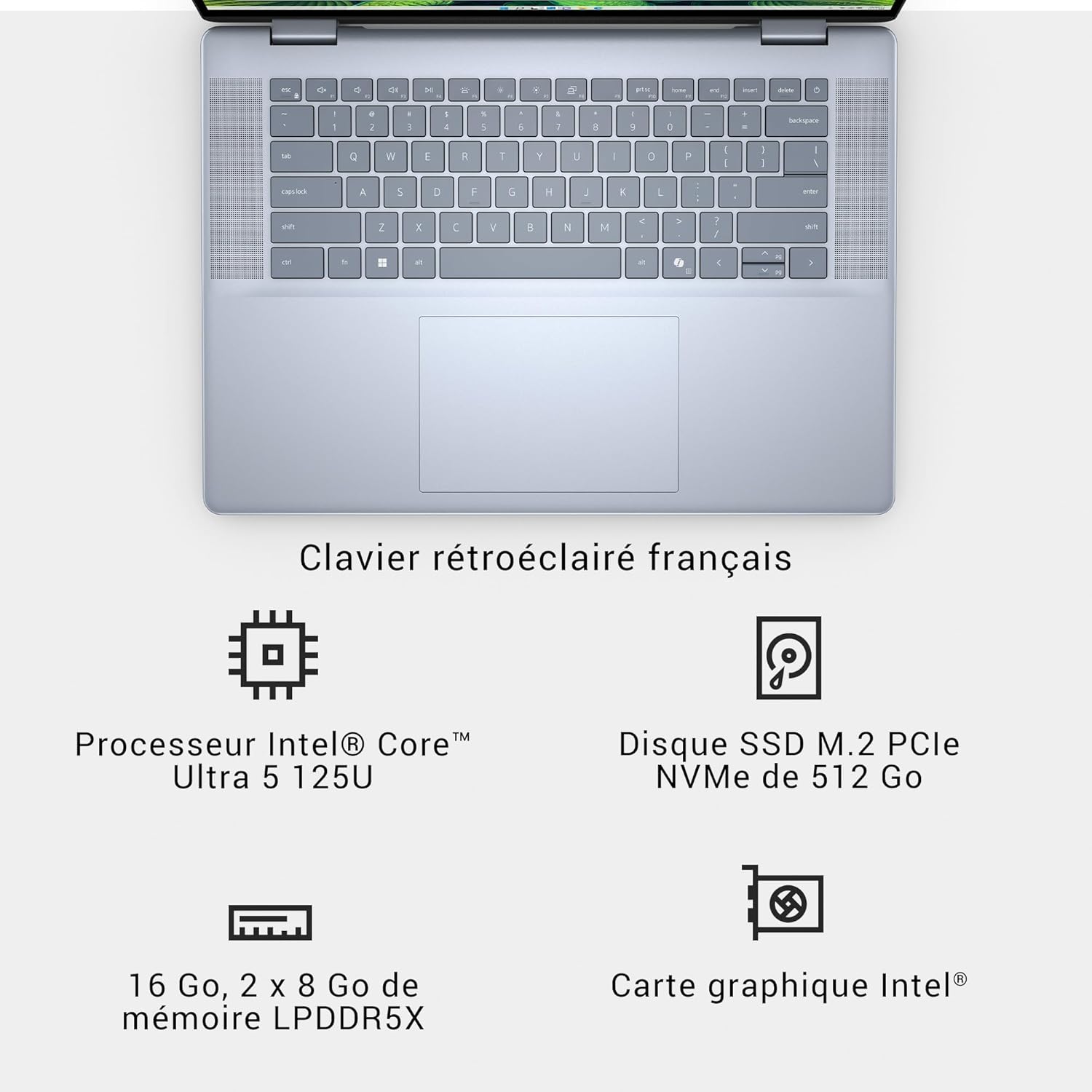• Dell Inspiron 16 2-in-1 Laptop with 16" FHD+ (1920 x 1200) Screen, Intel Core Ultra 5 Series 1, Intel Graphics, 16 GB RAM, 512 GB SSD, Windows 11 Home, Backlit AZERTY Keyboard, Blue