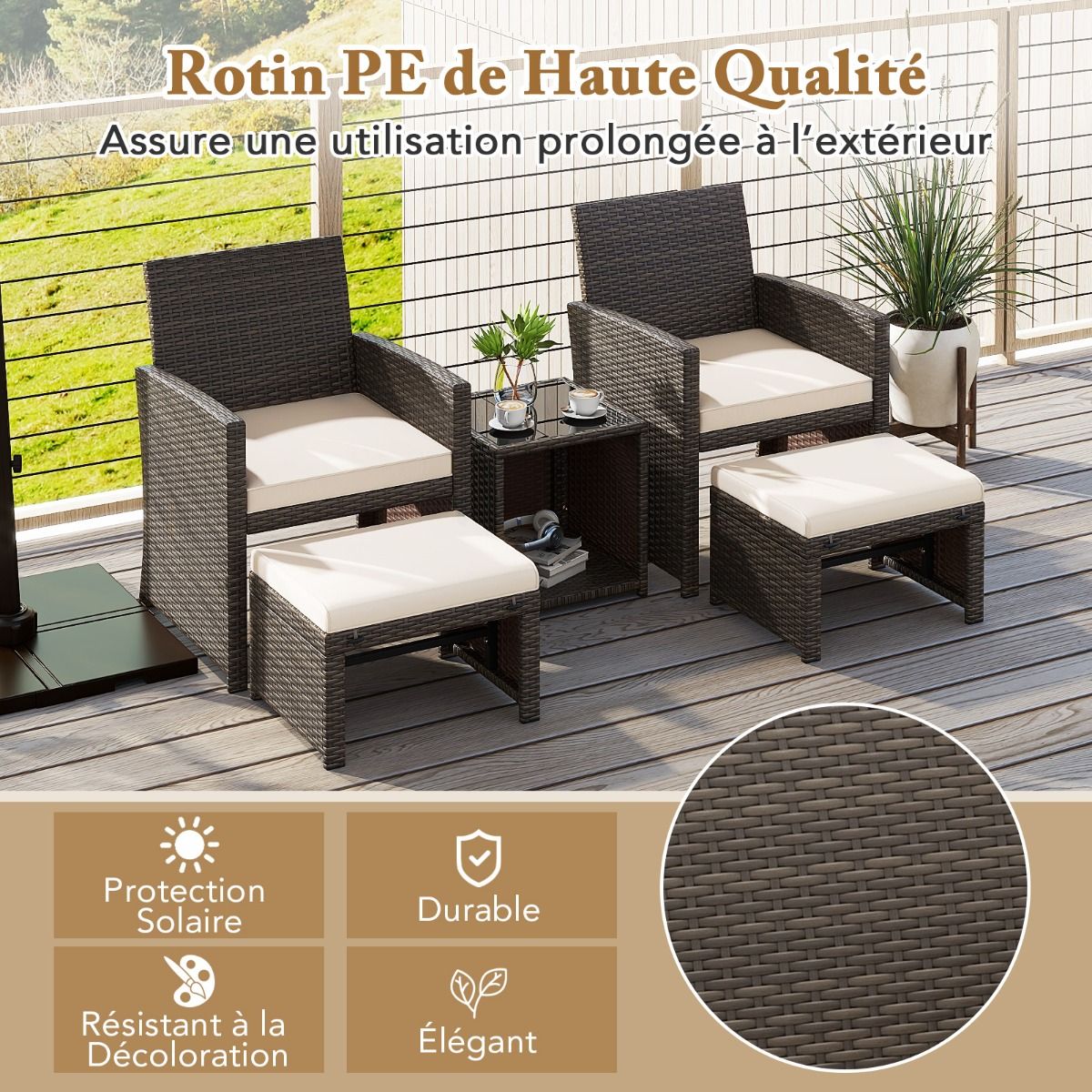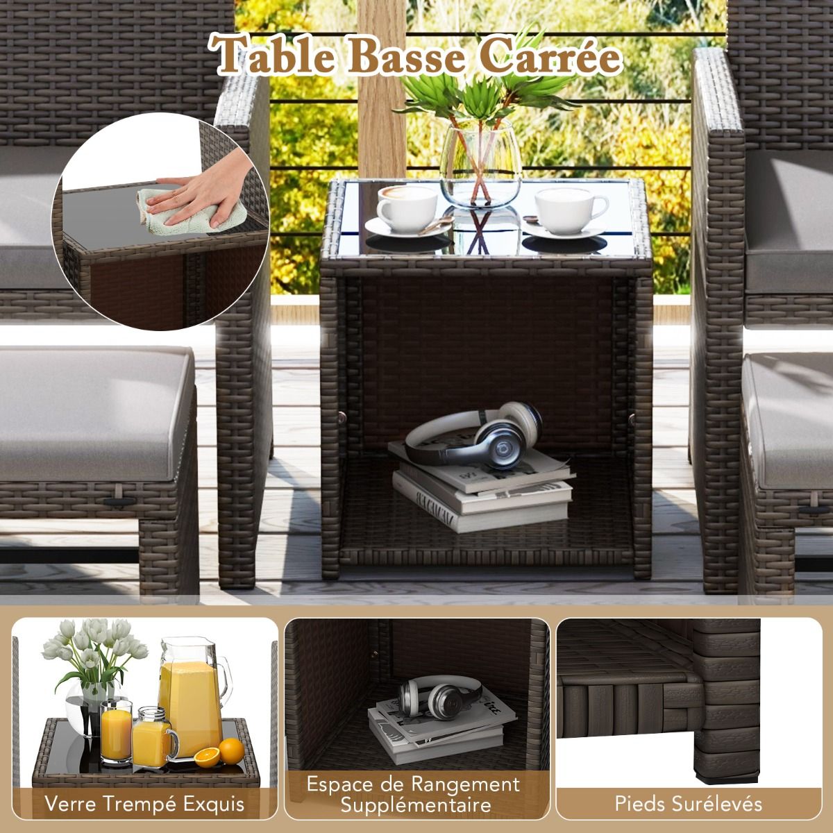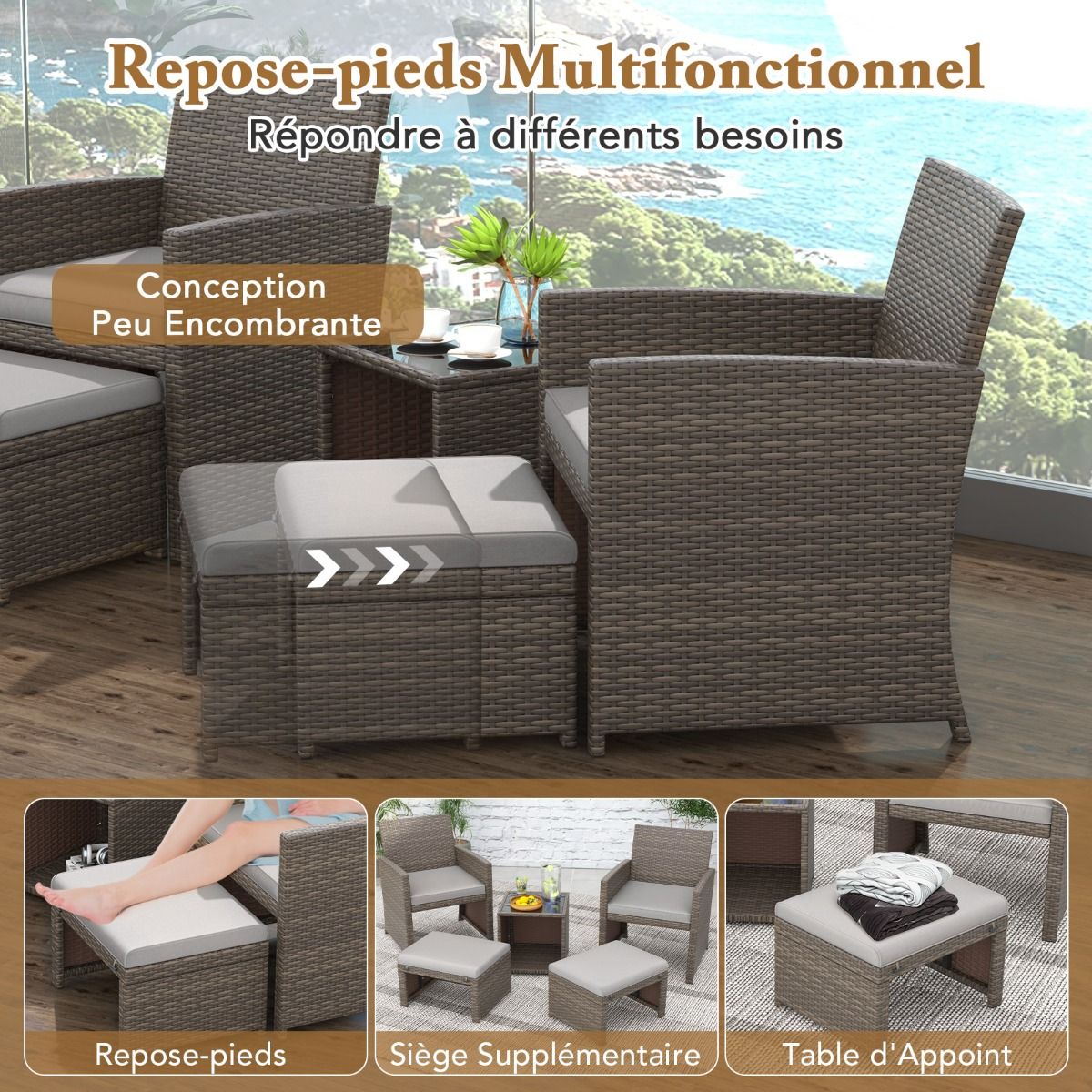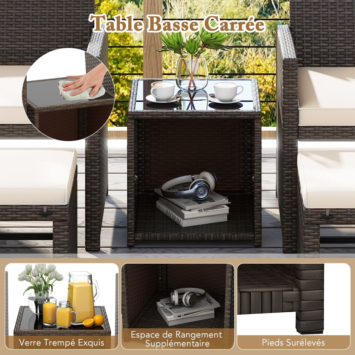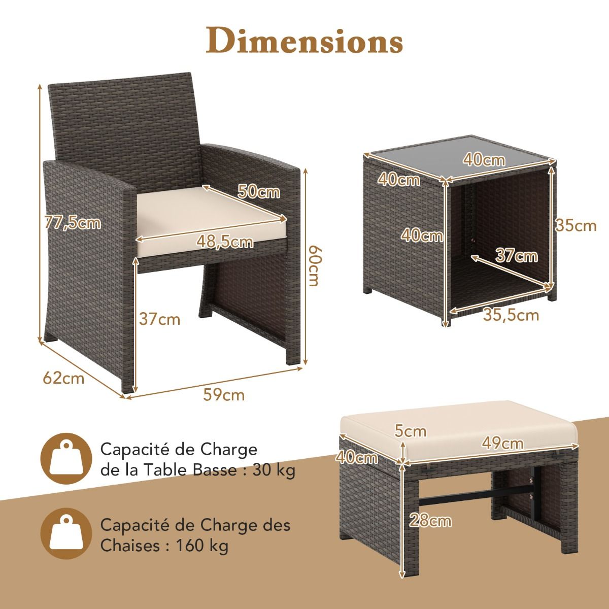 This five-piece PE rattan garden furniture set includes two armchairs, two ottomans, and a glass tabletop, allowing you to enjoy comfort during your leisure time. The armchairs and ottomans are supported by a steel frame and reinforced with an X-shaped structure, making this garden leisure furniture set weather-resistant and durable. Both the armchairs and ottomans are upholstered for comfortable seating. A zipper design makes it easy to remove and clean the seat covers. The glass tabletop and coffee table have spacious interiors, providing ample storage space. Product Features: Five-piece Rattan Garden Leisure Furniture Set Whether inviting friends over or enjoying a sunset with family, this five-piece rattan furniture set is ideal. The PE rattan is fade-resistant, ensuring long-lasting outdoor use. The X-shaped structure design enhances stability and load-bearing capacity. Comfortable Seating and Multifunctional Ottoman The backrest and armrests provide support for the body, maximizing comfort. The ottoman can be used as a stool or chair. When not in use, the ottoman can be stored under the chair to save space. Additionally, the ottoman can be placed on a durable tempered glass coffee table. This coffee table can be used to place cups and decorative plants. The unique box-shaped structure improves space utilization and provides more storage space. Both the chairs and footstools feature soft cushions filled with high-density foam for enhanced comfort and a more pleasant seating experience. Additionally, each cushion is equipped with a zipper for easy removal and cleaning. Product dimensions: Each armchair measures 59 x 53.5 x 77.5 cm (L x W x H), the coffee table measures 40 x 40 x 40 cm (L x W x H), and the footstool with cushions measures 49 x 40 x 33 cm (L x W x H). The coffee table has a weight capacity of 30 kg, and each chair and footstool has a weight capacity of 160 kg. Features: Weather-resistant PE rattan, colorfast and longer lifespan; cross-frame structure, sturdy and durable with strong load-bearing capacity; soft zippered seat cushion, comfortable and easy to remove; sturdy tempered glass tabletop, easy to clean; double-layer coffee table provides storage and display space; curved backrest perfectly conforms to the curve of the back, providing good support; multi-functional footstool, can be used as a chair and footstool; secure footstool connection prevents the seat cushion from slipping; each footstool can be placed under the chair, saving space. Suitable for a wide range of locations, such as swimming pools, patios, etc. H4 Specifications H4 Seat Cushion Color: Off-white Rattan Color: Brown Mixed Colors Material: PE Rattan + Sponge + Tempered Glass Armchair Dimensions: 59 x 53.5 x 77.5 cm (Length x Width x Height) Coffee Table Dimensions: 40 x 40 x 40 cm (Length x Width x Height) Total Set Dimensions (including seat cushion): 49 x 40 x 33 cm (Length x Width x Height) Net Weight: 17 kg Maximum Weight Capacity of Armchair: 160 kg Maximum Weight Capacity of Footstool: 160 kg Maximum Weight Capacity of Coffee Table: 30 kg Package Contents: 1 x Coffee Table 2 x Armchair 2 x Footstool 4 x Seat Cushions 1 x Instruction Manual