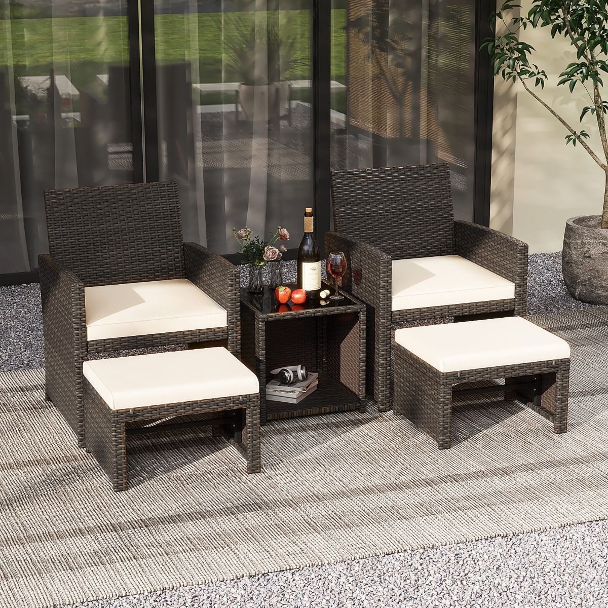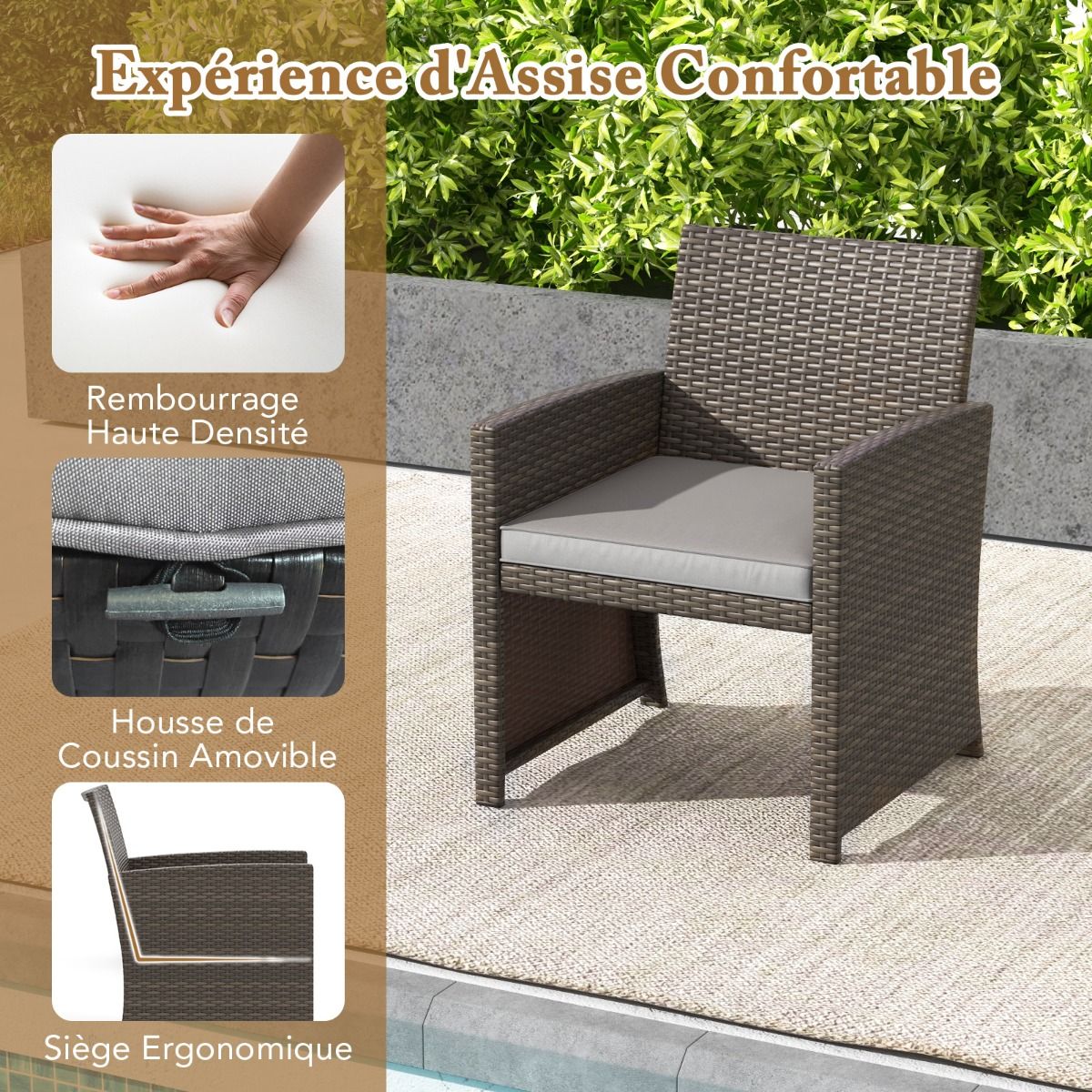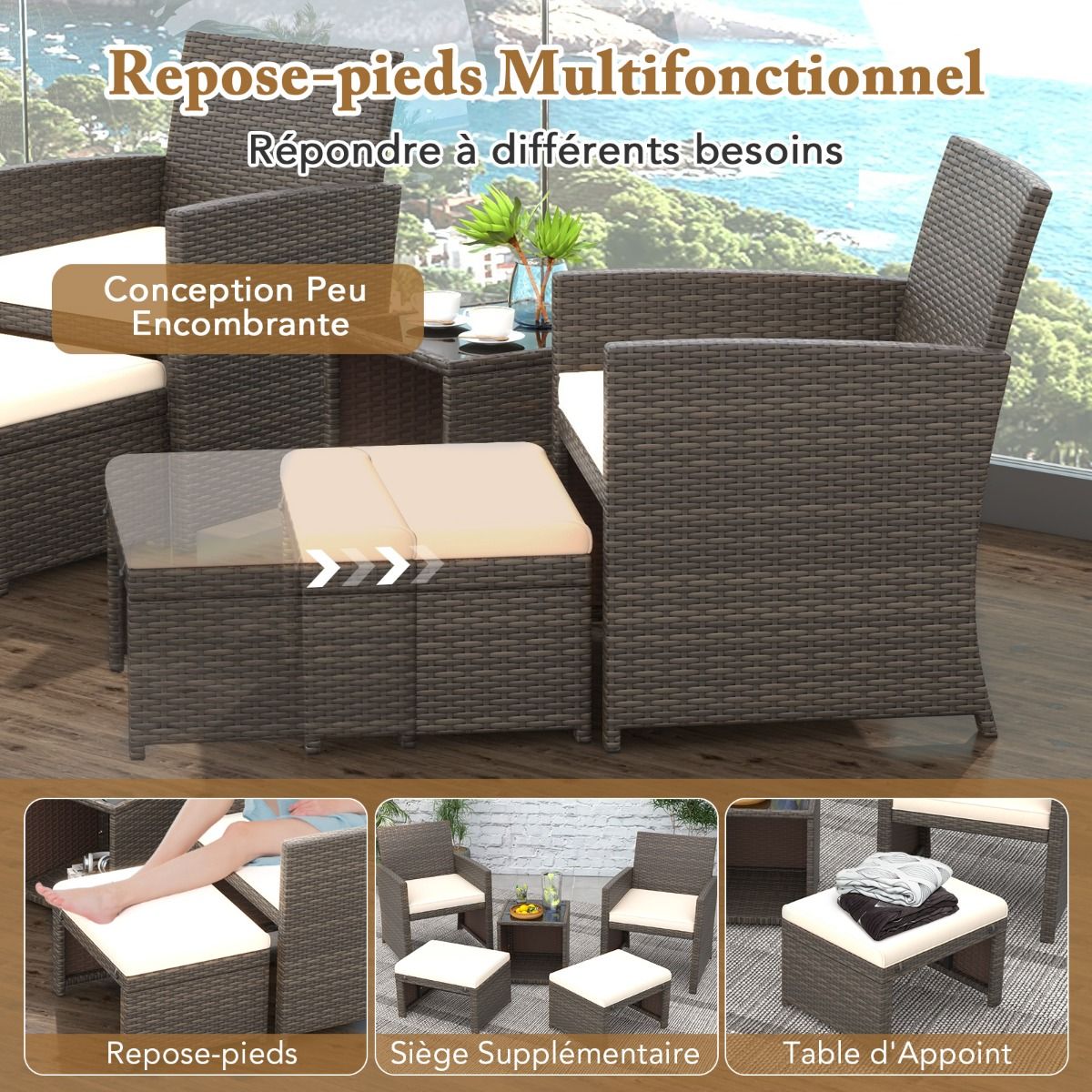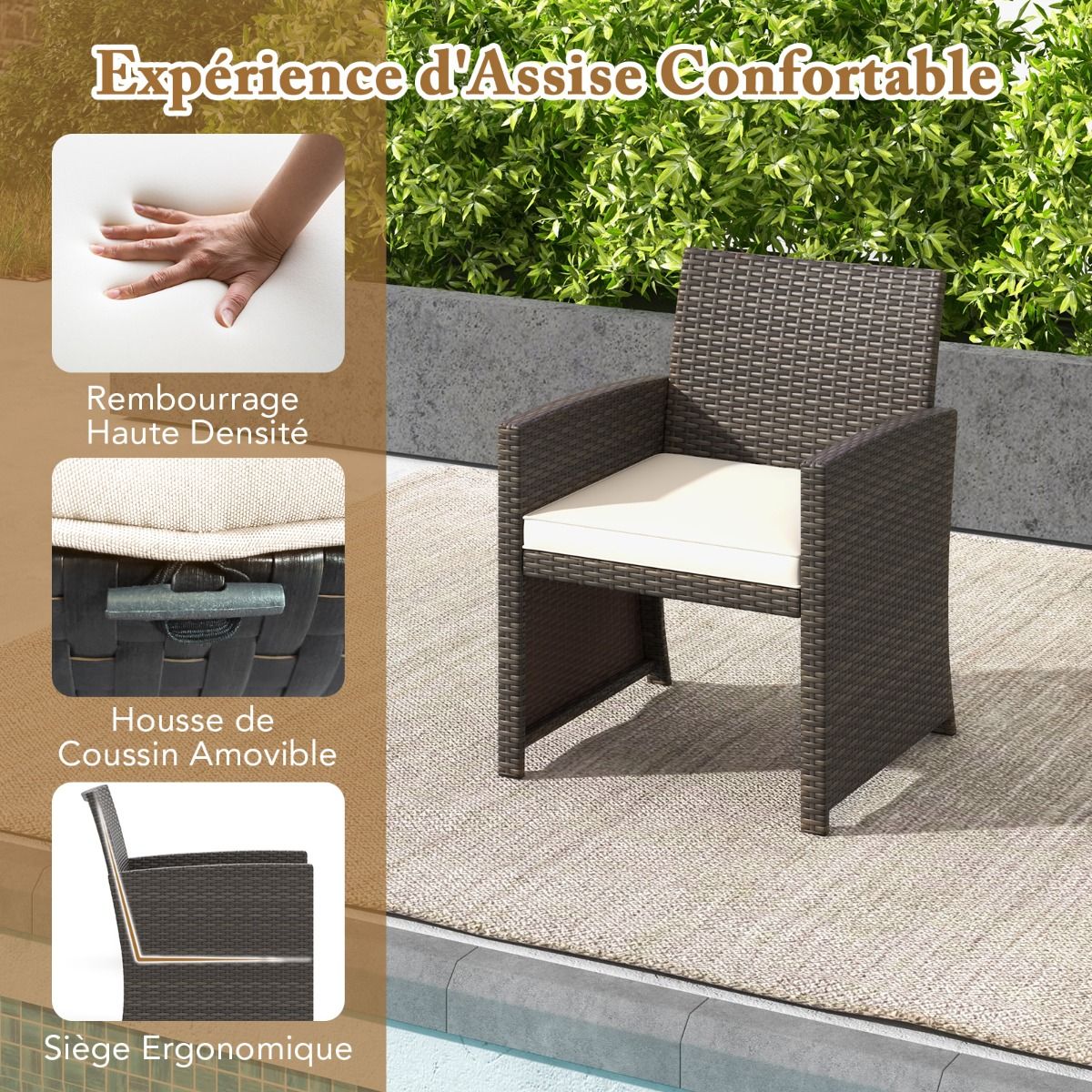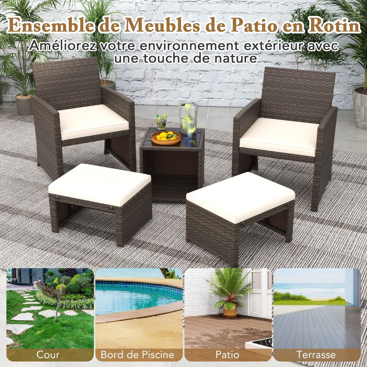 This five-piece PE rattan garden furniture set includes two armchairs, two ottomans, and a glass tabletop, allowing you to enjoy comfort during your leisure time. The armchairs and ottomans are supported by a steel frame and reinforced with an X-shaped structure, making this garden leisure furniture set weather-resistant and durable. Both the armchairs and ottomans are upholstered for comfortable seating. A zipper design makes it easy to remove and clean the seat covers. The glass tabletop and coffee table have spacious interiors, providing ample storage space. Product Features: Five-piece Rattan Garden Leisure Furniture Set Whether inviting friends over or enjoying a sunset with family, this five-piece rattan furniture set is ideal. The PE rattan is fade-resistant, ensuring long-lasting outdoor use. The X-shaped structure design enhances stability and load-bearing capacity. Comfortable Seating and Multifunctional Ottoman The backrest and armrests provide support for the body, maximizing comfort. The ottoman can be used as a stool or chair. When not in use, the ottoman can be stored under the chair to save space. Additionally, the ottoman can be placed on a durable tempered glass coffee table. This coffee table can be used to place cups and decorative plants. The unique box-shaped structure improves space utilization and provides more storage space. Both the chairs and footstools feature soft cushions filled with high-density foam for enhanced comfort and a more pleasant seating experience. Additionally, each cushion is equipped with a zipper for easy removal and cleaning. Product dimensions: Each armchair measures 59 x 53.5 x 77.5 cm (L x W x H), the coffee table measures 40 x 40 x 40 cm (L x W x H), and the footstool with cushions measures 49 x 40 x 33 cm (L x W x H). The coffee table has a weight capacity of 30 kg, and each chair and footstool has a weight capacity of 160 kg. Features: Weather-resistant PE rattan, colorfast and longer lifespan; cross-frame structure, sturdy and durable with strong load-bearing capacity; soft zippered seat cushion, comfortable and easy to remove; sturdy tempered glass tabletop, easy to clean; double-layer coffee table provides storage and display space; curved backrest perfectly conforms to the curve of the back, providing good support; multi-functional footstool, can be used as a chair and footstool; secure footstool connection prevents the seat cushion from slipping; each footstool can be placed under the chair, saving space. Suitable for a wide range of locations, such as swimming pools, patios, etc. H4 Specifications H4 Seat Cushion Color: Off-white Rattan Color: Brown Mixed Colors Material: PE Rattan + Sponge + Tempered Glass Armchair Dimensions: 59 x 53.5 x 77.5 cm (Length x Width x Height) Coffee Table Dimensions: 40 x 40 x 40 cm (Length x Width x Height) Total Set Dimensions (including seat cushion): 49 x 40 x 33 cm (Length x Width x Height) Net Weight: 17 kg Maximum Weight Capacity of Armchair: 160 kg Maximum Weight Capacity of Footstool: 160 kg Maximum Weight Capacity of Coffee Table: 30 kg Package Contents: 1 x Coffee Table 2 x Armchair 2 x Footstool 4 x Seat Cushions 1 x Instruction Manual
