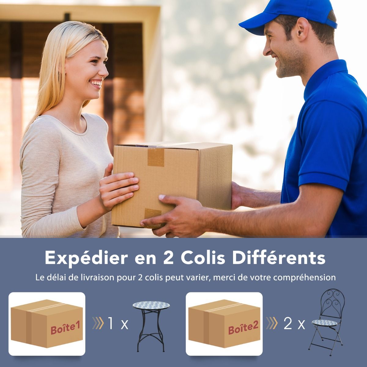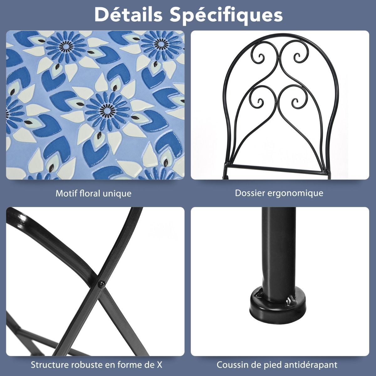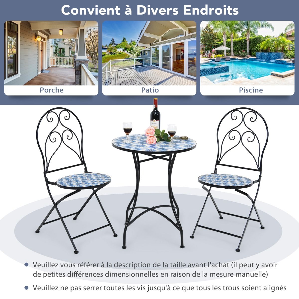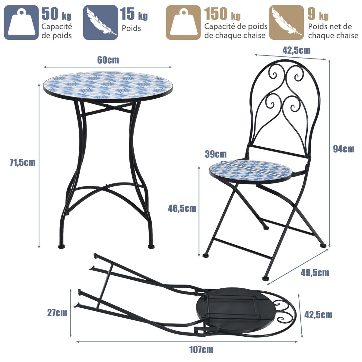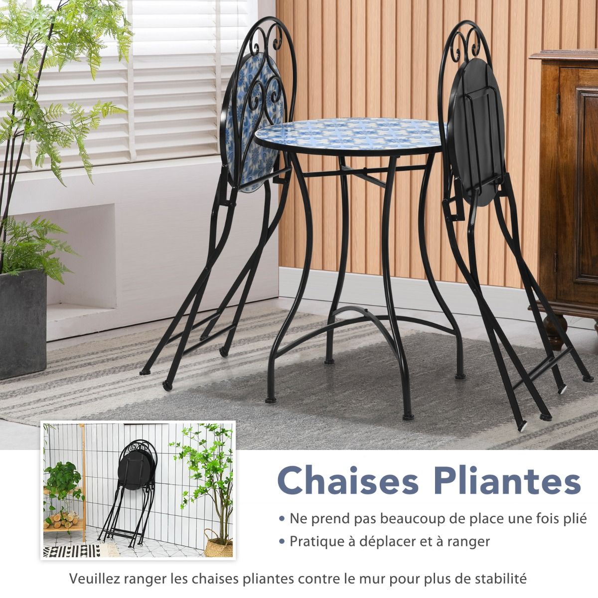 This beautiful three-piece patio table and chair set will be the focal point of your outdoor space! The unique mosaic design paired with a lovely floral pattern makes this outdoor lounge set more appealing than other patio sets, perfectly complementing your outdoor style. Furthermore, the sturdy X-frame, non-slip feet, and durable tiles ensure high stability and longevity. Ergonomic backrests provide comfortable seating. When the weather is cold, the two comfortable chairs can be folded up for easy storage and space saving. Features: Sturdy three-piece patio table and chair set. This outdoor table and chair set includes a round table and two ergonomic chairs, creating the perfect lounge space for you and your family and friends. The round tabletop provides ample space for various items. Comfortable, foldable chairs. These well-crafted chairs feature ergonomic backrests and comfortable seats, ensuring comfort even during long periods of sitting. Meanwhile, the circular pattern on the backrests adds a touch of style. When not in use, the foldable chairs save space for other outdoor activities and are easy to move and store. Durable: This three-piece outdoor dining and chair set features a sturdy iron frame that can withstand various weather conditions. Non-slip chair legs prevent scratches and provide excellent stability. The tiled surface is easy to clean. Unique Mosaic Design: To add a touch of style to your outdoor space, this outdoor dining and chair set features a unique mosaic design adorned with a beautiful floral pattern, making it visually appealing. Therefore, wherever you place this three-piece set, it will bring a fresh feel to your space. Shipping Information: The three-piece outdoor dining and chair set is shipped in two separate boxes and may arrive in batches. Thank you for your patience. Weight capacity per chair: 150 kg; Table weight capacity: 50 kg. This three-piece outdoor dining and chair set is shipped in two separate boxes. Delivery time may vary depending on the package. The ideal place to relax outdoors with your loved ones. The sturdy tabletop firmly supports various personal items. The ergonomic design provides optimal comfort. The two folding chairs save outdoor space and are easy to store. Anti-slip mats protect the floor and provide high stability. The durable tile surface is easy to clean. The unique mosaic design, adorned with exquisite floral patterns, is both beautiful and elegant. Add a touch of elegance to your porch, patio, balcony, pool area, etc. The chairs require no assembly; only the table needs to be assembled. Specifications: h4; Frame color: black; Material: steel, cement, ceramic tile; Dimensions of each chair unfolded: 49.5 x 42.5 x 934 cm (L x W x H); Dimensions of each chair folded: 107 x 42.5 x 27 cm (L x W x H); Overall dimensions of the table: 60 x 71.5 cm (D x H); Net weight of each chair: 9 kg; Net weight of the table; Load capacity of each chair: 14.8 kg; Load capacity of each table: 150 kg; Load capacity of the table: 50 kg; Package includes: 1 table; 2 chairs; 1 assembly instruction booklet;