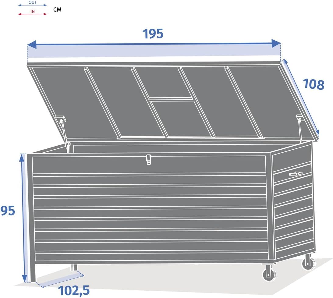 About this item: "Menango" Graphite Storage Box 195 x 96 x 108 cm in Epoxy-Coated Aluminum. Discreetly store your garden belongings with the "Menango" storage box from Hesperide. For a well-optimized outdoor space: The "Menango" storage box features an epoxy-coated aluminum frame. This ensures your belongings will remain in perfect condition throughout the summer. The casters and side handles allow you to move your storage unit effortlessly. Excellent weatherproofing: The "Menango" storage box will effectively protect your equipment from moisture. Its generous dimensions allow you to store outdoor cushions and your summer essentials. During heavy rain, store your Hesperide garden furniture cushions in the box. Dimensions: W 195 x D 96 x H 108 cm Weight: 36 kg Main material: Aluminum Frame material: Aluminum Cover material: Woven synthetic resin Capacity: 1500 liters Instructions included: Yes Number of packages: 1