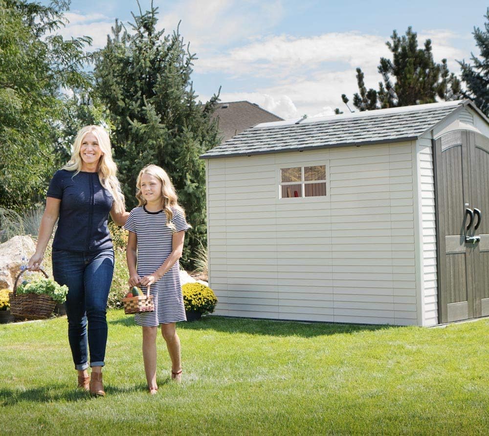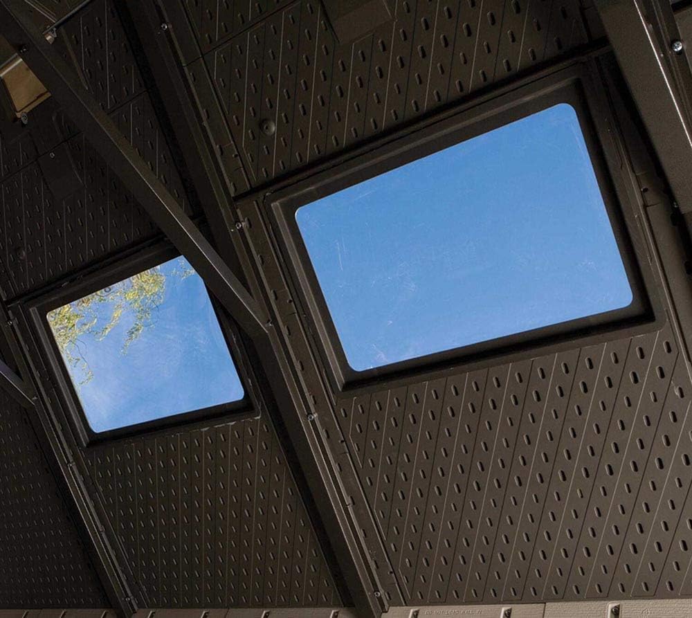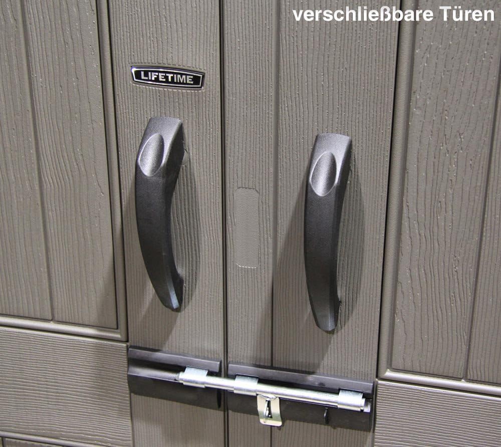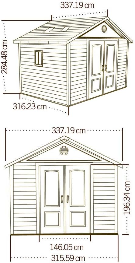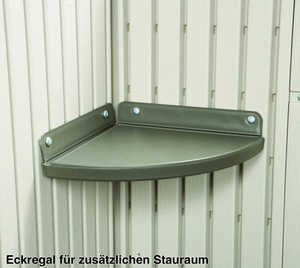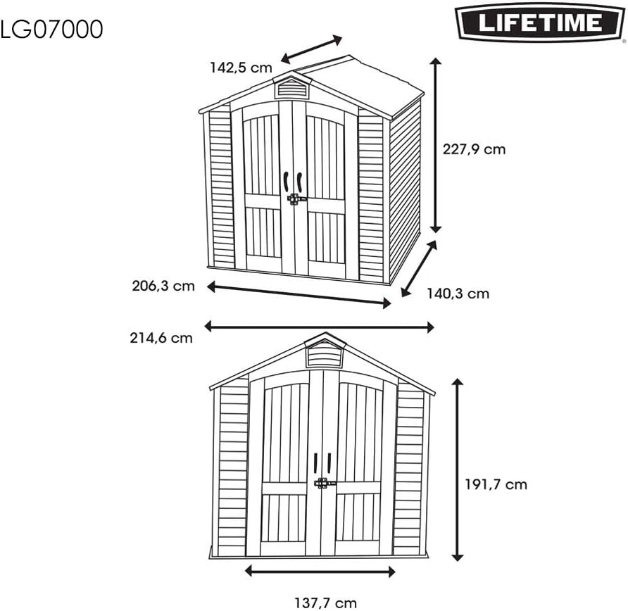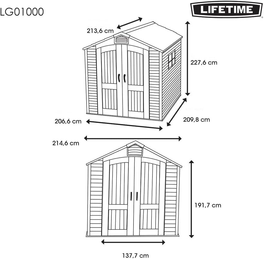 Lifetime Garden Shed 2.13 x 1.37 m = 2.92 m2. Equipped with a large skylight (1), ventilation openings (2), a 76 x 25 cm shelf (1), and corner shelves (2). Floor and assembly hardware included. Delivered in two packages.