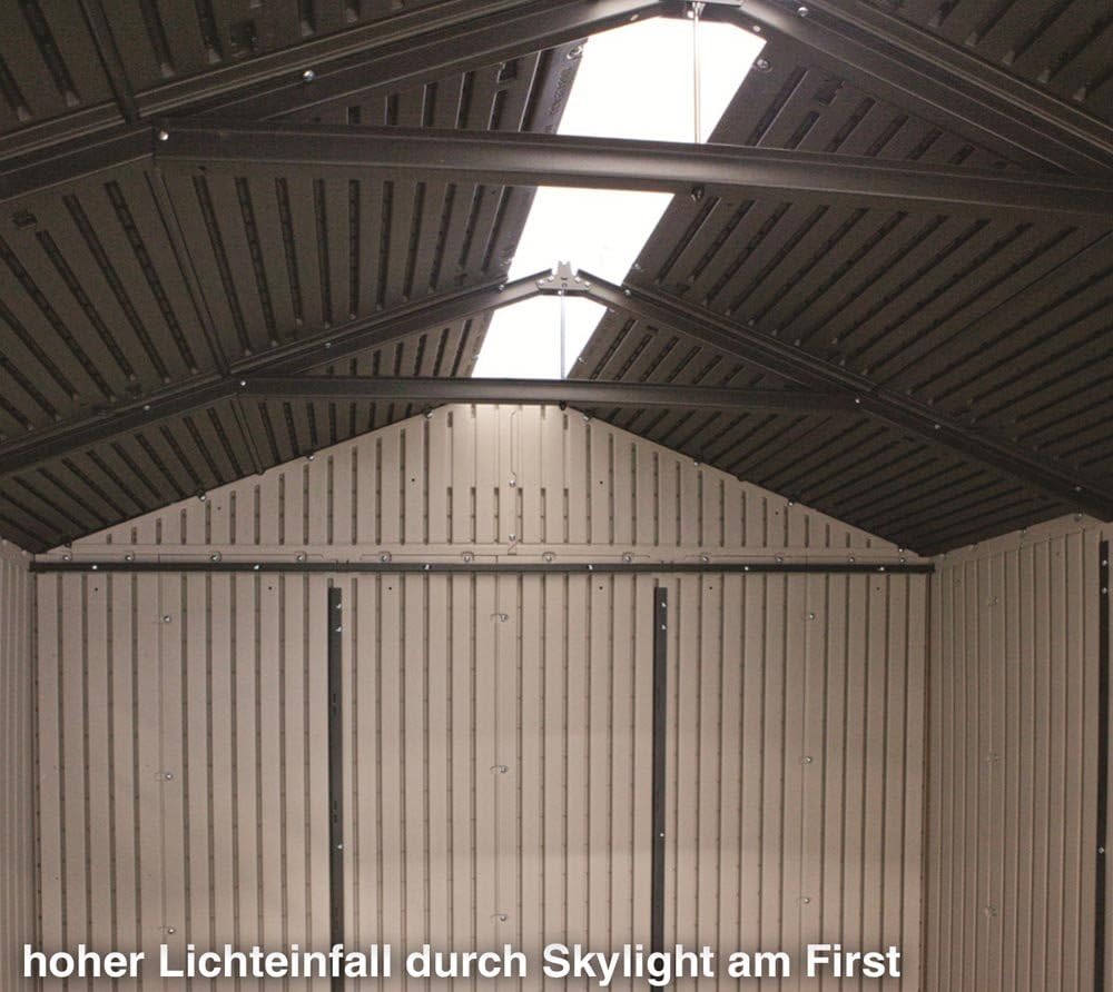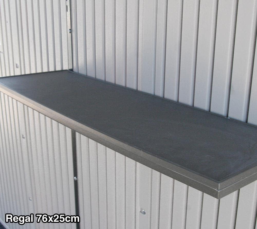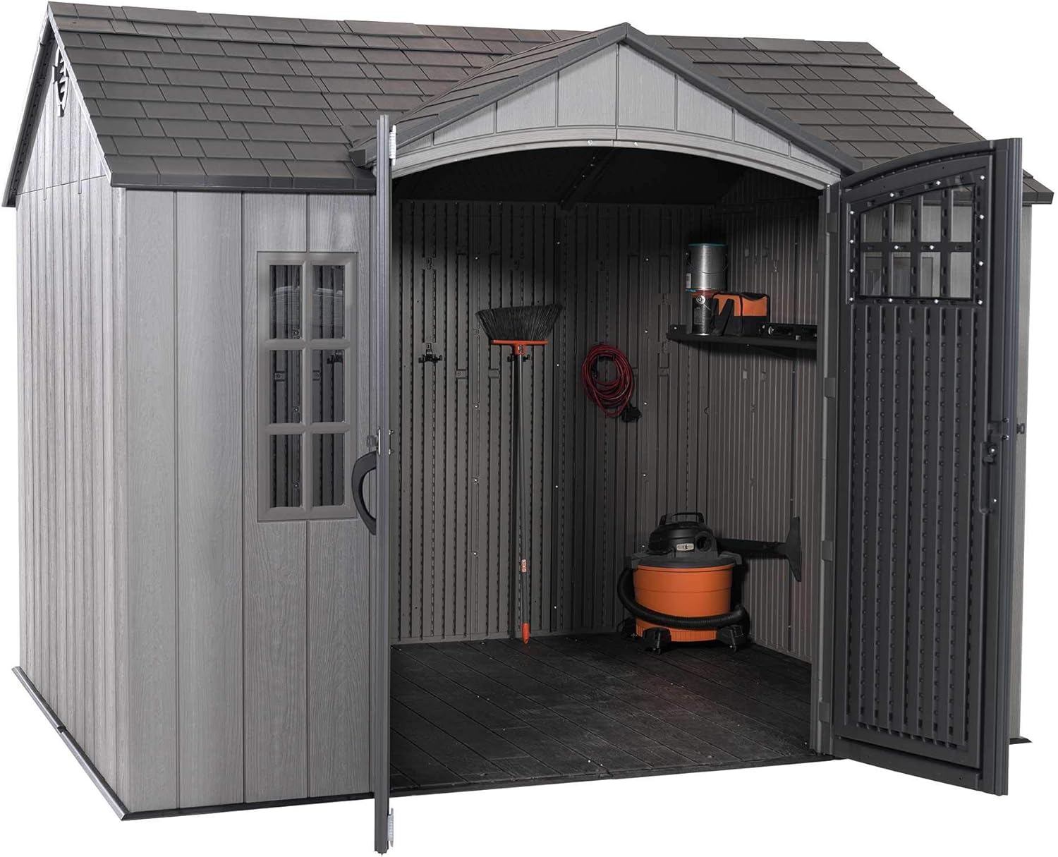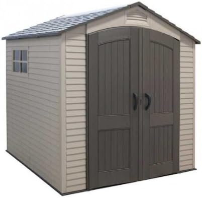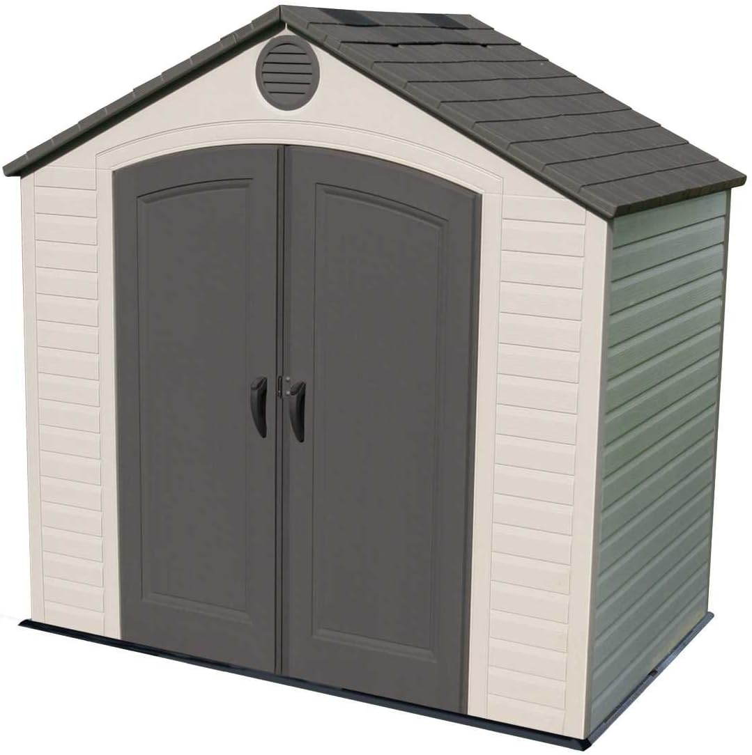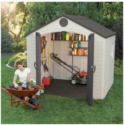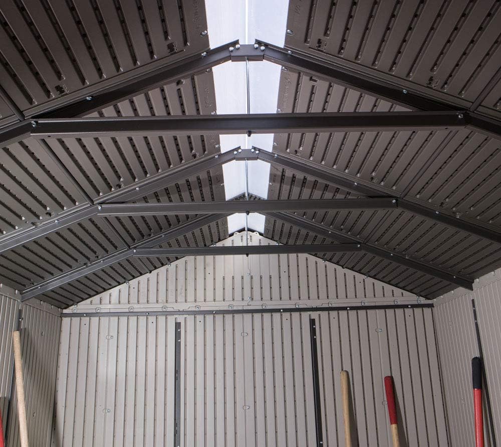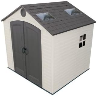 Lifetime Garden Shed 2.13 x 1.37 m = 2.92 m2. Equipped with a large skylight (1), ventilation openings (2), a 76 x 25 cm shelf (1), and corner shelves (2). Floor and assembly hardware included. Delivered in two packages.