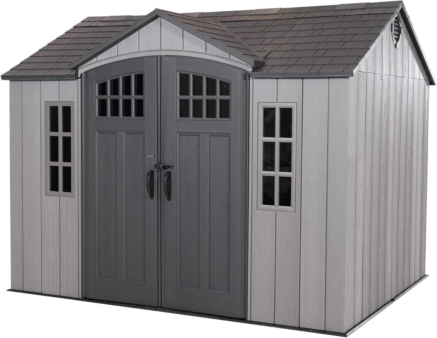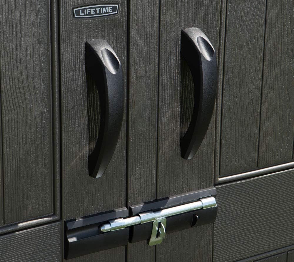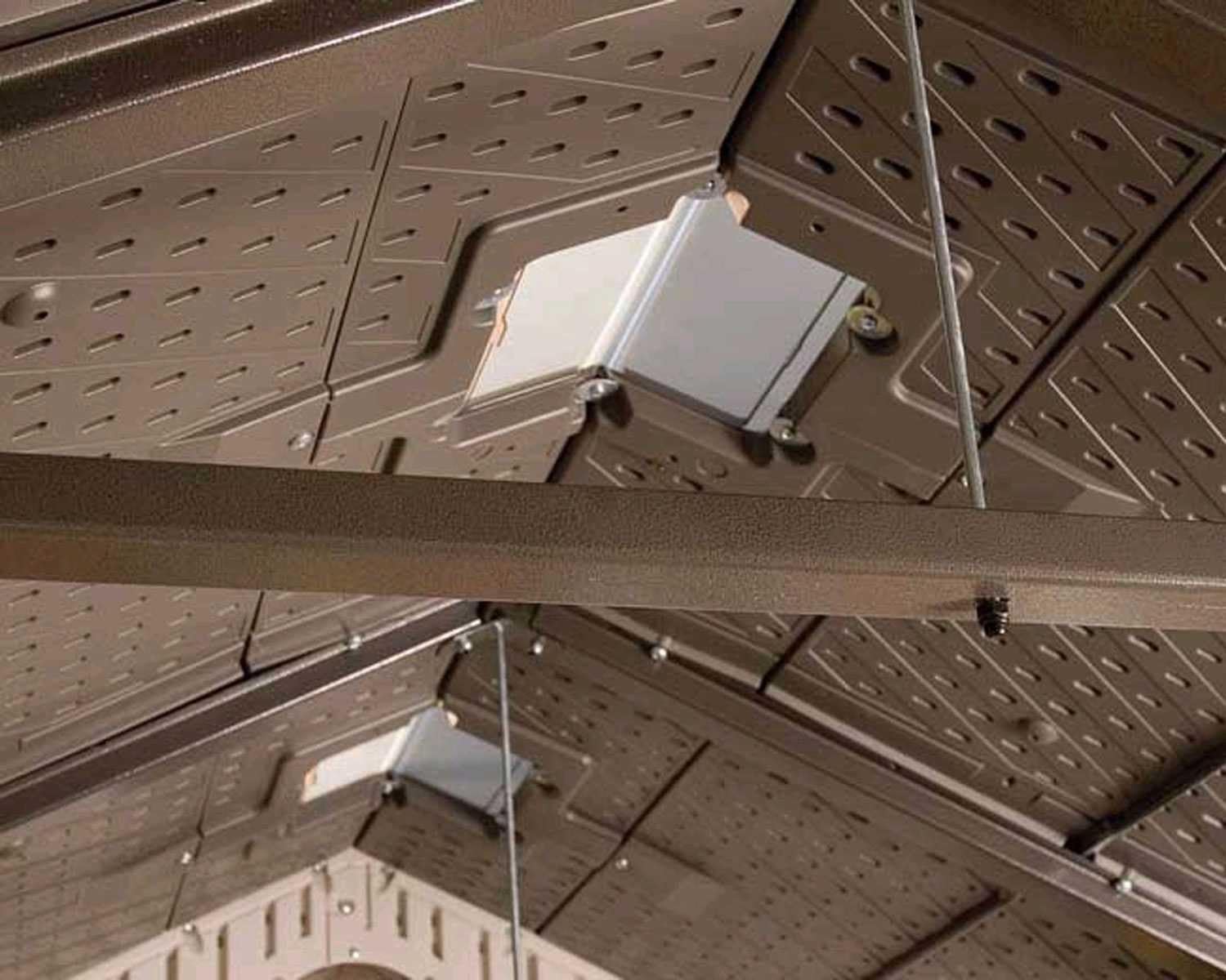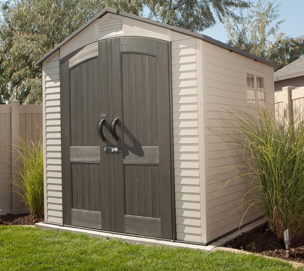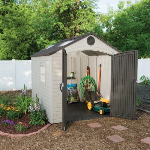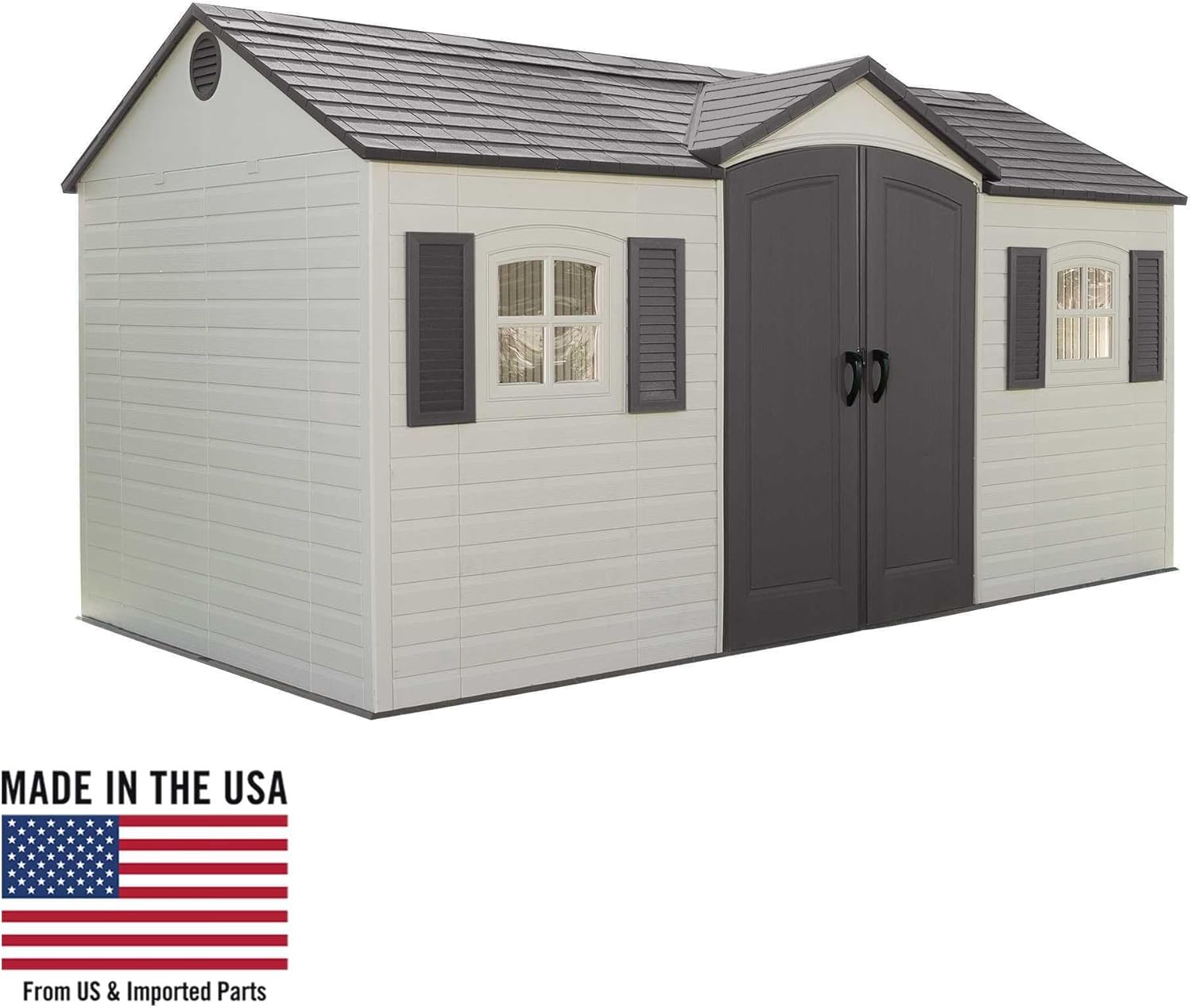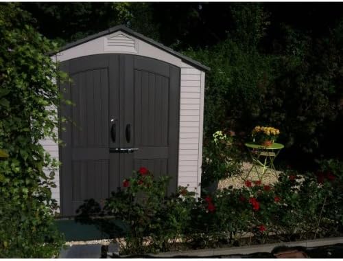 Lifetime Garden Shed 2.13 x 1.37 m = 2.92 m2. Equipped with a large skylight (1), ventilation openings (2), a 76 x 25 cm shelf (1), and corner shelves (2). Floor and assembly hardware included. Delivered in two packages.