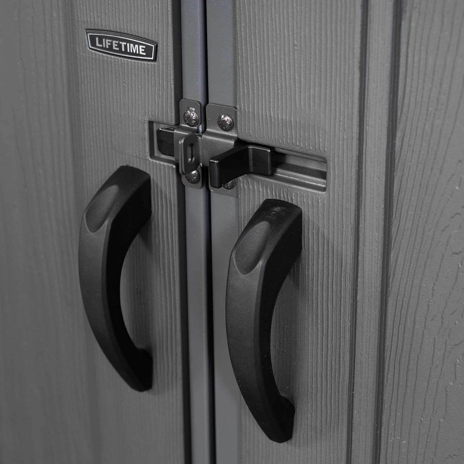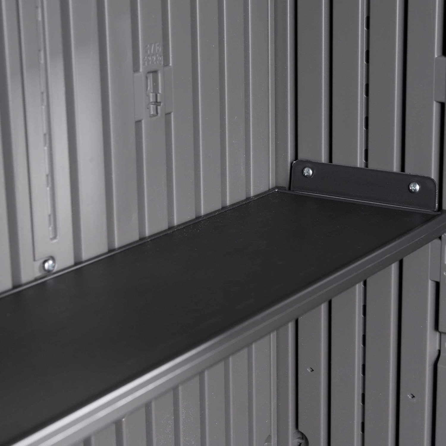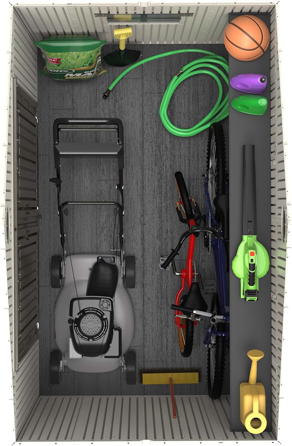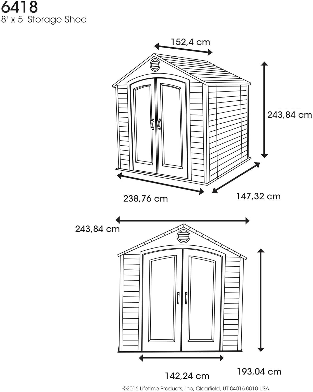 Lifetime Garden Shed 2.13 x 1.37 m = 2.92 m2. Equipped with a large skylight (1), ventilation openings (2), a 76 x 25 cm shelf (1), and corner shelves (2). Floor and assembly hardware included. Delivered in two packages.
