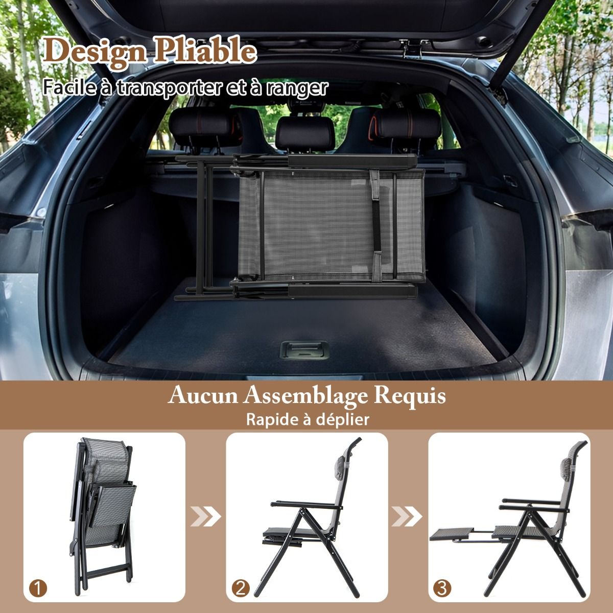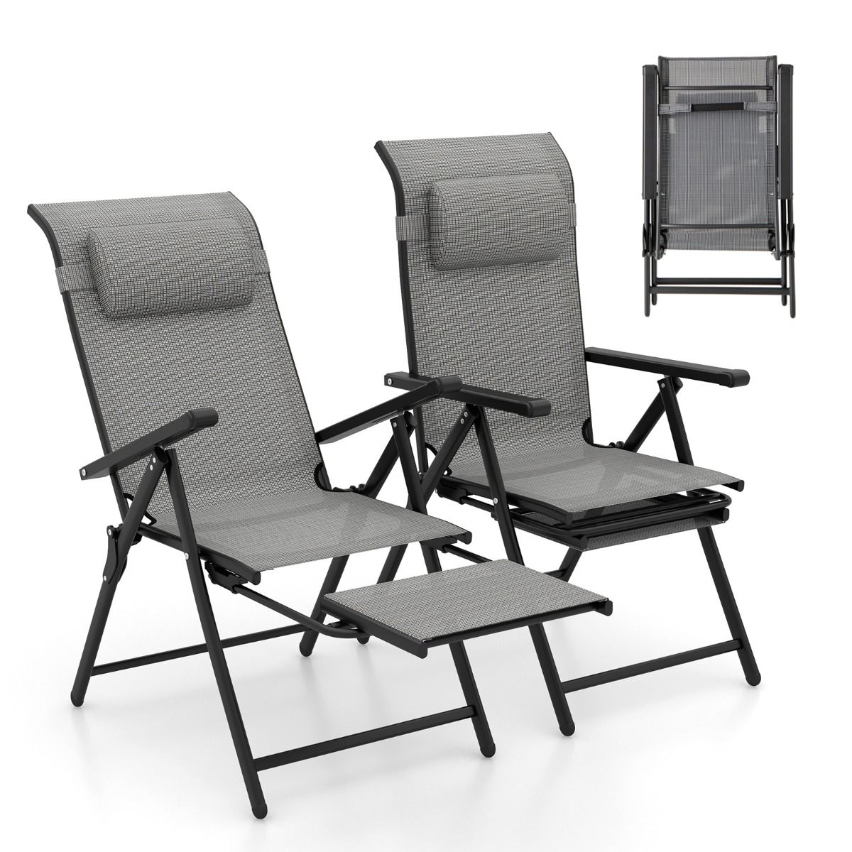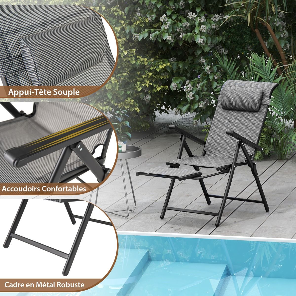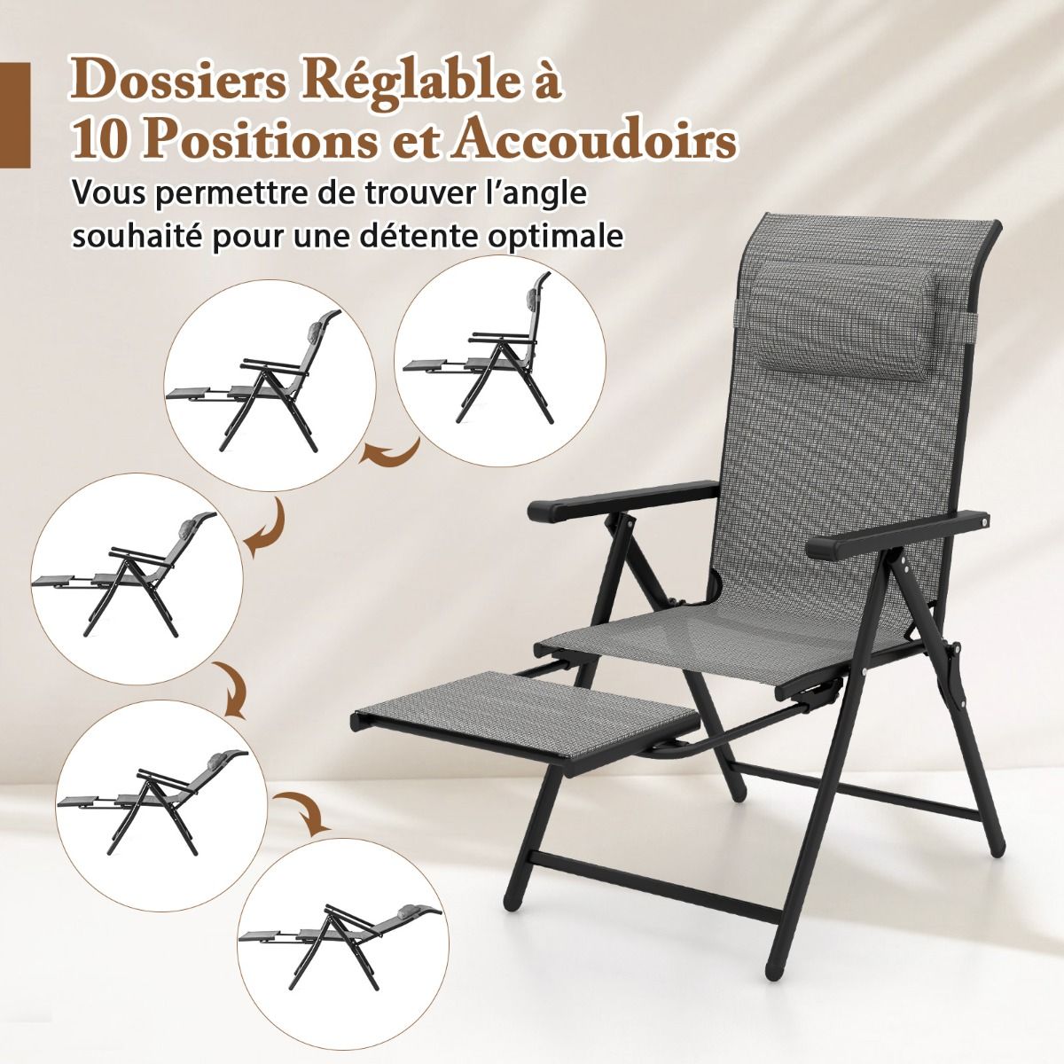 Our two-fold outdoor lounge chair set is designed for a comfortable seating experience, with adjustable backrests and armrests allowing you to easily find your ideal sitting position. A sturdy metal frame ensures the chair's stability and support. A retractable footrest provides extra comfort and support for your legs and folds away under the chair to save space. Made with breathable, quick-drying fabric, the chairs are ideal for your patio, garden, poolside, or outdoor adventures. Product Features: 10 Adjustable Comfort Levels This outdoor lounge chair features 10 adjustable backrests and armrests, allowing you to find your most comfortable relaxation angle. Whether you're reading, sunbathing, or relaxing, multiple sitting and reclining positions can meet your different needs. Retractable Ergonomic Footrest This folding patio chair features a retractable footrest that provides extra support for your legs. When not in use, the footrest folds away under the seat to save space and meet different needs. Comfortable Seating Experience: These folding lounge chairs are made with fade-resistant, durable fabric. The breathable, quick-drying fabric keeps you cool even in the hot summer months. In addition, the soft headrest enhances the chair's comfort. Foldable design for versatility: These foldable chairs are easy to move, transport, and store, making them ideal for outdoor adventures. Whether on a patio, in the garden, by the pool, or camping, these chairs are perfect for outdoor activities. Sturdy construction, no assembly required: These outdoor lounge chairs are supported by a robust metal frame, ensuring durability and reliability. The no-assembly design saves you time and effort; simply open and use. Features: 10-position adjustable backrest and armrests for optimal relaxation; retractable footrest pull out and flip to easily find your ideal position for ultimate comfort; premium fabrics suitable for outdoor use; foldable design for easy carrying and storage; soft headrest and comfortable armrests for unparalleled comfort; sturdy metal frame for durability; quick unfolding without assembly, saving time and effort; ideal for patios, poolside, camping, or the beach. Specifications: Color: Gray; Material: Fabric, Metal; Unfolded Dimensions: Minimum 110 cm, Maximum 165 cm x 57 cm x 67 cm. Unfolded Dimensions: 113 cm (Length x Width x Height); Folded Dimensions: 100 x 57 x 18 cm (Length x Width x Height); Headrest Dimensions: 32 x 17 x 6 cm (Length x Width x Depth); Seat Dimensions: 46 x 47 cm (Width x Depth); Footrest Dimensions: 38 x 27 cm (Length x Width); Backrest Height: 72 cm; Seat Height: 44 cm; Weight Capacity per Chair: 150 kg; Total Net Weight: 17 kg; Package Includes: 2 outdoor lounge chairs, 1 instruction manual