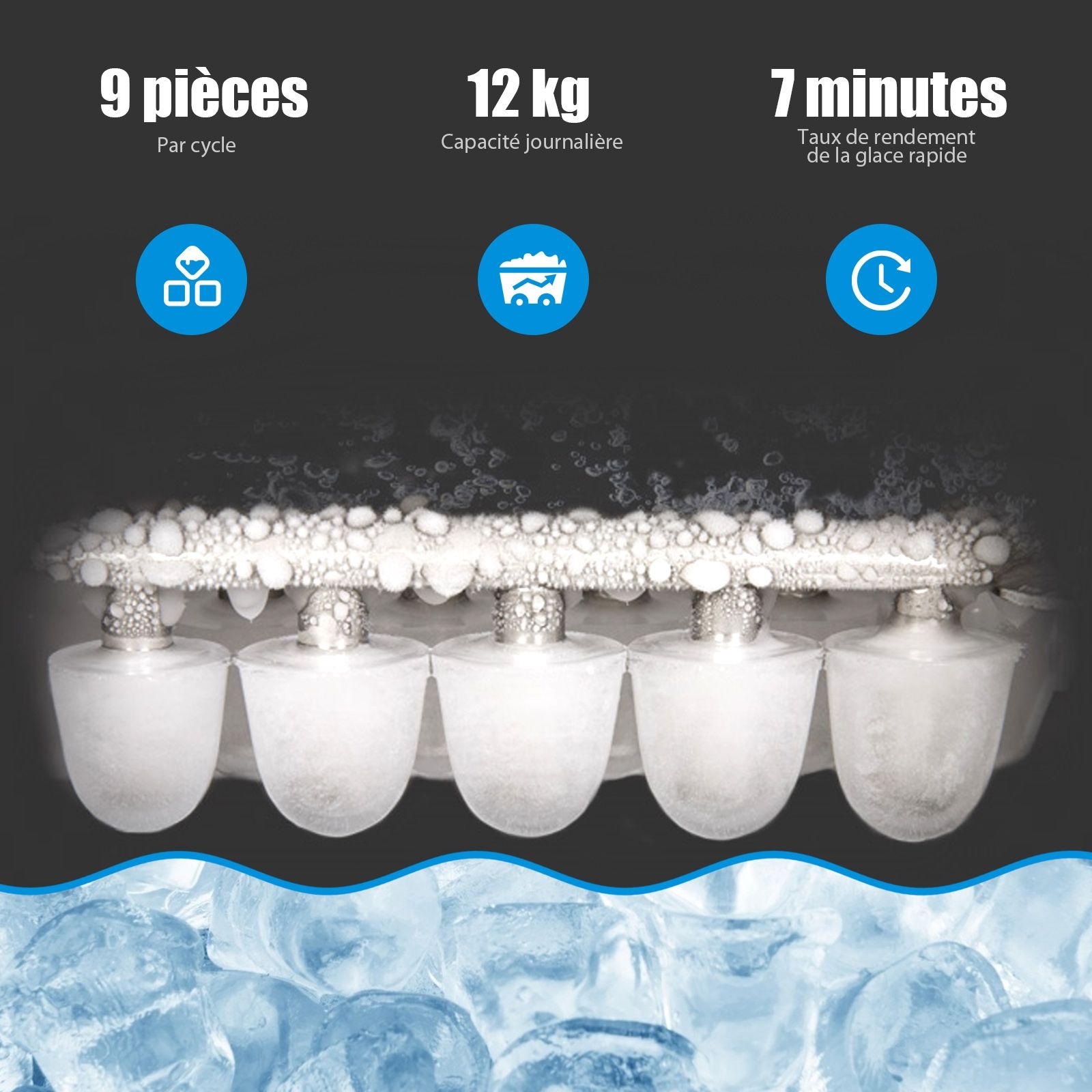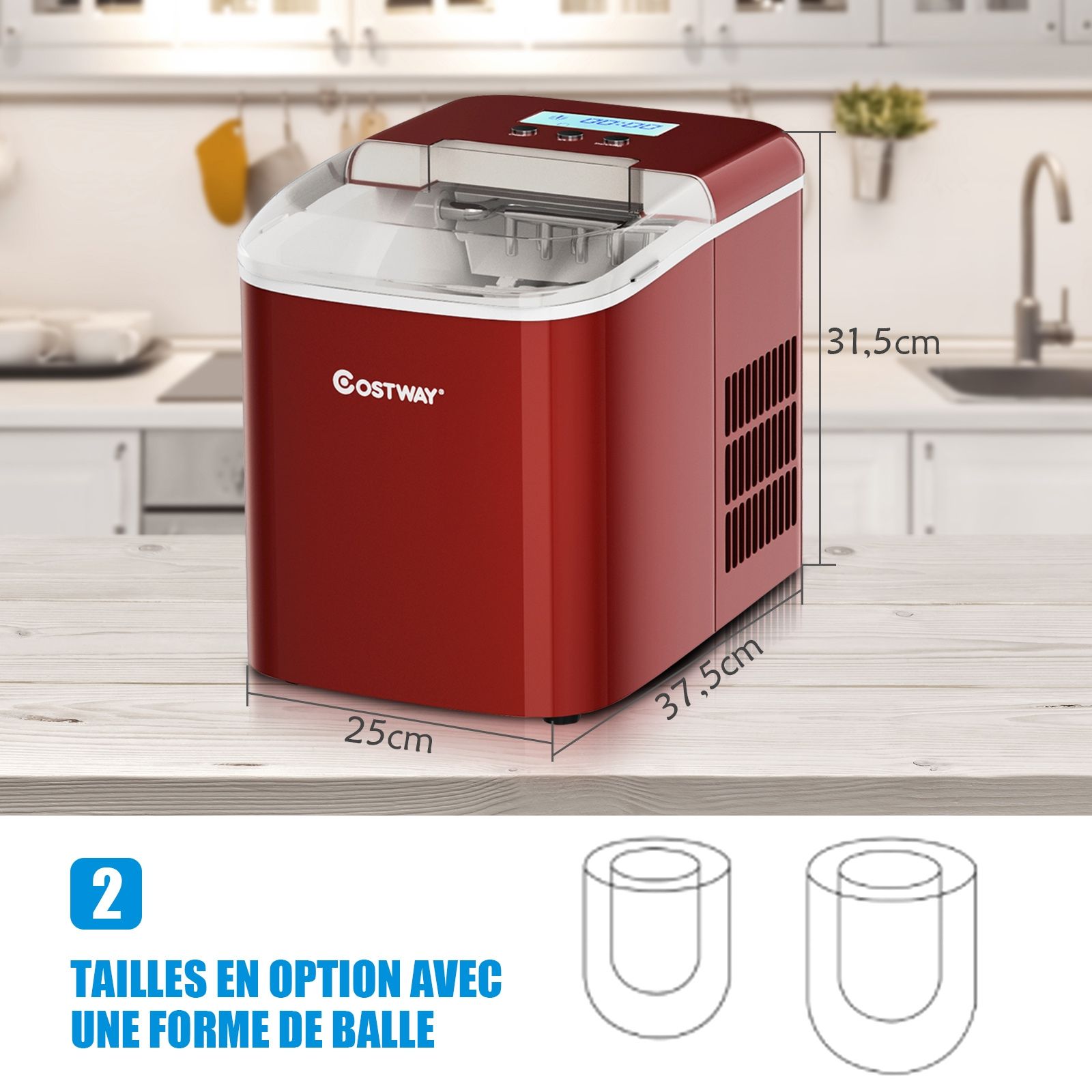 With this elegant ice maker, you can easily make enough ice to enjoy refreshing drinks. This ice maker features a 2.1-liter water tank and quickly makes 9 rectangular ice cubes every 7 minutes (two sizes available). It can make up to 12 kg of ice per day and can temporarily store 600g of ice. An ice scoop and a removable ice basket make it easy to collect ice hygienically. The ice-making process automatically pauses when the water level is low or there is too much ice, and you can observe the ice-making process through the easy-to-open top lid. In addition, this ice maker has a self-cleaning function. Key features: Powerful performance and large capacity, making 9 ice cubes every 7 minutes, with a maximum 24-hour output of 12 kg. This 2.1-liter ice maker is highly efficient. Furthermore, it uses R600a refrigerant, and the removable ice basket can store 600g of ready-to-use ice. [Selectable ice cube size, elongated ice cube shape] Using a copper-nickel alloy mesh, the produced ice cubes are elongated, clean, hygienic, and safe to eat. You can also choose the size of the ice cubes, whether small or large. This ice maker is a very practical kitchen appliance. Compact and Portable, VersatileThis portable ice maker is perfect for placing on kitchen countertops, in offices, shops, and other locations. It keeps your beer, juice, and tea ice-cold, and can even be used to make smoothies or soothe bruises. Simple and Intelligent OperationSimply fill the water tank, and the machine will quickly make ice. If the water level is low or too much ice is made, the machine will automatically stop working and display a fault message on the LCD screen. Usage TipsThe machine comes with an ice scoop. The transparent top cover allows you to observe the entire ice-making process, while the self-cleaning system makes daily maintenance easy and convenient. Powerful Features: Low water level and full ice indicators ensure reliable performance. Compact design saves countertop space. LCD display for easy operation. Self-cleaning or rinseable with vinegar. Two ice cube sizes and elongated shapes. Uses R600a refrigerant, with an ice capacity of up to 600 grams. Comes with an ice scoop and removable ice bucket. Made of durable stainless steel and food-grade ABS. 2.1-liter water tank, makes 9 ice cubes in 7 minutes, or 12 kg of ice per day. Specifications: Color: Red. Main materials: ABS (acrylonitrile-butadiene-styrene copolymer), PP (polypropylene), stainless steel. Dimensions: 25 x 37.5 x 31.5 cm (L x W x H). Net weight: 9 kg. Output: 12 kg of ice per 24 hours. Ice making cycle: 7-8 minutes. Ice capacity: 600 grams of ice. Water tank capacity: 2.1 liters. Voltage: 220-240V. Frequency: 50Hz. Power: 120W Shipping List: 1 x Ice Maker, 1 x Ice Scoop, 1 x Detachable Basket, 1 x Instruction Manual