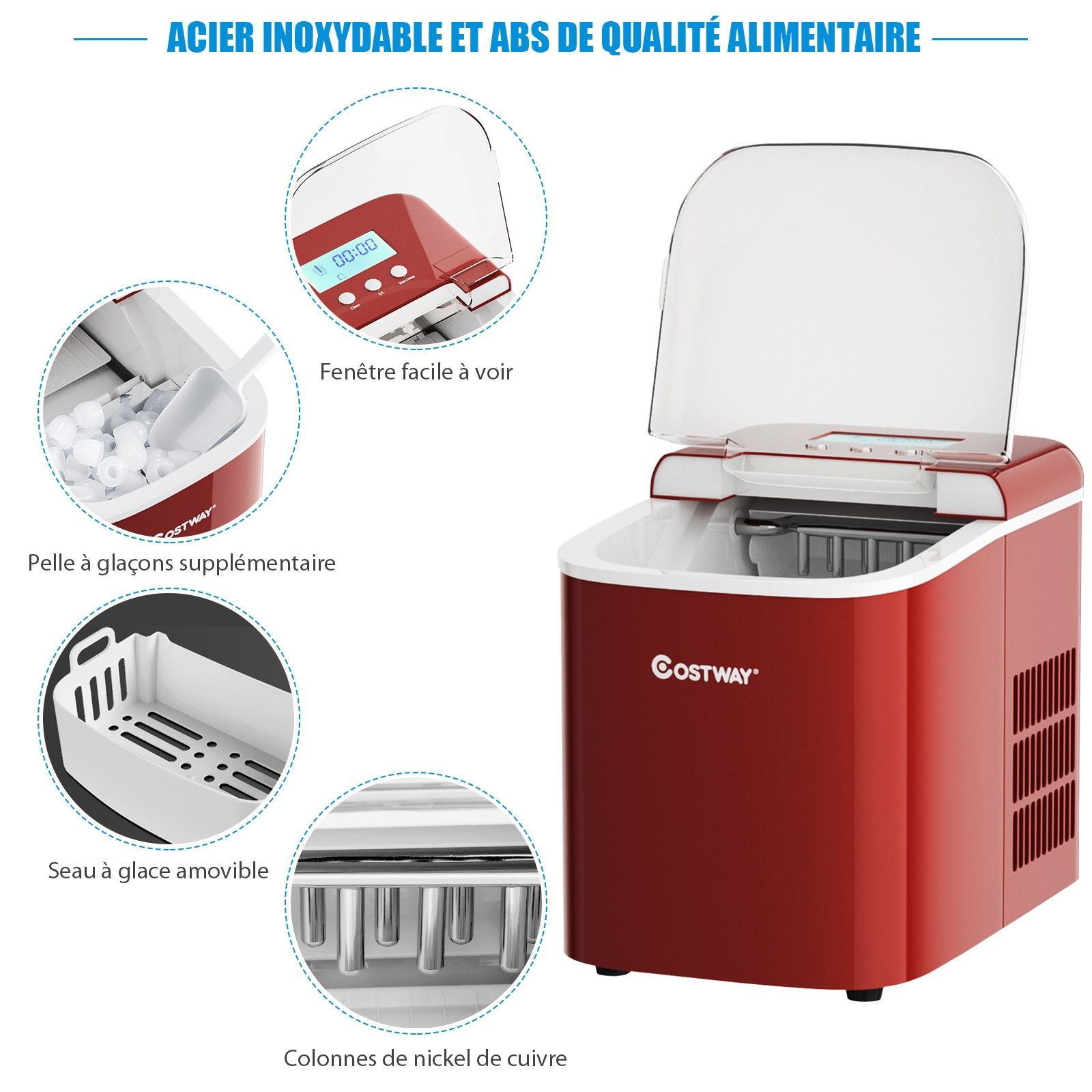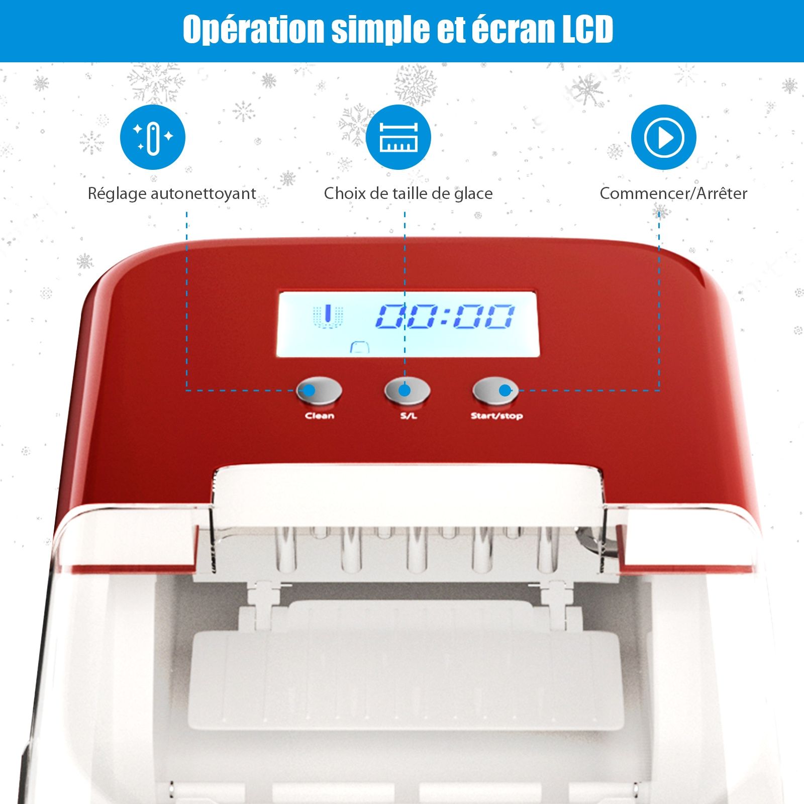 • Ice Maker 12KG/24H 2 Ice Cube Sizes 2.1L Tank 9pcs in 7 Minutes Scoop Removable Basket Countertop Home Red -