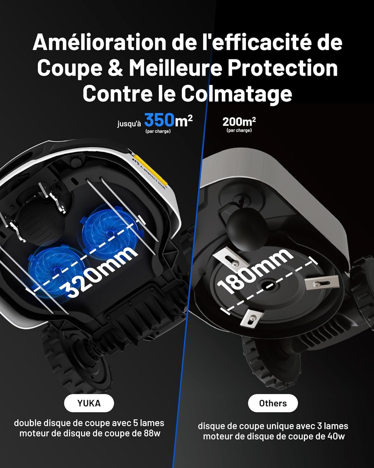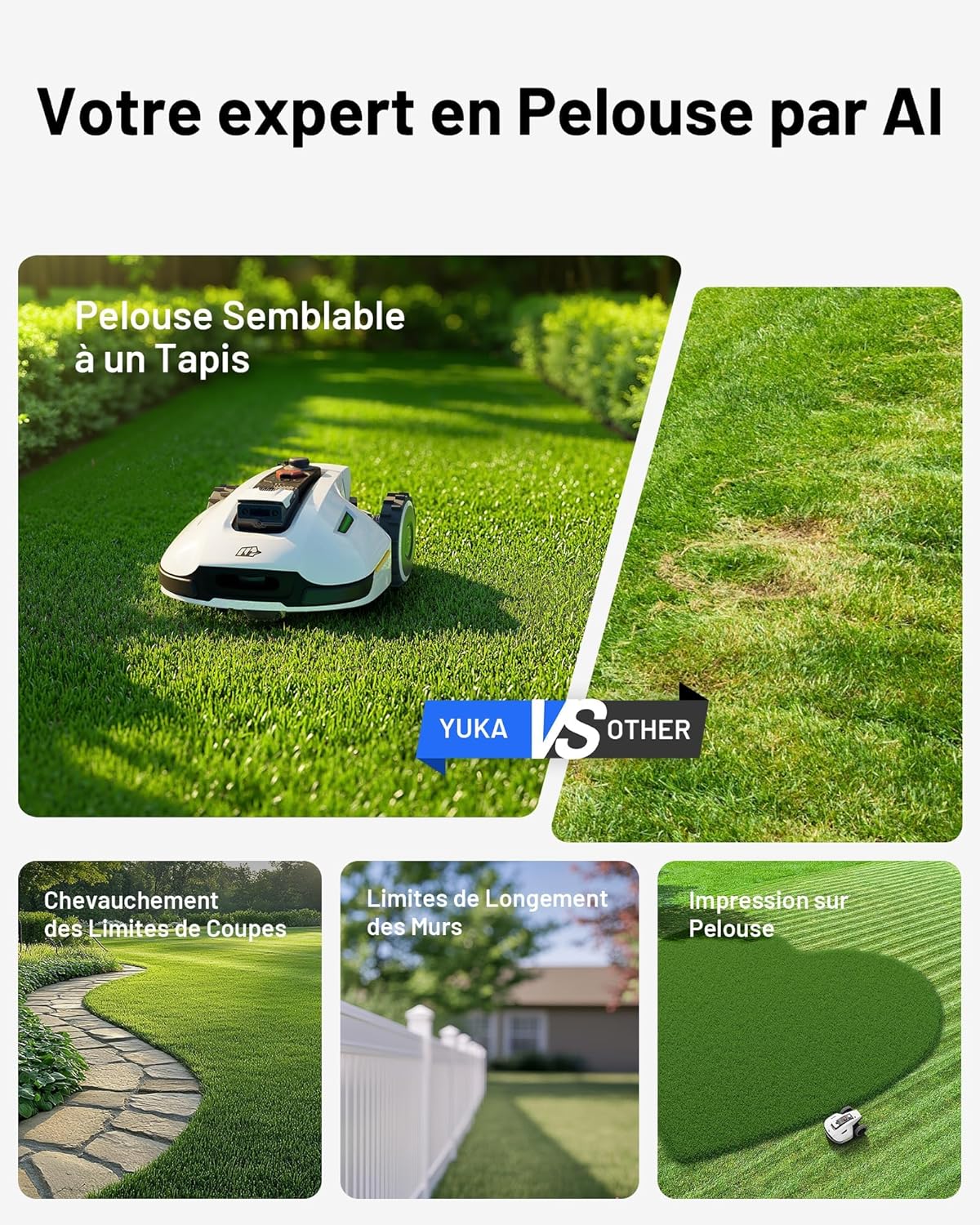 UltraSense AI Vision Automatic Mapping and Smart Visual Fence: Thanks to AI vision technology, YUKA lawnmowers can automatically create virtual boundary maps. Even in areas without satellite signals, YUKA can identify invisible boundaries, ensuring it always operates within the preset mowing area. It uses advanced image processing technology to distinguish between lawn and non-lawn surfaces, preventing accidental entry into restricted areas. New Upgrade, New Lawn Care: YUKA, your AI gardener, can be voice-controlled via Alexa or Google Home. The new generation of YUKA lawnmowers features a path planning algorithm that avoids repetitive operations, dual 320mm cutting discs with adjustable height from 20 to 90mm, effectively handling tall and thick lawns. The floating cutting discs deliver a carpet-smooth finish. 3D Binocular Vision for Smarter and Safer Object Detection: YUKA employs AI object recognition and obstacle avoidance technology to detect and avoid obstacles up to 2.5cm high, dynamically adjusting the path to ensure the safety of children and pets while efficiently mowing. YUKA's AI-driven algorithm ensures precise cutting near edges and walls and offers multiple cutting modes. Terrain Adaptability and Enhanced Cutting Efficiency: Equipped with an 88W motor-driven cutting disc, the YUKA features an improved dual-cutting disc and 10 blades for more efficient mowing and better clogging prevention. It can climb slopes up to 45% (24Spend) without the need for a sweeping attachment, adapting to various terrains. It adjusts its mowing tasks based on real-time weather conditions, making lawn care easier than ever before. Easy App Control and Creative Lawn Patterns: You can easily set up to 10 work zones, each with its own schedule, mowing mode, and cutting height. A lawn printing algorithm allows you to easily create unique patterns. With the Mammotion app, you can not only create no-go zones but also control your robot anytime, anywhere. Reduced Carbon Emissions with Every Mowing: Powered by a high-capacity, replaceable 4.5Ah lithium battery, the YUKA extends runtime and increases efficiency. Utilizing solar-powered RTK technology, the YUKA wirelessly and automatically maps the lawn without human intervention. In addition to the standard RTK antenna, YUKA also offers an advanced upgrade option that requires no installation: Mammotion's iNavi service.