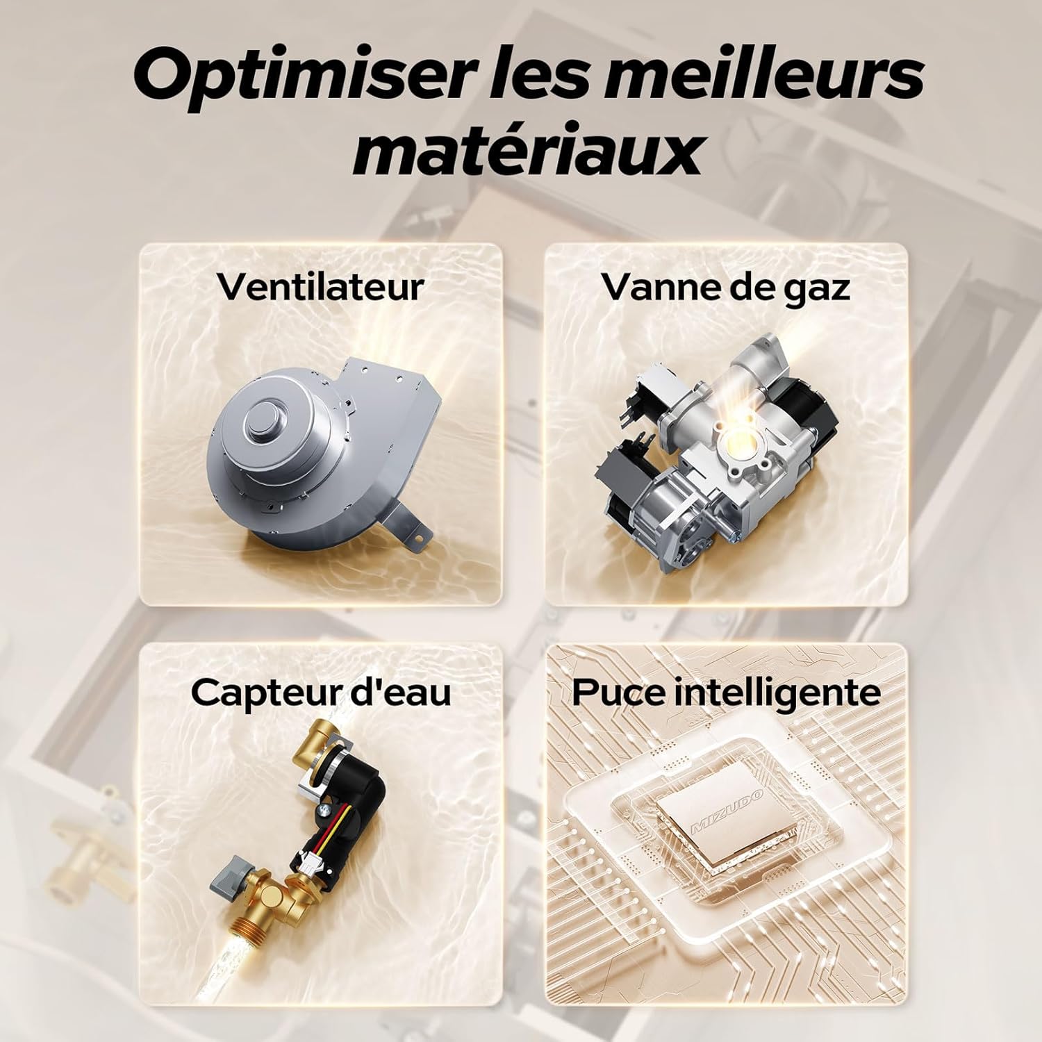 Instantaneous gas water heater with a sealed cavity design: compatible with solar systems and easy to install. Intelligent zone thermostat: continuously adjusts the temperature to maintain a comfortable and constant level even when other areas of the home are using hot water simultaneously. New and advanced independent gas proportional regulator for more precise temperature control. Ultra-smooth electronic ignition this gas water heater uses automatic low-pressure electronic ignition, providing hot water even under low water pressure; minimum operating water pressure is 0.1 bar. Minimum power: 5 kW. Gas inlet: 1/2 inch. Hot and cold water inlets: 1/2 inch. Gas inlet diameter: 60/100 mm. Multi-functional LED display: an easy-to-use LED screen allows you to view the bathtub hot water temperature at any time and adjust it to your preference. Additionally, there is a chart displaying the water heater's operating status. Simple white panel design, elegant and stylish. Low NOx emissions: the burner has low emissions and high energy efficiency, ensuring safety and reliability. The oxygen-free copper antibacterial water tank is corrosion-resistant, leak-proof, has rapid heat conduction, high energy efficiency, and a long service life. Note: This product does not include the flue outlet required for installation. If you encounter any quality problems during use, you can contact us by phone, email or leave a message, and we will handle it in accordance with our warranty policy.