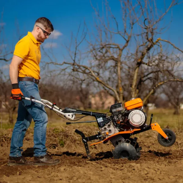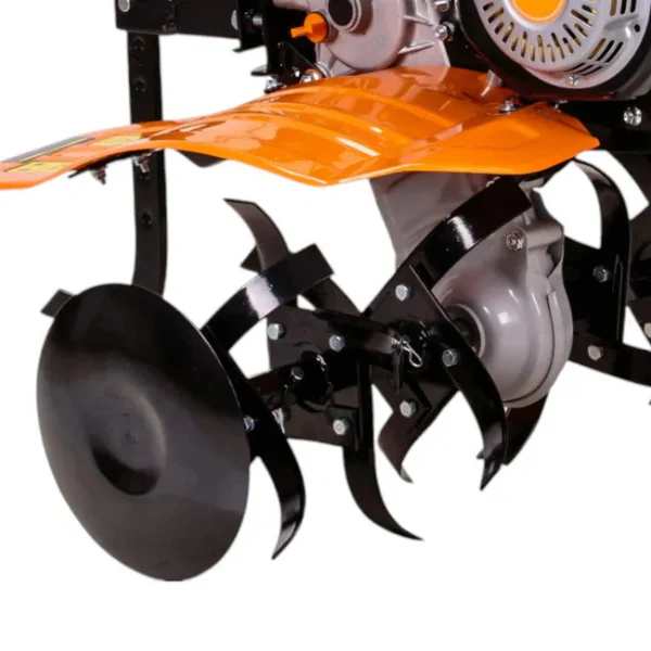 A high-performance gasoline tiller designed for efficient soil preparation and cultivation. This rugged and durable machine is ideal for amateur gardeners and smallholders, standing out with its powerful 212cc four-stroke engine and adjustable working depth, perfectly blending power and versatility to meet a variety of agricultural needs. Its ergonomic design features foldable handlebars for easy storage; the belt and chain drive system ensures excellent maneuverability on various terrains. A two-year warranty provides peace of mind, offering reliability and durability for your gardening or cultivation projects (up to 2000 square meters). Powerful versatility: Adjustable tillage depth can be customized to soil conditions for optimal results. Powerful engine efficiency: A powerful engine ensures reliable performance even on compacted soil. Enhanced maneuverability: Multiple speed modes, including reverse, allow for easy handling of various terrains. Ergonomic design: Foldable handlebars for easy storage, and integrated wheels simplify transportation. Technical Specifications: Powerful Engine: Powerful four-stroke, Powerful Power: Powerful 4.0 kW (5.6 HP) Powerful Working Width: Powerful 80 cm Powerful Adjustable Working Depth: Powerful 150 - 300 mm Powerful Drivetrain: Powerful belt and chain system Powerful Gearbox: Powerful 2 forward gears, 1 reverse gear Powerful Handlebars: Powerful folding and adjustable Powerful Rotor: Powerful six-blade system with side discs Powerful Compatibility: Suitable for gardens up to 1500 square meters and plots up to 2000 square meters