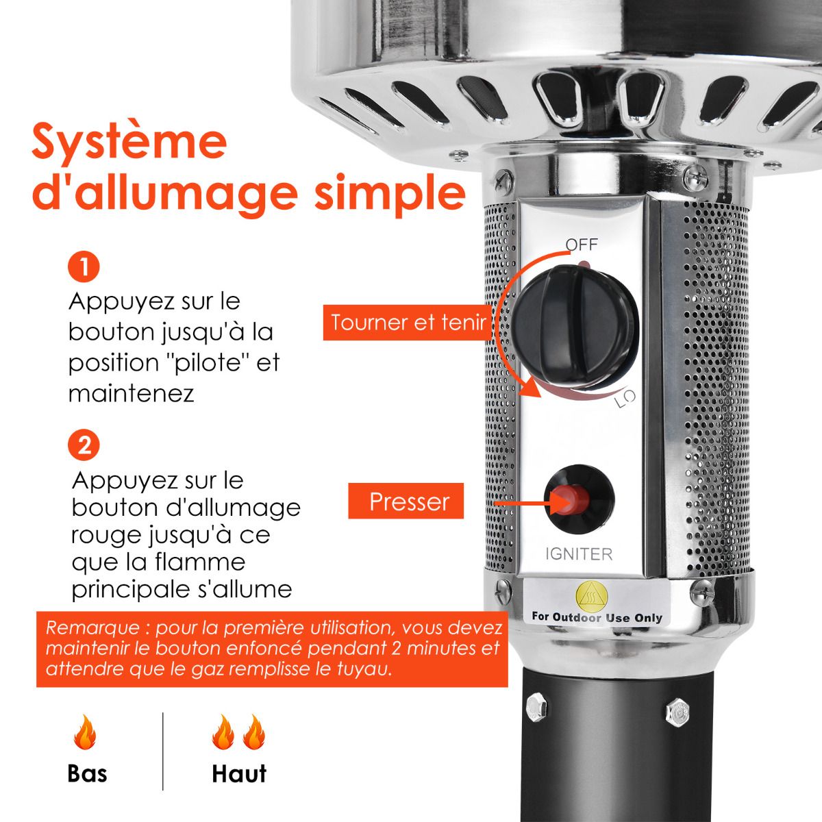This propane outdoor heater is a smart choice for both commercial and residential use. With a heat output of 48,000 BTU, it covers an area with a diameter of 4.5 meters, creating a warm and comfortable environment. Simply press the ignition button and rotate the control knob to adjust the temperature from low to high. The high-quality stainless steel construction ensures its durability and longevity. Two built-in wheels make it easy to move. Two handles on both sides facilitate the installation of the gas canister (not included). Furthermore, an anti-tipping device and three ground stakes ensure stability and safety during use. It is perfect for gardens, patios, parks, pools, or any other outdoor space. Enjoy your outdoor space with this outdoor heater! Features: Powerful Heating Efficiency This premium outdoor heater boasts a high heating power of 48,000 BTU, providing warmth for extended periods, even in cold weather. In addition, the 82cm reflector offers a wide coverage area of ??up to 4.5 meters in diameter. Easy-to-use System: The temperature can be adjusted as needed, from low to high, via the control knob. Furthermore, the simplified ignition system allows you to easily and conveniently turn on the heater simply by pressing the red power button. With a power output of up to 13 kW, continuously adjustable from 5 kW to 13 kW. Multiple safety features: This patio heater is thoughtfully designed with an anti-tipping safety device to ensure user safety. Additionally, it comes equipped with three ground stakes for stability and durability. A piezoelectric ignition system ensures safety. Premium materials: This patio heater is made of high-quality steel with a robust coating sufficient to withstand harsh weather, ensuring long-lasting durability. The stainless steel burner is resistant to melting or burning. Regardless of the weather, you can easily install it in your garden, patio, park, or poolside. Easy assembly and transport: Two handles on both sides make it easy to install a 9 kg liquefied propane gas cylinder (not included). Generally, one gas cylinder can last for about 5 to 6 hours. Two integrated smooth-slip casters allow you to move this patio heater quickly and easily. Powerful Features: 48,000 BTU powerful firepower for rapid heating; 82 cm reflector with a heating range of up to 4.5 meters in diameter; easy operation with adjustment knob and ignition button; anti-tipping device; 3 ground anchors for maximum stability; high-quality steel for durability; stainless steel burner with flame and oxygen depletion protection for safe heating; two handles on each side for easy assembly; 9 kg liquefied propane tank (not included); 2 smooth casters for easy and convenient movement; easy to use; suitable for balconies, gardens, patios, and poolsides. Specifications: Color: Black; Material: Steel + Stainless Steel; Dimensions: 82 cm x 82 cm x 220 cm (L x W x H); Base Dimensions: 50 cm x 74 cm (D x H); Net Weight: 15 kg; Power: 48,000 BTU, 5,000 watts - 13,000 watts; Fuel Type: Propane or Butane (Consumption: approx. 15 kg, 450 g to 945 g per hour) Package Includes: 1 x High-Powered Patio Heater, 1 x Instruction Manual