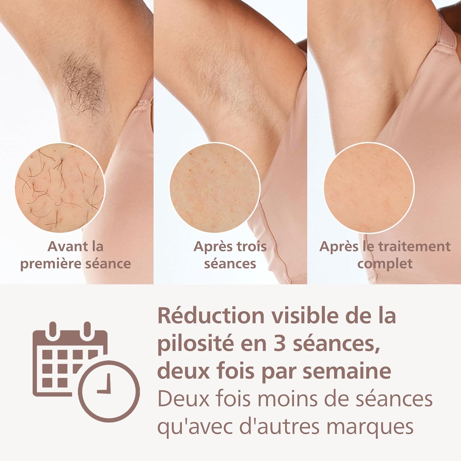 Enjoy lasting smooth skin: Clinically tested, the Lumea IPL hair removal device effectively reduces hair growth for up to 12 months, and even longer for up to 18 months! Just 3 treatments can reduce hair by up to 92% and maintain smooth skin for up to 18 months. The packaging may still indicate a 12-month supply. Fast results: Treat every 2 weeks for the first 6 weeks, then monthly. Only half the number of treatments required compared to other brands. SenseIQ Personalization: The SmartSkin sensor detects your skin tone and indicates the brightness settings you can use, while our free app guides you step-by-step through your treatment. Includes 4 Smart Curved Attachments: Body, face, bikini line, and underarm attachments perfectly conform to your body's curves and trigger the most effective program for each area. Unique Lumea SmartPulse IPL Patented Formula: Balanced power, colored light, and optimal pulse duration deliver a safe, effective, and gentle hair removal experience. Developed over 20 years and inspired by professional beauty salons, the Philips Lumea IPL hair removal device was co-developed by experts and tested on over 3,000 women. The kit includes: one Philips Lumea 8000 Series IPL hair removal device (BRI949/00), one Satin Compact pen trimmer, and four attachments for body, face, bikini line, and underarms. See contents of the box. Product Description: The Philips Lumea 8000 Series IPL hair removal device features SenseIQ smart technology, four smart attachments, and a Lumea IPL app for personalized full-body hair removal. Reduce hair by up to 92% in just 3 treatments and enjoy silky smooth skin for up to 18 months. This product is a power-operated version. Its high efficiency is due to our unique patented Lumea Smart Pulse technology, which combines balanced power, colored light, and optimal pulse duration for safe and effective hair removal. This innovative solution, born from over 20 years of Philips' professional research and development, makes the Philips Lumea an ideal alternative to laser hair removal devices. A skin contact sensor protects your eyes and ensures the flash is only triggered when in full contact with the skin. Thanks to this, you don't need to wear goggles during use. Enjoy a unique and personalized IPL hair removal experience using the free Lumea app. Your personal trainer will ensure you get the most out of your Philips Lumea IPL device for long-lasting hair removal results. The smart attachment features a unique curved design that perfectly conforms to your body's curves and automatically adjusts the program for each area. The device offers five adjustable light intensity levels. The SmartSkin sensor detects your skin tone and indicates the most suitable light intensity setting for the treatment area. This special beauty kit includes the Philips Satin Compact pen trimmer, a compact and elegant trimmer for quick touch-ups and can also be used as a facial hair removal device for women. Philips brings salon-grade Intense Pulsed Light (IPL) technology to the home, allowing you to easily and effectively use it at home. Philips Lumea, developed by experts and tested on over 3,000 women, ensures gentle and effective hair removal, safe even for sensitive areas. This technology works by sending micropulses of light to the hair follicles to inhibit hair regrowth. Philips is the number one IPL hair removal brand globally and in Europe. Average results: 86% reduction in leg hair, measured 18 months after the third treatment. While Lumea has been proven to effectively reduce hair for up to 12 months, testing shows that it can also effectively reduce hair for up to 18 months starting with 3 treatments. The packaging may still indicate a 12-month duration of effect.