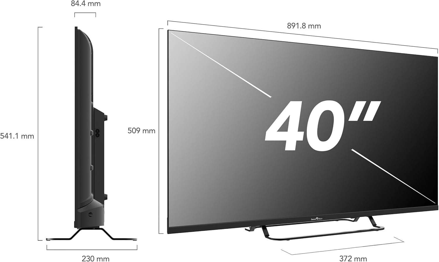 Smart TV vidaa. Access to apps: Netflix, YouTube, Prime Video, Disney+, Molotov br Full HD Resolution: 1920*1080 br Hotel Mode; Wall Mount: VESA 200*200 br Chromecast, Dolby Audio br Wi-Fi, Bluetooth, 2 USB ports, 3 HDMI ports, 3.5mm headphone jack br Immerse yourself in a breathtaking entertainment experience with the Smart Tech 40FV02V TV. Featuring exceptional Full HD picture quality, this television delivers incredibly sharp images and vibrant colors that bring every scene to life. Easily navigate through a multitude of content thanks to its integrated Smart TV functionality. Get instant access to your favorite streaming apps, thousands of movies and series, and a variety of online TV channels for a personalized entertainment experience. With its 40-inch screen, the Smart Tech 40FV02V TV offers total immersion in your favorite content, whether you're watching a movie with the family, playing captivating video games, or following your favorite TV shows. Enjoy simplified wireless connectivity thanks to built-in Bluetooth technology. Connect your compatible devices in a flash and stream your music, videos, and much more directly to your screen. Designed to combine exceptional performance with elegant design, the Smart Tech 40FV02V TV blends seamlessly into any living space. With its sleek design and slim bezels, it adds a touch of modernity to your interior. Don't miss a single detail and experience unforgettable entertainment moments with the Smart Tech 40FV02V TV. Redefine the way you watch TV today! br 40" (101 cm) Smart TV; Vidaa; Hotel Mode; Central Stand; 2 USB Ports; 3 HDMI Ports; 3.5mm Jack; Full HD Resolution: 1920*1080