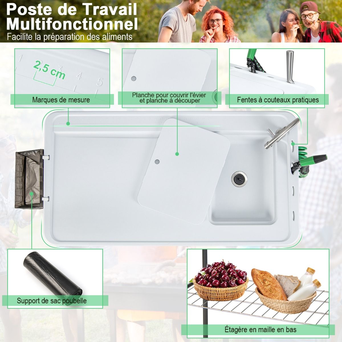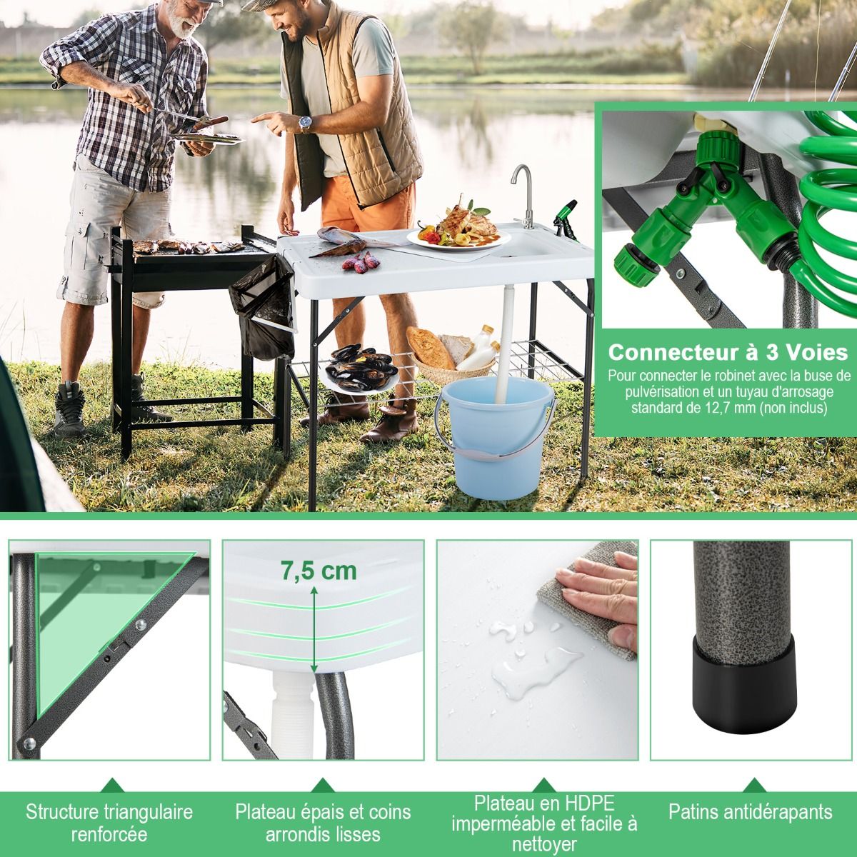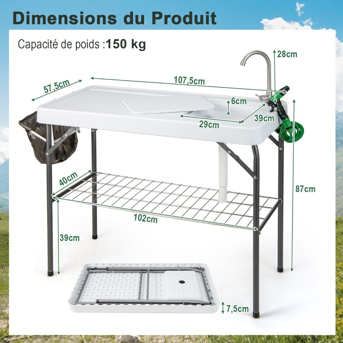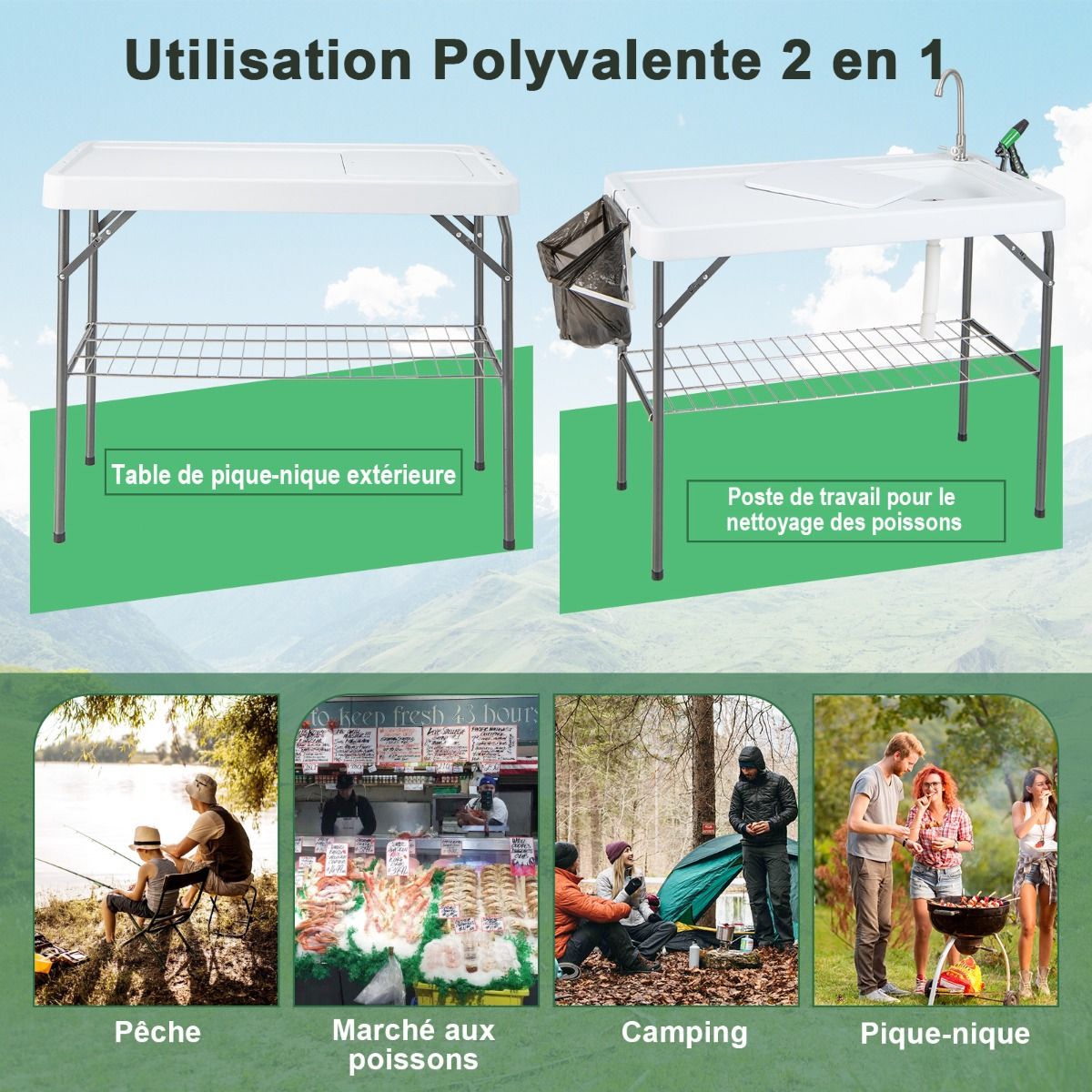 • Folding Fishing Table with 360Spend Rotating Tap, Portable Camping Table for Cleaning Fish, Steel & HDPE, with Sink and Grill Rack, 150KG Load Capacity