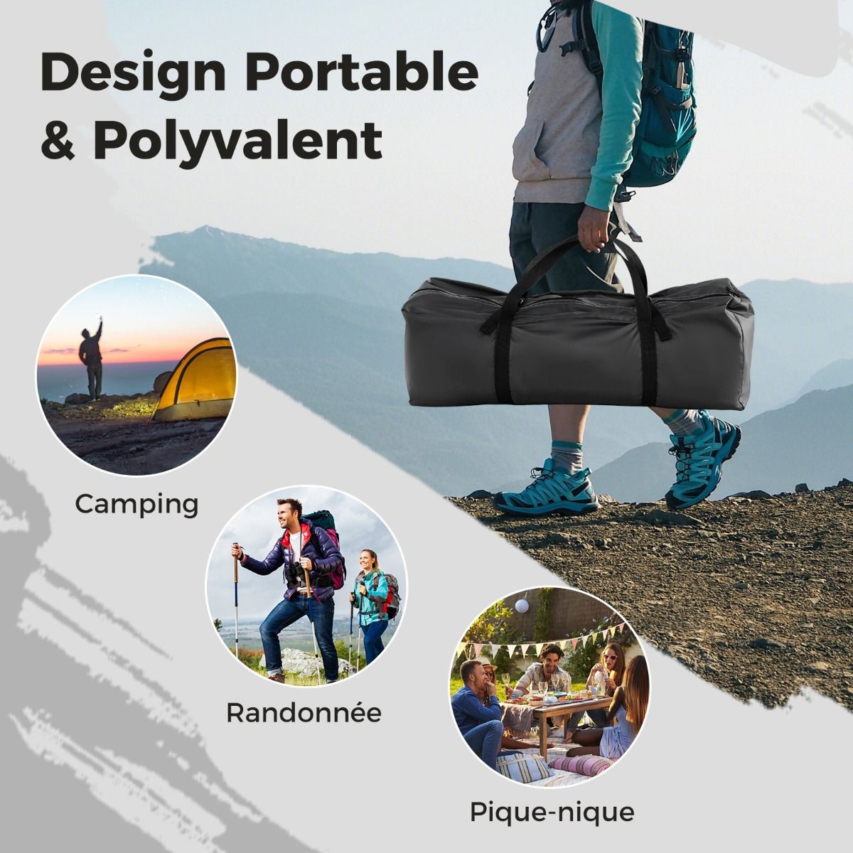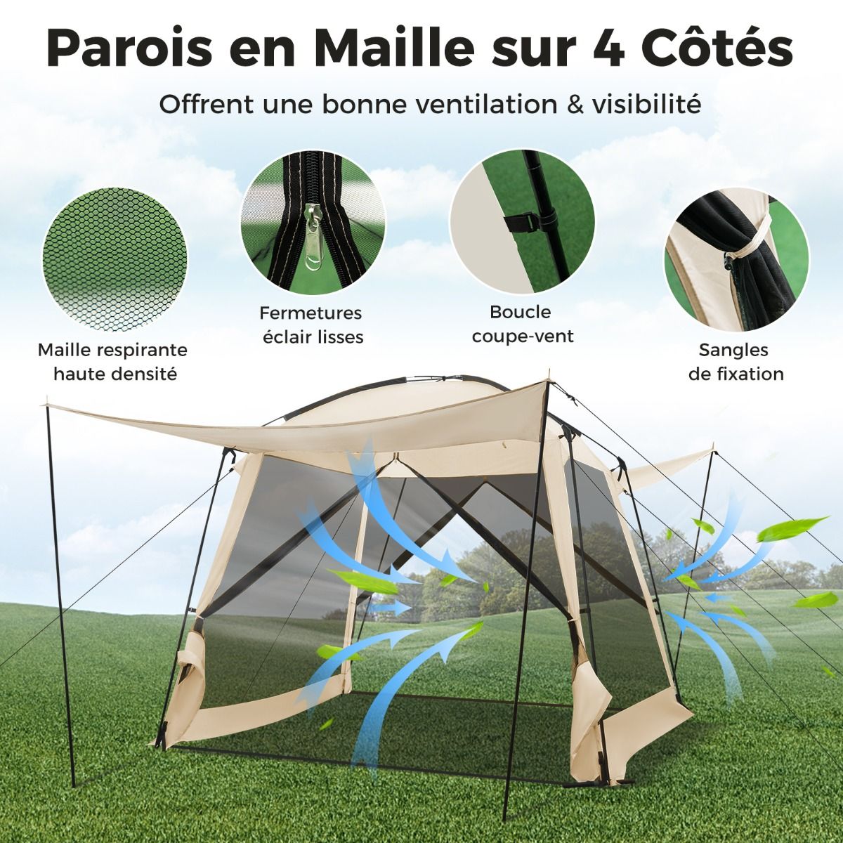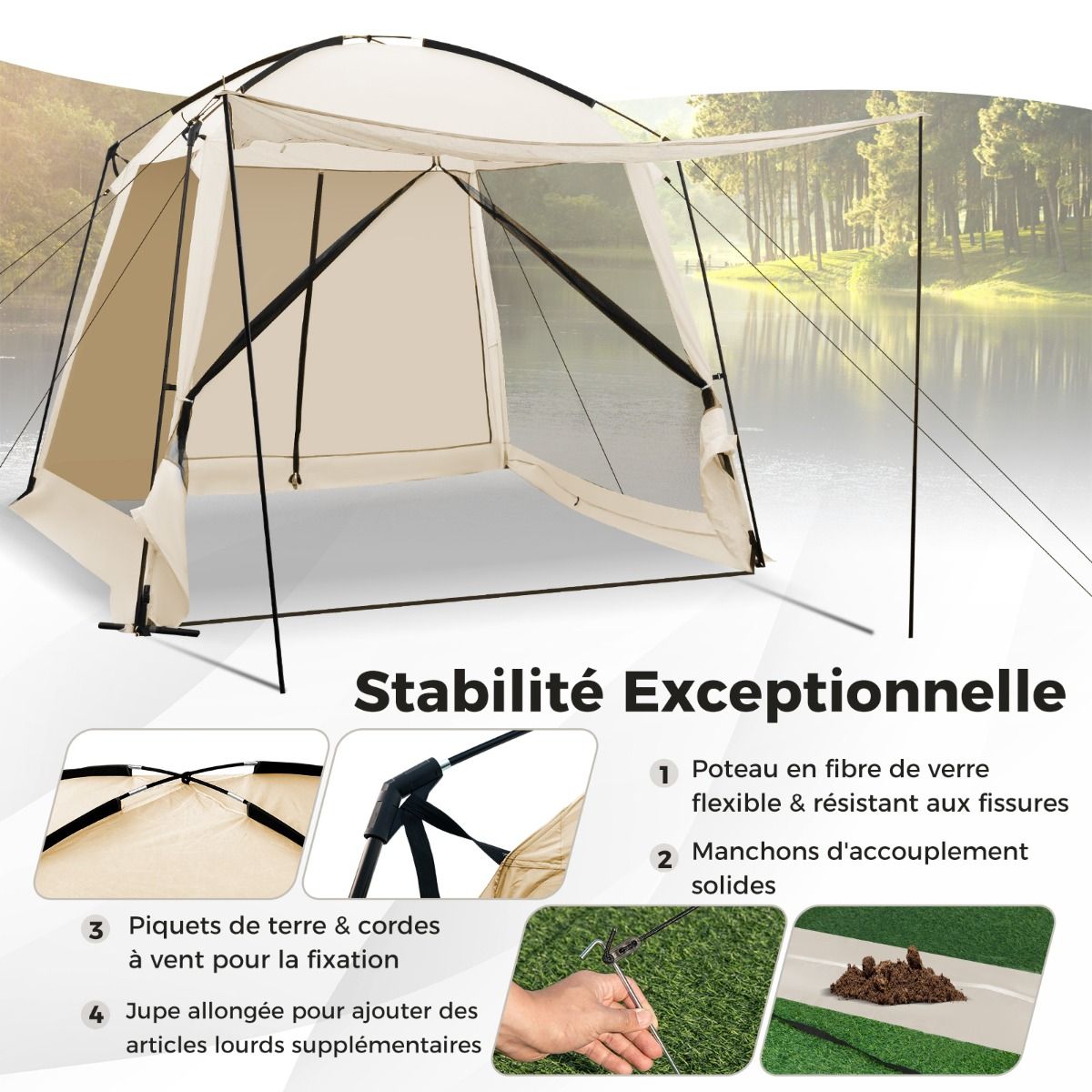 Our camping tent accommodates 8 to 10 people. The entrance door converts into a vestibule, providing a shaded area for outdoor activities. The tent features a mesh design on all four sides to protect against insect bites, promote ventilation, and offer excellent visibility. The tent is made of waterproof PU-coated polyester fabric, providing sun and light rain protection. Durable fiberglass poles provide stable support. The tent comes with ground pegs and guy lines to secure it firmly to the ground. Features: Spaciousness This 300 x 300 x 250 cm tent comfortably accommodates 8 to 10 people, allowing them freedom of movement, making it ideal for family camping trips or large group gatherings. Furthermore, this mosquito-proof tent features a vestibule design, expanding your living space. Improved Ventilation This large camping tent features 4 mesh side panels for optimal airflow, keeping you cool and comfortable during outdoor adventures. The mesh panels offer panoramic views and effectively prevent insect infestation. Weatherproof Performance: This camping tent features a 2000mm waterproof PU-coated polyester fabric, providing excellent sun protection and light rain resistance. Do not use in extreme weather conditions. Superior Stability: The camping tent is supported by metal and fiberglass poles, known for its durability and sturdiness. Additionally, 14 tent pegs and 8 guy lines ensure the tent remains stable in windy conditions. You can also add stones to the extended skirt for added stability. Portability and Versatility: This awning tent is easy to set up and dismantle. The included storage bag makes it convenient to store the tent when not in use. You can also easily take it to outdoor parties, picnics, and other activities. Sturdy and durable, it can accommodate 8 to 10 people for various camping activities. Four-sided mesh walls provide good ventilation and visibility. The tent features a 2000mm waterproof PU coating, providing protection against drizzle. The polyester fabric is tear-resistant. The tent door can be secured with poles to create an additional resting area. Flexible and durable fiberglass poles provide stable support for the canopy. Equipped with tent pegs and guy lines for securing the tent. Extended skirt design allows for carrying heavier items. Includes hooks for hanging lights. The tent door zipper can be rolled up with straps. Suitable for camping, hiking, and picnics. Easy to assemble using the detailed instructions. Specifications: Color: Beige; Material: Polyester, PU coating, metal, fiberglass poles; Overall dimensions: 300 x 300 x 250 cm (L x W x H); Awning dimensions: 275 x 210 cm (L x W x H); Net weight: 9.5 kg. Package includes: 1 x Tent, 1 x Packing bag, 14 x Tent pegs, 8 x Guy lines, 1 x User guide.