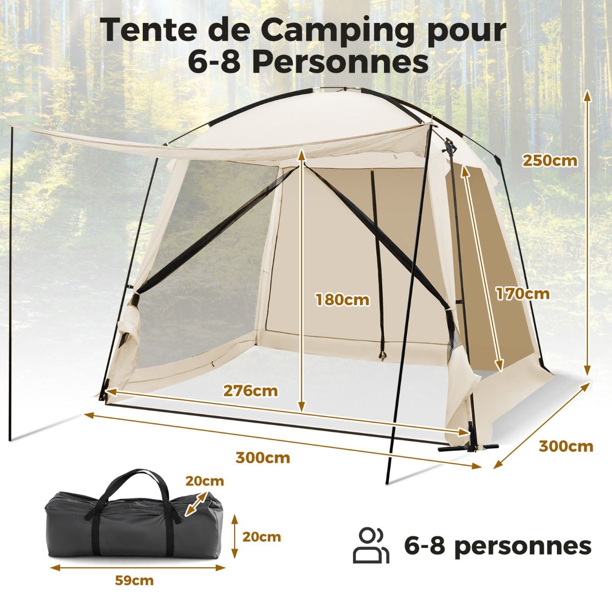 • Camping Tent for 8-10 People, Dome Tent with Vestibule and Mosquito Net, Zipped Door, Portable Tent with Carry Bag, 300x300x250cm, Beige