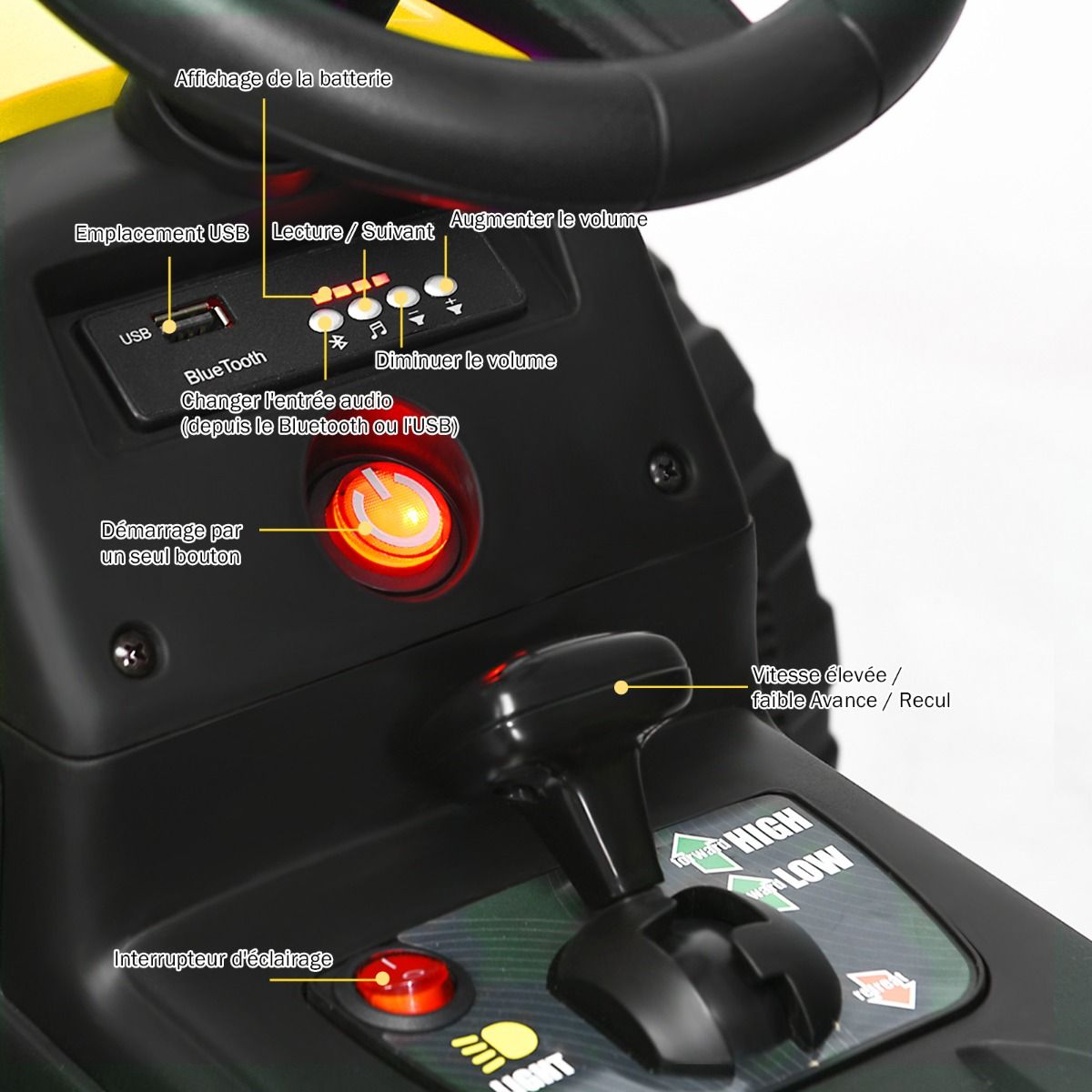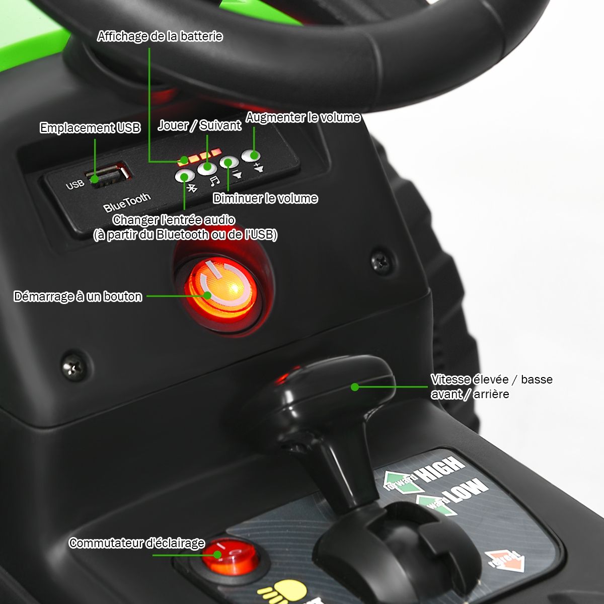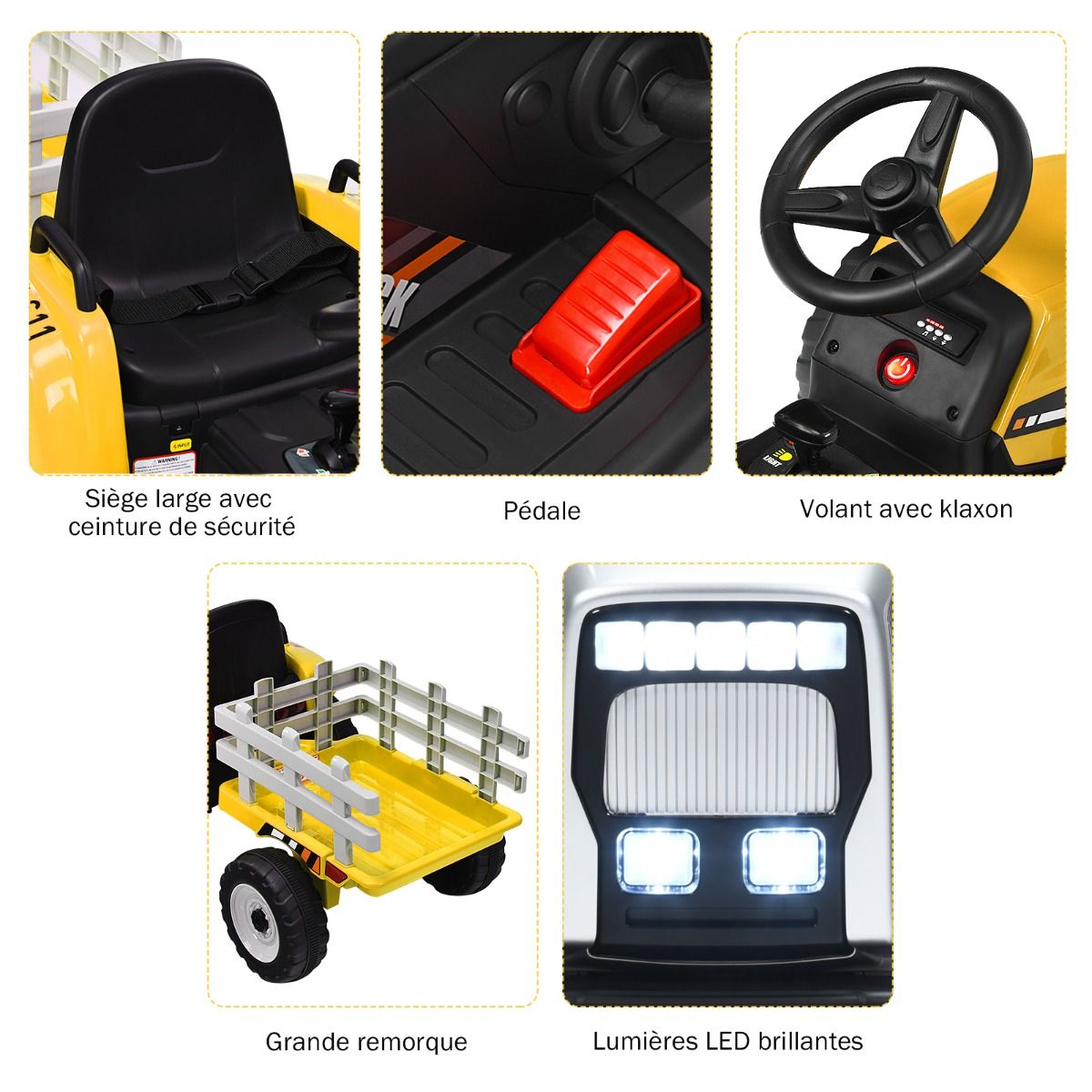 • Electric Tractor with Trailer for Children, 3 Speeds, LED Lights, USB and Bluetooth Functions, Yellow/Pink/Red/Green/Dark Green/Black