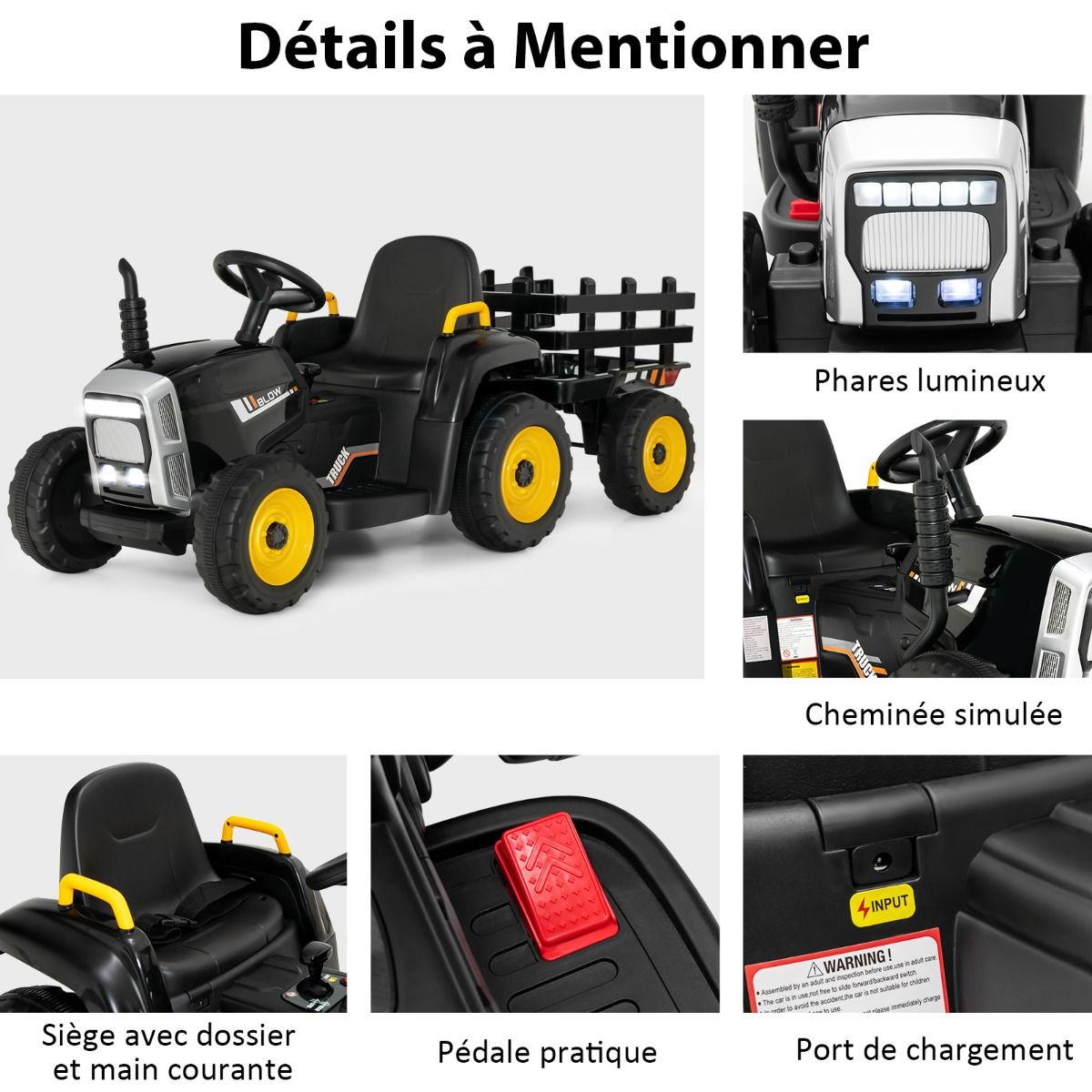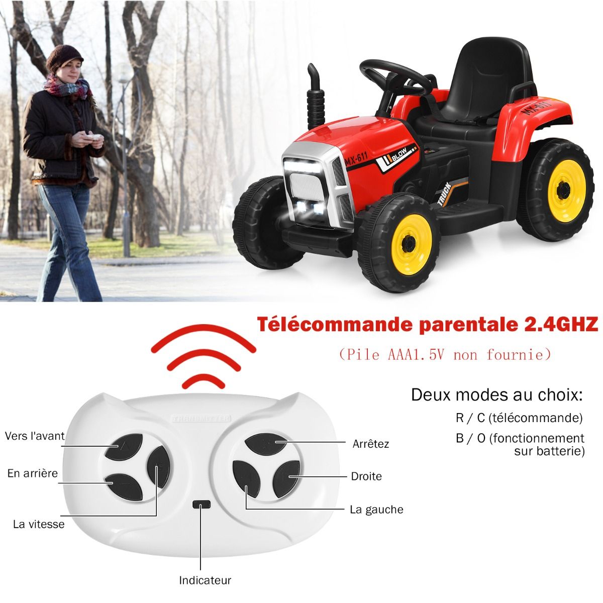 This electric tractor with a trailer is not only fun to drive, but also allows children to transport small items, fostering courage and improving coordination! Children can use the corresponding controls to move forward or backward at different speeds. Built-in music and Bluetooth functionality allow children to drive in a relaxed atmosphere. It perfectly balances safety and comfort, with a wide seat equipped with a seatbelt, smooth start and stop, and more. Safe materials and rigorous certifications ensure its reliability. Product Features: Easy ControlBattery Powered: This electric tractor is powered by a rechargeable battery, allowing children to freely control it via the steering wheel and pedals inside the vehicle. Safe and Smooth Driving ExperienceThe wide seat with a seatbelt and armrests provides extra protection. Wear-resistant and non-slip wheels are suitable for various indoor and outdoor surfaces. Notably, the electric vehicle's soft-start technology avoids startling children due to sudden acceleration or braking. Superior Materials, Superior PerformanceThis electric tractor is made of high-quality PP and iron materials, making it sturdy, durable, and long-lasting. Furthermore, thanks to the high-capacity rechargeable battery and two powerful motors, our electric vehicle will bring your child driving pleasure for miles. [Large Detachable Trailer] This electric tractor comes with a large trailer, which children can use to transport toys, flowers, straw, and more. The easy-to-detach hook design allows the tractor and trailer to separate quickly, letting children enjoy the fun of four-wheel drive. [Ideal Gift for Children] This tractor has a realistic appearance, bright lights, an easy-to-use shift lever, and a steering wheel with a horn, designed to provide your child with the most authentic driving experience. It also features a built-in audio system that can play music via USB or Bluetooth with adjustable volume. Functions: Fast/slow speed switching in B/O mode, 3 gear modes in R/C mode. Rechargeable design with a powerful 12V motor for longer battery life. Bright LED lights illuminate dark environments, adding more riding fun. Soft-start technology prevents children from being startled by sudden acceleration or braking. A wide seat with a seatbelt ensures both comfort and safety. Equipped with a detachable trailer for transporting toys, grass, straw, etc. Durable wheels suitable for various surfaces such as wooden floors, asphalt, and brick roads. The gear lever has two forward gears and one reverse gear. Specifications: Colors: Yellow/Pink/Red/Green/Dark Green/Black. Material: PP + Iron. Dimensions with trailer: 135 x 51 x 53 cm (L x W x H). Dimensions without trailer: 84.5 x 51 x 53 cm (L x W x H). Gross weight: 16.27 kg Load capacity: 30 kg Battery: 12V 7AH x 1 Charger: 12V DC 1000MA Speed: 3 8 km/h Recommended age: 3 years and up Charging time: 8 12 hours Package includes: 1 x Electric tractor 1 x Instruction manual