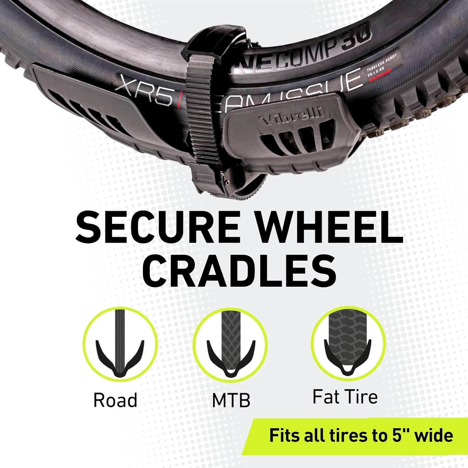 • Vibrelli Electric Bike Hitch Carrier 2 Electric Bike Carriers for Fat Tires, Mountain Bikes, Standard Bikes 29.5 kg per bike Patented anti-wobble system Cars and SUVs Platform
