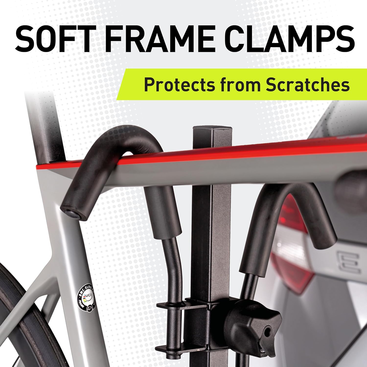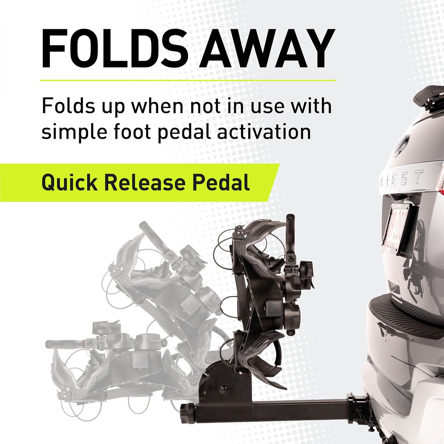Compatible with e-bikes: Can carry two bicycles, each weighing no more than 29.5 kg (maximum load 59 kg). The V70 trailer bike rack is designed for road bikes, mountain bikes, and wide-tire bikes, with a maximum width of 12.7 cm. Compatible with SUVs and cars equipped with a 5.1 cm tow hook. Not suitable for: Class B vehicles (RVs, campervans), the front of vehicles, towed vehicles, fifth-wheel trailers or trailers, and 3.2 cm tow hooks. Convenient tilt and fold: Quick-release pedals tilt the bike rack downwards for easy access to the trunk, and fold away when not in use. Flexible wheel rack suitable for narrow/wide tire bikes with a width not exceeding 12.7 cm. Ratchet straps securely hold wheels in place without scratching rims or damaging tires. Triple safety lock: A triple locking mechanism ensures the safety of your bike. Equipped with safety straps for peace of mind when entrusting valuables. Note: Low-profile/women's bikes require a frame adapter (not included). Patented anti-sway hooks: Lock the frame to the hook receiver to reduce swaying. Enjoy a smooth, noise-free riding experience.