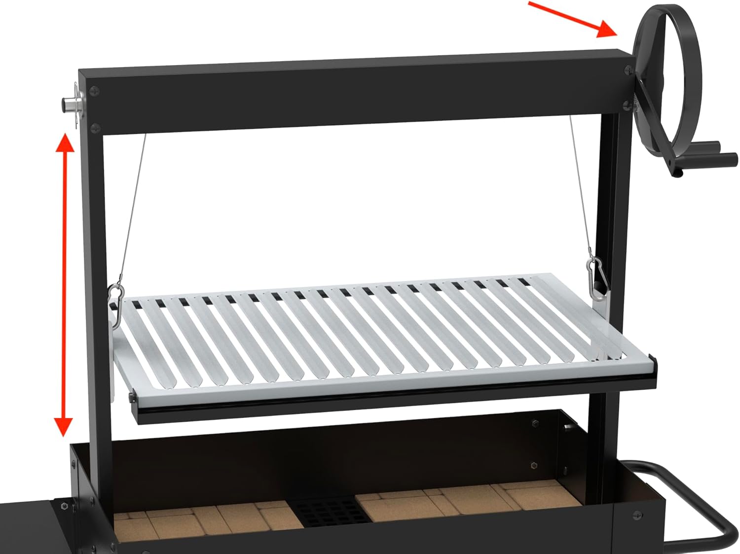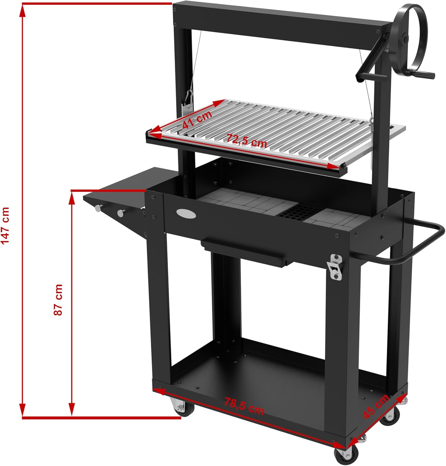 About this item: SANTA MARIA Charcoal and Wood Barbecue Robust firebox: 2 mm thick Firebricks: Included Dimensions: 147 x 45 x 100 cm Cooking surface: 41 x 72.5 cm (2972.50 cm2) Height adjustable: Yes, with an aluminum crank handle featuring a safety brake Grill material: V-shaped stainless steel Ash tray: Yes Side shelf: Yes, removable Bottle opener: Yes Wheels: Four wheels, two with brakes Weight: 42 kg Robust 2 mm thick firebox: Ensures excellent heat retention and even cooking thanks to the firebricks. Height adjustable with crank handle: Allows you to control the distance between the coals and the food for cooking to your liking. V-shaped stainless steel grill: Reduces flare-ups and ensures optimal cooking of meats. Crank handle with safety brake: Offers added control for safe use. Removable ash pan: Simplifies cleaning after each use. Removable side shelf: Convenient for preparing and serving your food. Integrated bottle opener: For easily opening your drinks while cooking. Four wheels, two with brakes: Facilitates movement and ensures the barbecue's stability. Discover the SANTA MARIA barbecue, ideal for grilling with charcoal and wood. Its 2 mm thick firebox with refractory bricks ensures excellent heat retention. With dimensions of 147 x 45 x 100 cm and a cooking surface of 41 x 72.5 cm, this barbecue offers ample space for preparing meals with family and friends. The V-shaped stainless steel grill allows for optimal cooking of meats by reducing flare-ups. Height adjustment is easily achieved with a crank handle equipped with a safety brake. The removable ash pan simplifies cleaning. The SANTA MARIA barbecue includes a removable side tray, an integrated bottle opener and moves easily on four wheels, two of which have brakes.
