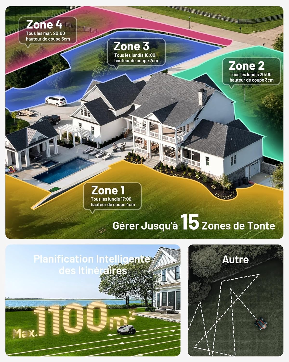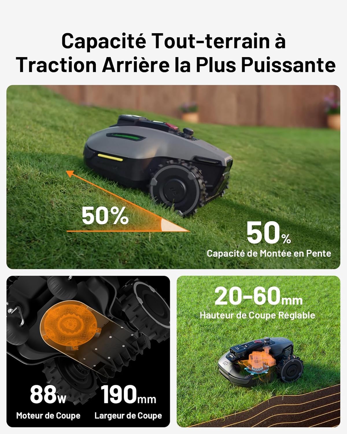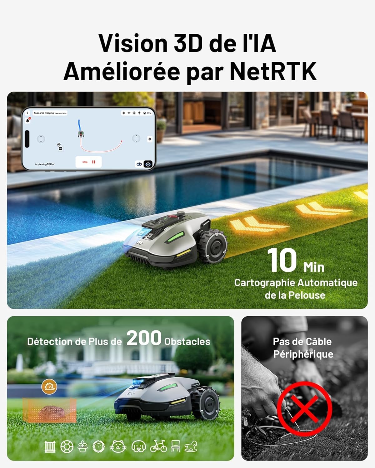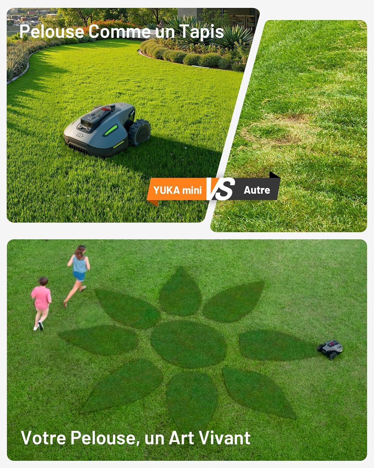 The YUKA mini 700 robotic lawnmower is shipped separately from the garage. It features the world's first NetRTK+Vision system: no RTK base station installation required, ready to use out of the box. Powered by a NetRTK module and a 4G module, both free until 2026, the system ensures stable, centimeter-level positioning accuracy, even under trees or in narrow passages. The RTK base station is still included. One-time payment, lifetime benefits: Based on advanced AI vision and RTK technology, the YUKA mini can autonomously create virtual maps in the Mammotion app. For an 800-square-meter lawn, it generates a complete map in just 10 minutes. No wireless perimeter lines required, and no manual movement on the lawn! The YUKA mini's AI-driven algorithm ensures precise coverage from corner to edge, with cutting accuracy within 5 centimeters of walls, guaranteeing clean edges. Advanced UltraSense AI vision module: When the ground and lawn edge are aligned, the YUKA mini robotic lawnmower can move along the boundary for clean, precise cuts. Even without satellite signals, it can detect invisible boundaries, thus always staying within the designated mowing area. AI Object Recognition and Obstacle Avoidance: YUKA mini utilizes AI deep learning-based 3D object recognition and obstacle avoidance technology, enabling it to excellently detect and avoid obstacles. Easily manage up to 15 different mowing zones: Through the Mammotion app, you can easily set up mowing tasks for up to 15 work zones and create paths between them, even in narrow passageways between houses. Set different mowing times, patterns, and cutting heights for each mowing zone. Create no-go zones for areas that don't require mowing, such as ordinary flower beds, playgrounds, or swimming pools. YUKA mini has a 3.5 cm vertical ground clearance and can adapt to slopes of up to 50% (27Spend), allowing it to work in over 99% of residential gardens. Once installed, YUKA mini can automatically perform mowing, trimming, and other tasks, and is adaptable to various grass species. Its intelligent navigation system performs 1 to 3 additional trims along the edges to ensure a perfectly trimmed lawn, minimizing missed areas and easily creating a carpet-smooth lawn. Triple cutting efficiency enhancement: The YUKA mini robotic lawnmower features a unique cutting disc and floating cutting disc design, with a cutting width of up to 190 mm (7.2 inches), ensuring efficient and precise edge trimming. Dynamic height adjustment ensures a consistent cutting height (20-60 mm (0.78-2.64 inches)) across various terrains.