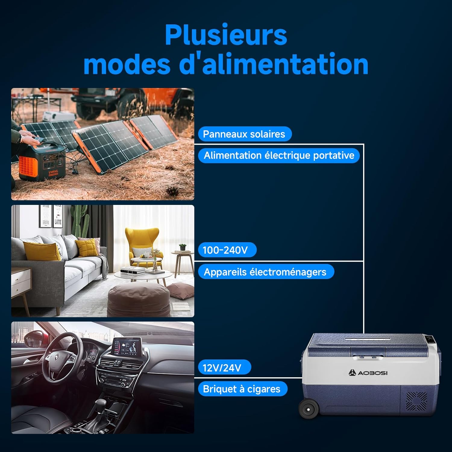Dual Temperature Zones: This compressor-type refrigerator features a dual temperature zone design, allowing for simultaneous freezing and refrigeration, or dual-zone freezing and refrigeration to meet your different needs. Each zone has an independent temperature setting, allowing you to adjust storage conditions as desired. Whether you want to keep fruit fresh, beverages chilled, or food frozen at all times, this refrigerator is the ideal choice. Portability: The AAOBOSI refrigerator is equipped with rugged all-terrain wheels and an ergonomic telescopic handle, making it easy to move around at home, in the garage, or outdoors. Designed to handle various terrains, it's a convenient companion. The telescopic handle ensures a comfortable grip, making every trip a pleasure. Whether at home, camping, or on a long trip, this car refrigerator meets your needs in various situations. It's perfect for multi-person use, providing a comfortable and convenient experience anytime, anywhere. App Support: The AAOBOSI car refrigerator offers two smart control modes for a personalized user experience: touch button adjustment and app management (compatible with Android and iOS systems). You can choose the most suitable control method according to your needs. Whether you're in your car or camping outdoors, you can easily control the temperature remotely via the app. The app also displays the real-time internal temperature of the 24V car refrigerator, ensuring your food and drinks stay fresh and at their optimal condition. Multiple operating modes: The AAOBOSI car refrigerator offers two intelligent operating modes: ECO (energy saving) and MAX (rapid cooling). In ECO mode, the refrigerator minimizes energy consumption, extending battery life. MAX mode provides rapid cooling, quickly reaching the desired temperature. Furthermore, this 12V car refrigerator features a three-level battery protection mode (H/M/L), corresponding to high, medium, and low start-up and stop voltages respectively. When the output voltage is insufficient, the refrigerator automatically shuts off, ensuring the car battery remains the primary power source. More details: This compressor-type car refrigerator features LED lighting, making it easy to see inside even at night. The 12V/220V dual-power car refrigerator has a drainage hole at the bottom for easy cleaning. Additionally, the refrigerator has a built-in USB charging port, allowing you to charge your phone or tablet anytime. The product includes a 100-240V power adapter and a 12V/24V DC cigarette lighter power cord (approximately 2.6 meters long), allowing for convenient use at home, in the car, or outdoors, especially suitable for long-distance travel, camping, barbecues, and other outdoor activities. The AAOBOSI car refrigerator keeps food fresh even on the go, with a temperature range of -20SpendC to 20SpendC, and can simultaneously refrigerate and freeze. Thoughtful design for convenient travel. Wireless connectivity with three power supply modes available.