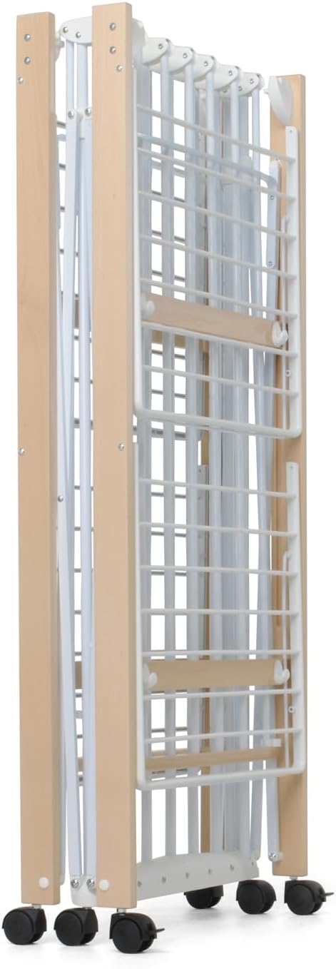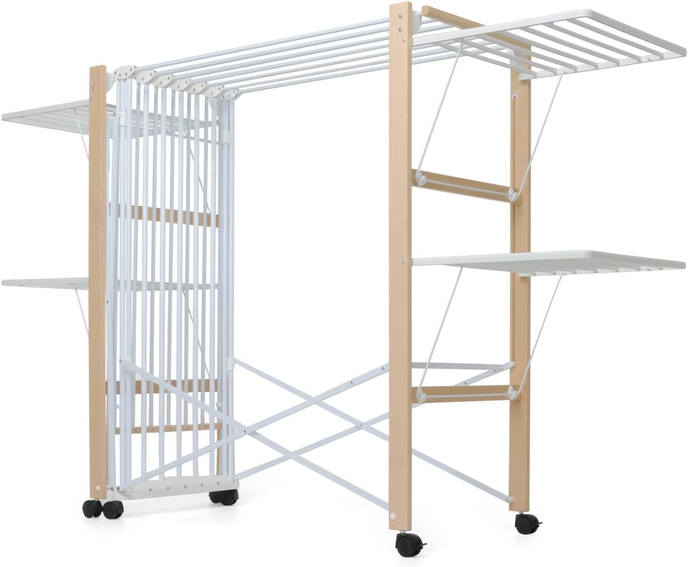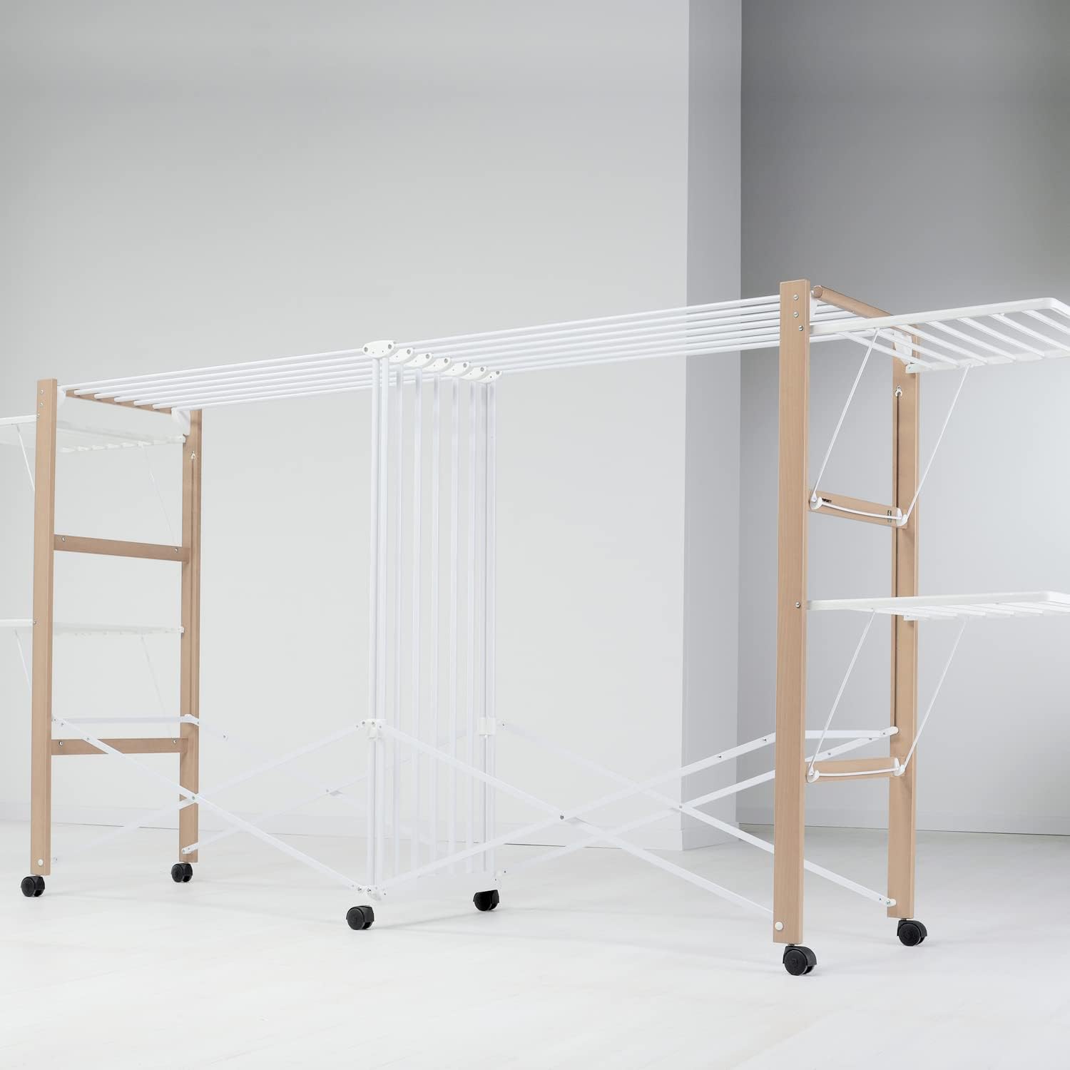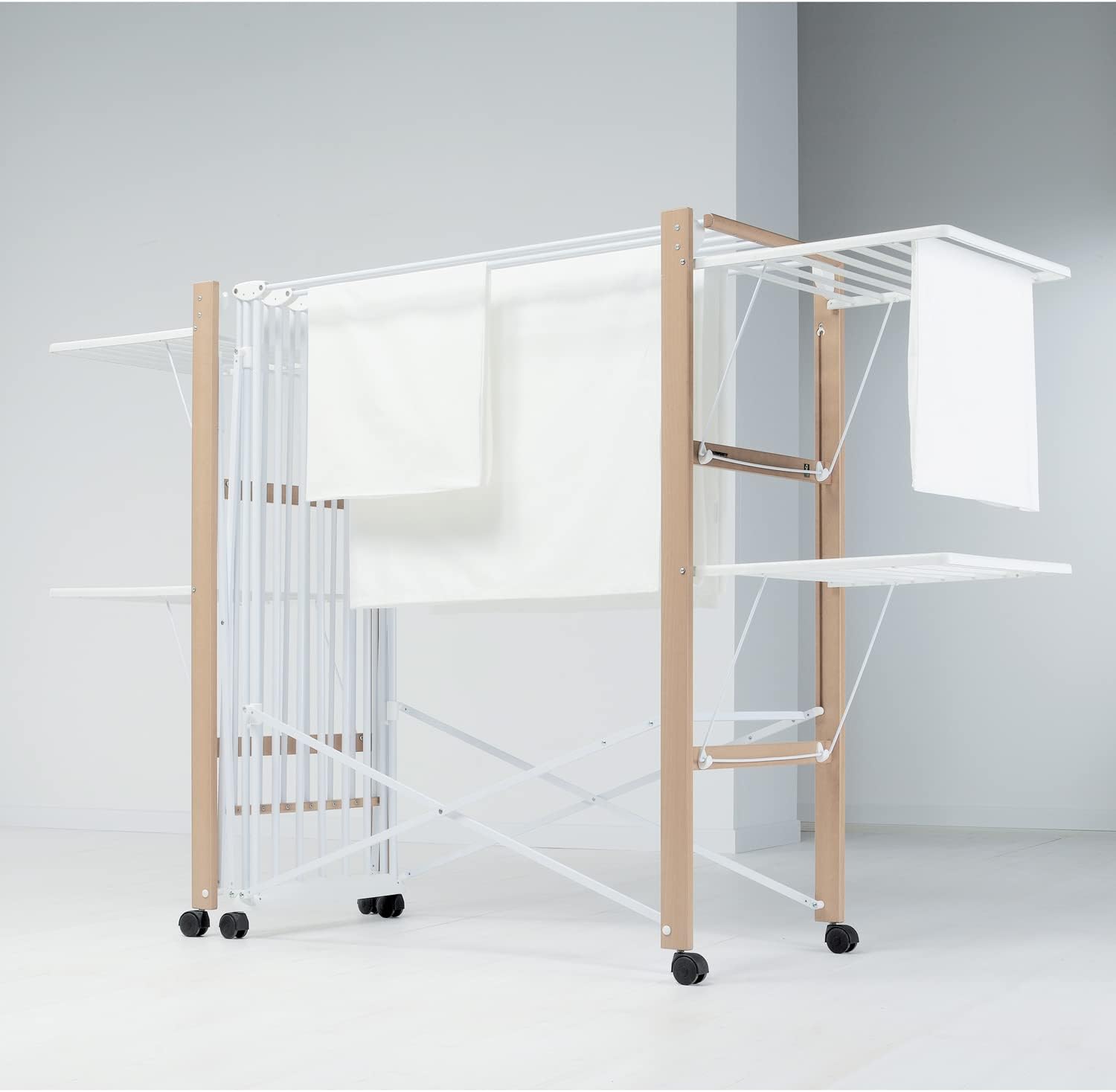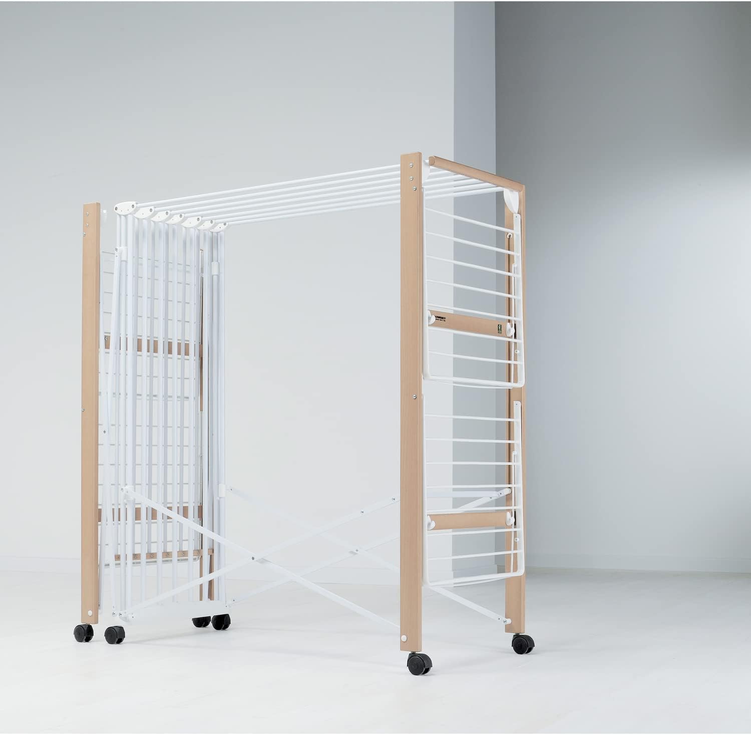 FoppapedrettiNature Clothes Drying Rack The Allungo folding wooden clothesline provides 30 meters of hanging line. It is designed for hanging bulky items such as sheets and tablecloths. Thanks to its solid lacquered beechwood frame, it is sturdy and durable. When folded, it stands upright and takes up little space: 19 centimeters. It is also easy to move thanks to 6 scratch-resistant swivel casters.
