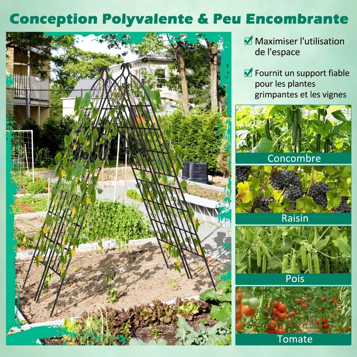 Our large garden pergola is perfect for growing cucumbers, grapes, tomatoes, and other plants. Made of rust-resistant and weather-resistant galvanized metal, it's durable and long-lasting. The pointed design allows for easy insertion into the soil, enhancing stability. You can connect multiple pergolas together to create more combinations. With easy-locking connectors, you can install quickly. This pergola features a classic arched design and butterfly pattern, making it a perfect addition to your garden or patio. Features: Large span, rust-resistant and sturdy. This decorative garden pergola is made of galvanized metal, making it resistant to deformation, rust, and weathering, ensuring durability. The pointed design allows for easy insertion into the soil, enhancing stability. The 180cm high outdoor pergola provides ample climbing space, offering ideal upward growth for your climbing plants, flowers, or vines. By allowing plants more sunlight, they can thrive and grow upwards. Easy assembly: This plant stand comes with complete components and detailed instructions, making assembly very easy. The stands can be easily spliced ??together. Furthermore, you can freely rotate the metal mesh as needed. Versatile: This 4-panel metal mesh stand can be combined with an A-frame to maximize space and provide growing room for both climbing plants and low-growing vegetables. It can also be used as an animal barrier in your garden. Personalized Decoration: The metal mesh panels feature an elegant arched top and are adorned with a charming butterfly pattern, adding a vintage touch to your garden, lawn, or patio. You can also choose to combine multiple stands to create various frames to meet your specific needs. Sturdy and Durable Features: Sturdy and durable. The tall pergola provides reliable support for climbing plants and vines. The galvanized metal tubing is rust-resistant and durable. Can be used as an animal fence in the garden. The pointed design makes it easy to insert into the ground. Saves space when planting low-growing vegetables under the pergola. Multiple pergolas can be connected together for personalized layouts. Simple locking connectors make assembly easier. The delicate butterfly pattern enhances the design. The elegant arch adds a touch of style to your space. Specifications: Color: Black; Material: Galvanized metal; Fence dimensions (simple): 180 x 50 cm (length x width); Net weight: 8 kg. Includes: 4 metal garden flower stands, 1 instruction manual.