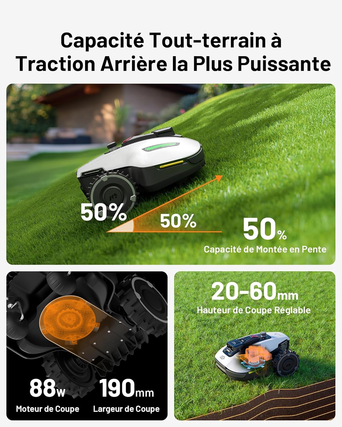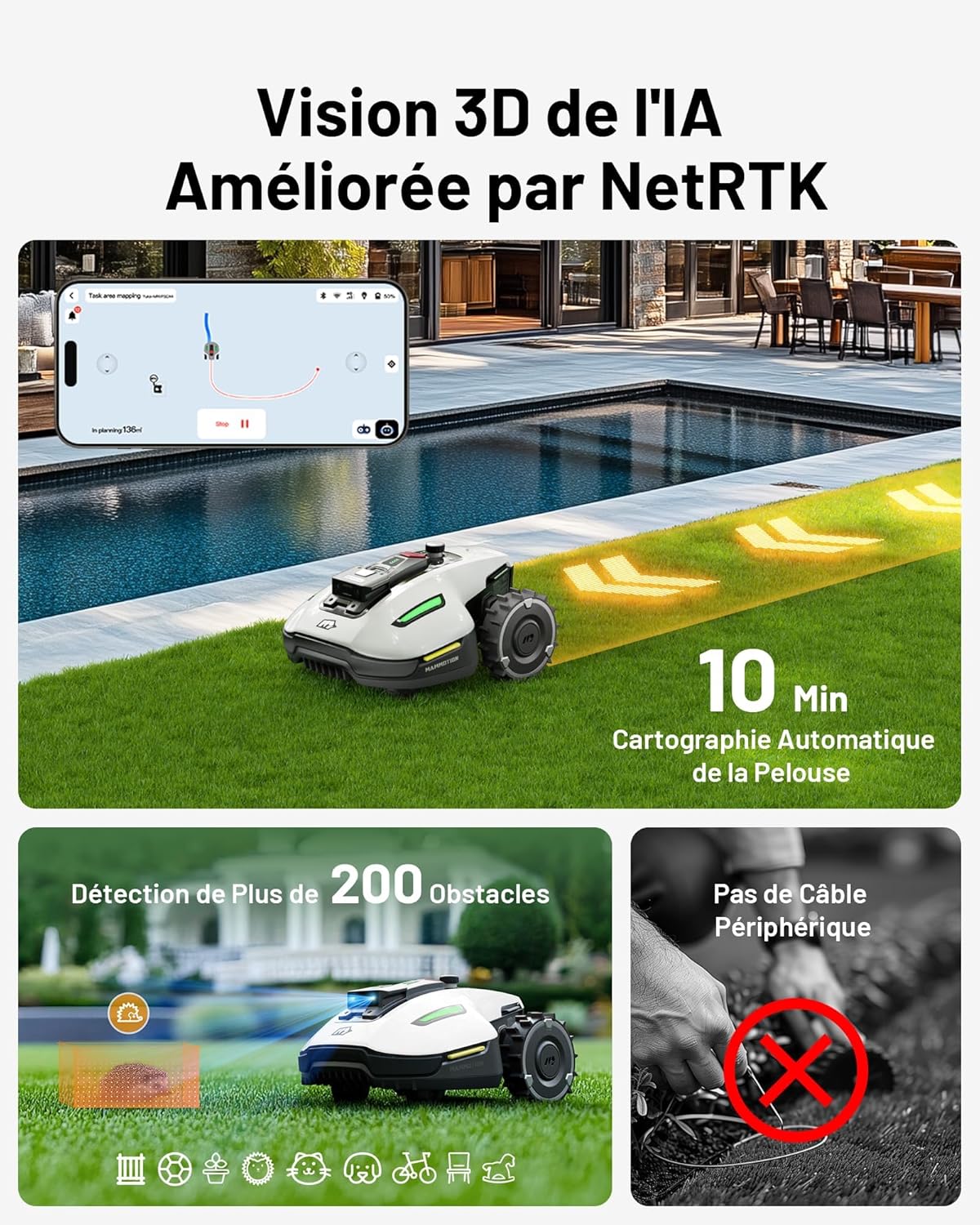 Add the YUKA mini 500 robotic lawnmower and the included MAMMOTION garage to your cart and receive the garage for free. The YUKA mini 500 robotic lawnmower and garage will be shipped separately. World's first NetRTK+Vision system: No RTK base station installation required, ready to use out of the box. Powered by a NetRTK module and a 4G module, both free until 2025, ensuring stable, centimeter-level positioning accuracy even under trees or in narrow passages. The RTK base station is always included. One-time payment, lifetime benefits: Based on advanced AI vision and RTK technology, the YUKA mini can autonomously create virtual maps in the Mammotion app. For an 800-square-meter lawn, it generates a complete map in just 10 minutes. Wireless perimeter installation means you no longer need to manually move it across the lawn! The YUKA mini's AI-driven algorithm ensures precise coverage from corner to edge, with cutting accuracy within 5 cm of walls*, guaranteeing neat edges. Advanced UltraSense AI Vision Module: When aligned with the ground and lawn edge, the YUKA mini robotic lawnmower moves along the boundary for clean, precise cuts. Even without satellite signals, it detects invisible boundaries, staying within the designated mowing area. AI Object Recognition and Obstacle Avoidance: Based on AI deep learning, the YUKA mini's 3D object recognition and obstacle avoidance technology excels at detecting and avoiding obstacles. Easily Manage Up to 15 Different Mowing Zones: With the Mammotion app, you can easily set up mowing tasks for up to 15 work zones and create paths between them, even in narrow passageways between houses. Set different mowing times, patterns, and cut heights for each zone. Create no-mowing zones for areas that don't require mowing, such as regular flower beds, playgrounds, or swimming pools. With a 3.5 cm vertical ground clearance and adaptable to 50% (27Spend) slopes, the YUKA mini can operate in over 99% of residential gardens. Once installed, the YUKA mini can automatically perform mowing, trimming, and other tasks, and is adaptable to various grass species. Its intelligent navigation system performs 1 to 3 extra trims along the edges to ensure a perfectly trimmed lawn, minimizing missed areas and easily creating a carpet-smooth lawn. Triple cutting efficiency enhancement: The YUKA mini robotic lawnmower features a unique floating cutting disc design with a cutting width of up to 190 mm (7.2 inches), ensuring efficient and precise edge trimming. Dynamic height adjustment ensures consistent cutting height across different terrains (20-60 mm (0.78-2.64 inches)). A full charge allows the YUKA mini to trim up to 80 square meters of lawn.