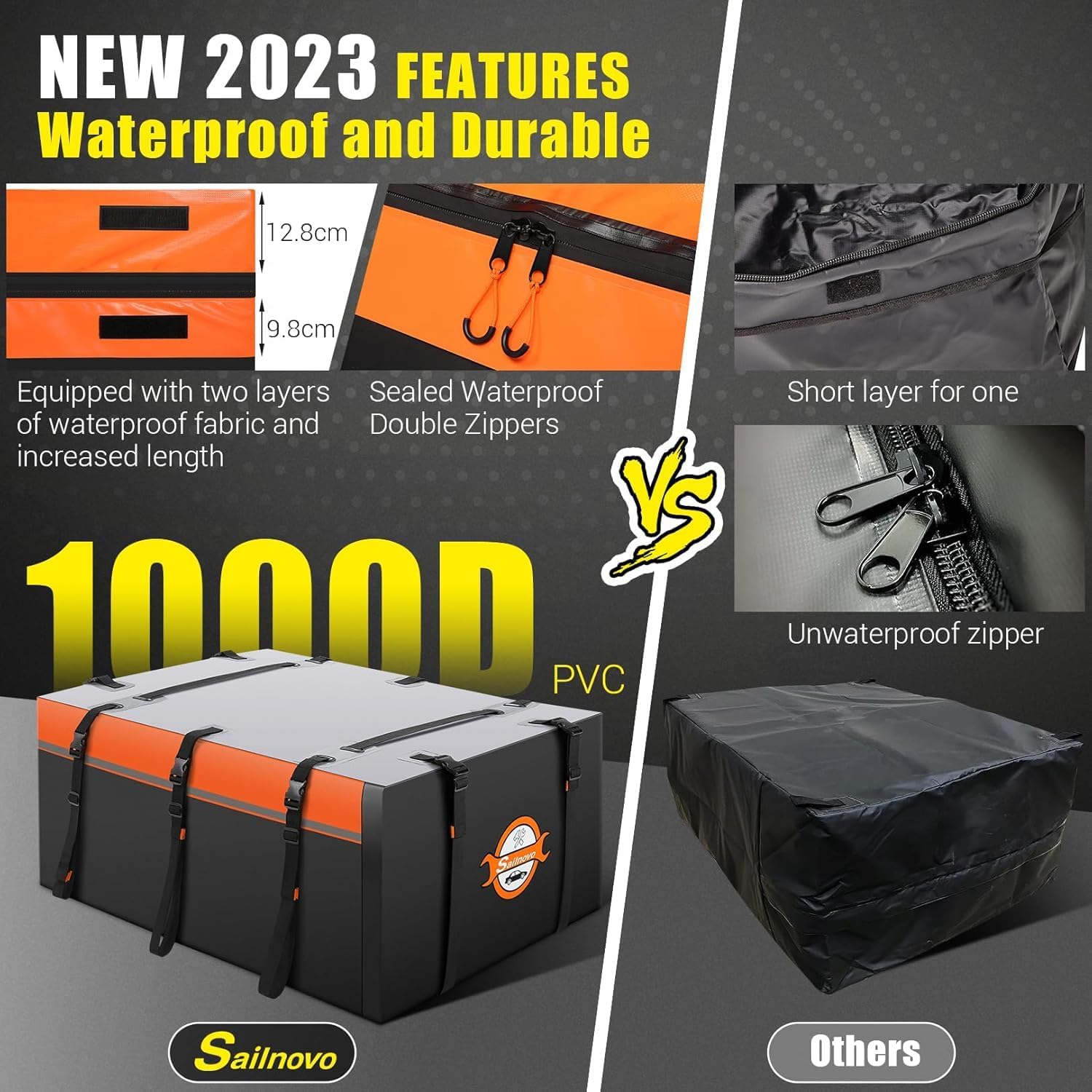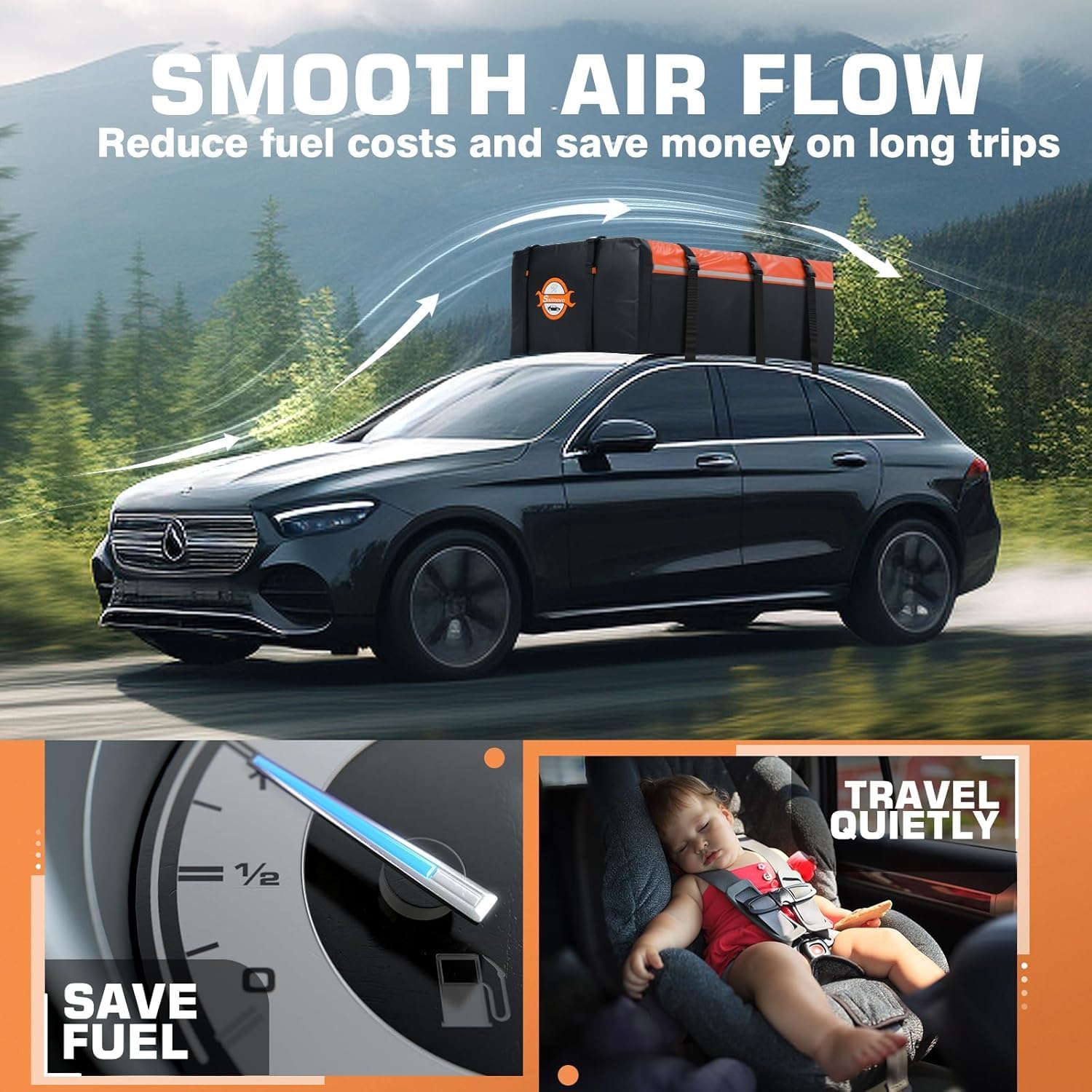 Spacious and Practical: This soft-shell roof bag boasts a massive 594-liter capacity, easily accommodating all your gear, including 4-6 suitcases, 4 tents, 4 sleeping bags, and more. It's ideal for family trips and camping, providing extra storage space for all your essentials. Anti-Slip Mat: We include an anti-slip mat to ensure your roof bag stays securely in place during your journey, preventing wobbling and rattling. Universal Design: Our waterproof roof bag fits most car models and is easy to install in minutes using side rails, roof crossbars, or roof baskets. For vehicles without roof crossbars, we offer 6 door hooks. Secure and Sturdy: With 6 door hooks and 8 adjustable straps, our roof storage bag stays firmly in place throughout your journey, preventing rain from seeping into your vehicle. The anti-slip mat effectively prevents scratches on the roof and reduces noise during driving. Durable and Weatherproof: This redesigned car storage bag features waterproof zippers, extended Velcro fasteners, and double-reinforced fabric to withstand various weather conditions. It ensures your items stay dry and safe, even in heavy rain or snow.