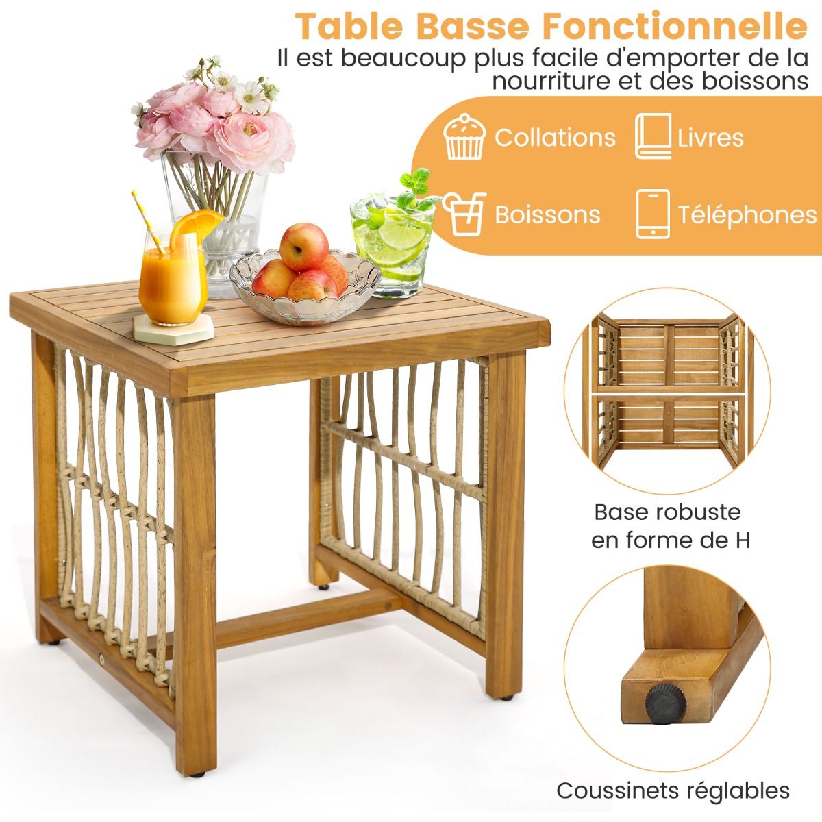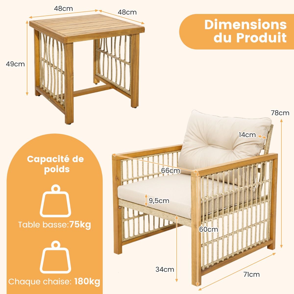 Need to add more furniture to your patio? Then choose our three-piece outdoor dining table and chair set! This three-piece outdoor furniture set includes a square side table and two armchairs, perfect for porches, patios, gardens, and other outdoor spaces. Wherever you place this outdoor furniture set, its fade-resistant PE rattan, sturdy acacia wood, and rust-resistant metal frame ensure superior durability and stability, giving you peace of mind. Once seated, the soft cushions, adjustable backrests, and ergonomic armrests provide a comfortable experience. Product Features: This sturdy and durable three-piece outdoor furniture set, including two armchairs and a square coffee table, transforms your porch, patio, balcony, and garden into a relaxing place for chatting and enjoying drinks, making your outdoor life more enjoyable. Selected Materials: The hand-woven PE rattan is fade-resistant and sun-protective, able to withstand the elements. Furthermore, the sturdy, rust-resistant metal frame encasing the PE rattan gives this patio furniture set excellent stability and ensures its longevity. The upholstered seats are filled with high-density sponge, soft and thick, providing a comfortable seating experience. Furthermore, these seats feature an ergonomic design with a reclining backrest and acacia wood armrests. The acacia wood table is made of acacia wood, with a smooth surface, reinforced crossbeams, a soft touch, and stable support for various items. Adjustable table legs allow the table to adapt to uneven surfaces. All seat cushions have smooth zippers for easy removal of the cushion covers for washing. Note: 1) Always keep the cushions dry. 2) Do not tighten all screws until all screw holes are aligned. Product Features: Sturdy and durable hand-woven light yellow PE rattan, breathable and stylish. Smooth acacia wood frame with strong load-bearing capacity (coffee table 75 kg, each chair 180 kg). Strong rust-resistant metal frame provides extra stability. Soft seat cushions provide a comfortable seating experience. Keeping the cushions dry extends their lifespan. Removable and washable cushion covers for added convenience. Reclining backrest and ergonomic armrests provide extra comfort. Square coffee table for easy access to items. Adjustable feet allow the table to be placed on uneven ground. Suitable for porches, patios, patios, gardens, and backyards. Simple assembly required. Specifications: PE rattan; Color: Natural; Cushion Color: Beige; Materials: PE rattan, acacia wood, metal, polyester fiber, sponge, sprayed non-woven fabric; Coffee table dimensions: 48 x 48 x 49 cm (L x W x H). Overall dimensions of each chair: 66 x 71 x 78 cm (Length x Width x Height) Seat height from the ground: 34 cm Each backrest cushion dimensions: 62 x 47 x 14 cm (Length x Width x Thickness) Each seat cushion dimensions: 57 x 57 x 9.5 cm (Length x Width x Thickness) Coffee table net weight: 5 kg Each chair net weight: 11 kg Total net weight: 27 kg Coffee table load capacity: 75 kg Each chair load capacity: 180 kg Delivery list: 1 x Coffee table 2 x Chairs 2 x Backrest cushions 2 x Seat cushions 1 x Instruction manual