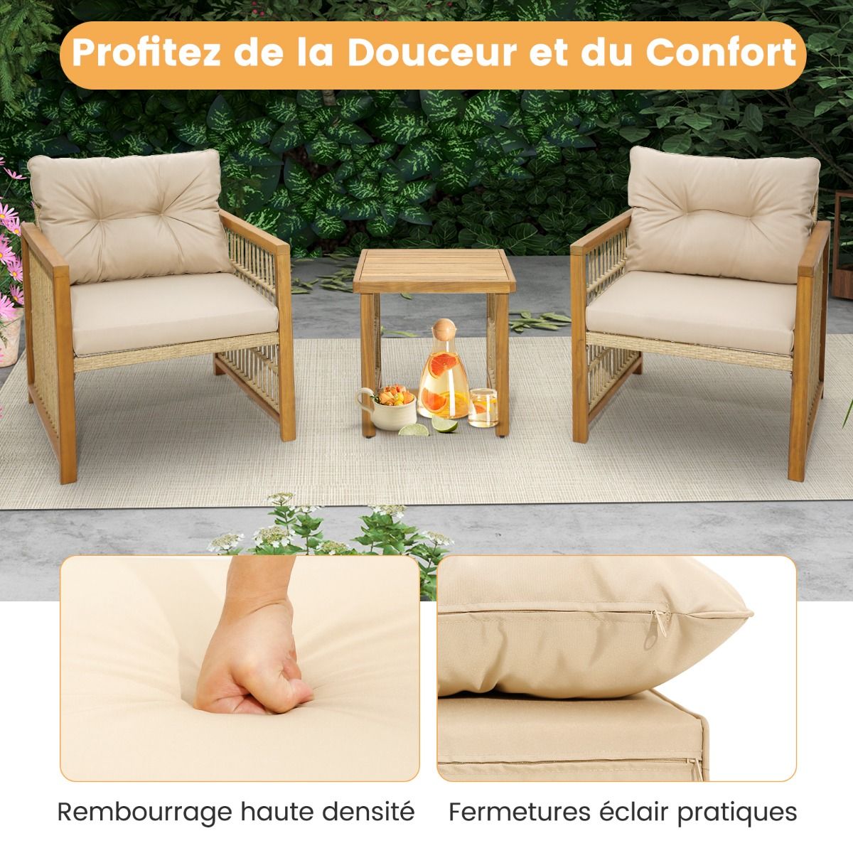 • Garden furniture set with 1 table and 2 armchairs in acacia wood and UV-resistant rattan, adjustable legs, cushions with zip, Nautel -
