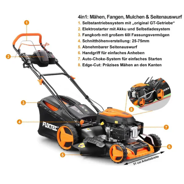 Product Description: Explore the FUXTEC FX-RM5196eS lawnmower, a high-performance model that makes lawn care an easy and quick job. Equipped with a zipgo? engine featuring electric start, it starts with the ease of a sports car, thanks to its automatic choke system optimized for various mowing conditions. With an impressive 6 horsepower and a 51cm cutting width, it can easily handle large lawns up to 1500 square meters. Its robust steel construction and advanced features, such as shredding and dual-row mowing, provide unparalleled flexibility. This lawnmower is ideal for discerning homeowners seeking convenience and efficiency, especially those who value technology that simplifies outdoor maintenance. Easy Start: The electric start system eliminates the need for manual rope pulling or starting. Simple Operation: The automatic choke ensures easy start-up, requiring no additional steps to remember. Powerful Performance: The powerful engine provides ample power to cover large areas up to 1500 square meters. Versatile Mowing Options: Offers shredding and dual-row mowing options to suit your mowing preferences. Easy Maintenance: The EasyClean system makes post-use cleaning a breeze. Technical Specifications: Engine: Powerful 196ccm four-stroke OHV; Maximum Power: Powerful 6 hp (3.9 kW at rated speed); Cutting Width: Powerful 51 cm; Materials: Robust steel chassis and high-quality steel blades; Starting System: Powerful lithium-ion battery electric start and self-charging. Manual Start (via additional pull cord starter) Drive Type: Rear-wheel drive self-propelled system Cutting Height Adjustment: Centralized (25-75 mm) Hay Bag Capacity: 60 liters, with air intake system, suction power increased by up to 90% Hay Removal Method: Rear and side removal Hay Cutter Function: Yes Wheels: Large wheel design with ball bearings (255 mm rear wheel, 175 mm front wheel) EasyClean System: Simplified Maintenance