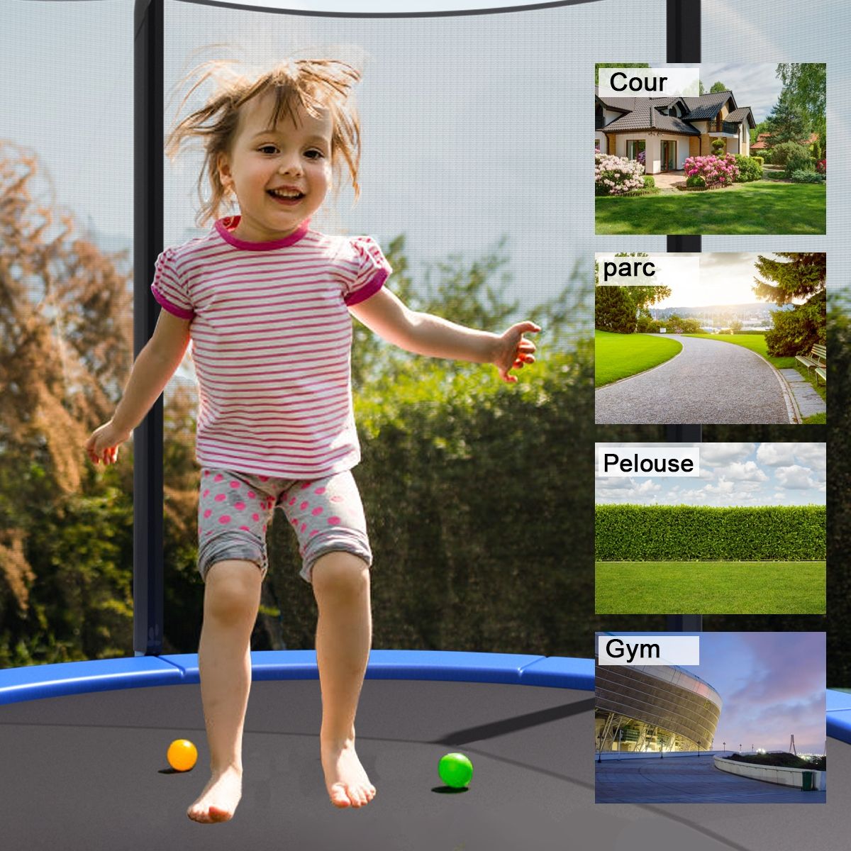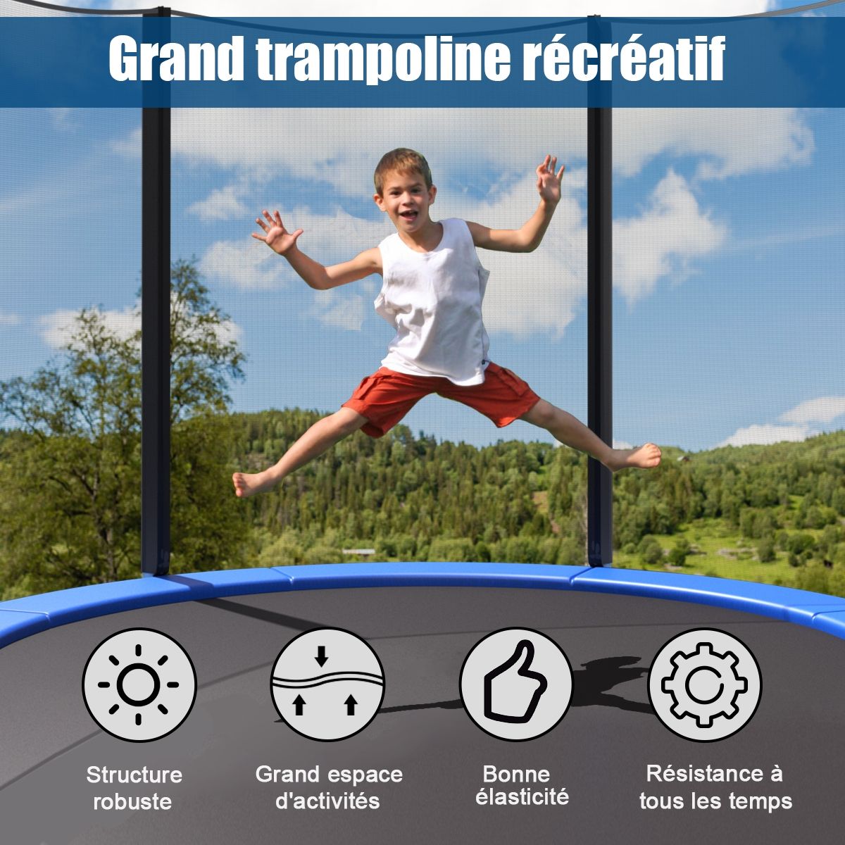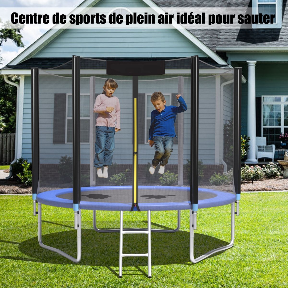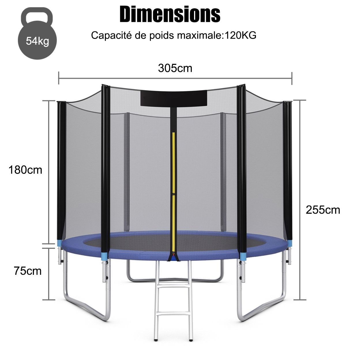 This trampoline is an ideal choice for family leisure and entertainment, especially for families with children. Constructed from rust-resistant galvanized steel and a weather-resistant jumping mat, it is sturdy and durable. With its six U-shaped legs, this outdoor trampoline can support a maximum weight of 120 kg. Safety netting and foam-wrapped posts provide superior impact protection, preventing children from being injured by accidental impacts during jumps. The seamless design between the safety netting and the jumping mat prevents children from getting stuck in gaps. Furthermore, sturdy and durable high-elasticity springs ensure better jumping performance and a longer lifespan. The trampoline provides ample space for activities, enriching social life and promoting parent-child interaction. Product Features: Sturdy Galvanized Steel Trampoline This trampoline features a rust-resistant galvanized steel frame for a longer lifespan and a maximum weight capacity of 120 kg. Six U-shaped support legs are evenly distributed on the bottom of the trampoline, ensuring excellent stability during jumps. Maximum Safety Protection: Our trampoline is equipped with a safety net, providing a safe and clearly visible jumping environment. Safety matting covers all four sides to prevent children's limbs from getting stuck in gaps. In addition, all uprights are wrapped in soft foam to prevent children from getting injured. Superior flexibility and elasticity: Our trampolines use high-strength galvanized springs, firmly attached to the jumping mat and steel frame, preventing deformation and ensuring durability. Furthermore, the breathable jumping mat provides excellent bounce performance, bringing a more comfortable experience so you can enjoy your time to the fullest. Durable surface and convenient access: Our weather-resistant trampolines are sun-proof and waterproof, ideal for long-term outdoor use. High-strength galvanized steel ladders facilitate quick access for children, and the double-sided zipper design allows for easy opening and closing of the safety net from both sides. [Large Outdoor Sports Center] This large recreational trampoline allows children to jump with friends or family, not only exercising but also enriching their social lives. In addition, modern basketball hoops provide children with more entertainment options and added fun. Product Features: Easy to assemble, instruction manual included; spacious interior with strong load-bearing capacity; made of rust-proof galvanized steel for longer service life; sturdy springs offer better elasticity and are less prone to deformation; safety net and seamless design provide a safe environment for exercise; sun-proof and waterproof, suitable for long-term outdoor use; 6 evenly distributed U-shaped support legs for a more stable structure. Product Specifications: Gross weight: 45.18 kg; Net weight: 40.23 kg; Colors: Black and blue; Maximum load capacity: 120 kg; Suitable age: 6 years and up; Material: Steel, PP, EPE, PVC, PE; Product dimensions: 305 x 255 cm. Product Includes: 1 x Trampoline; 1 x Trampoline Ladder; 1 x Assembly Tool; 1 x User Manual.