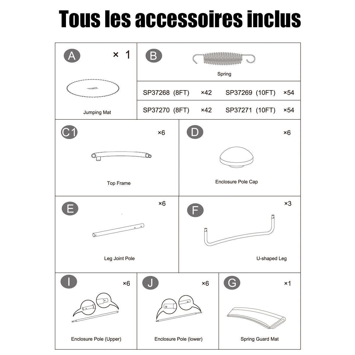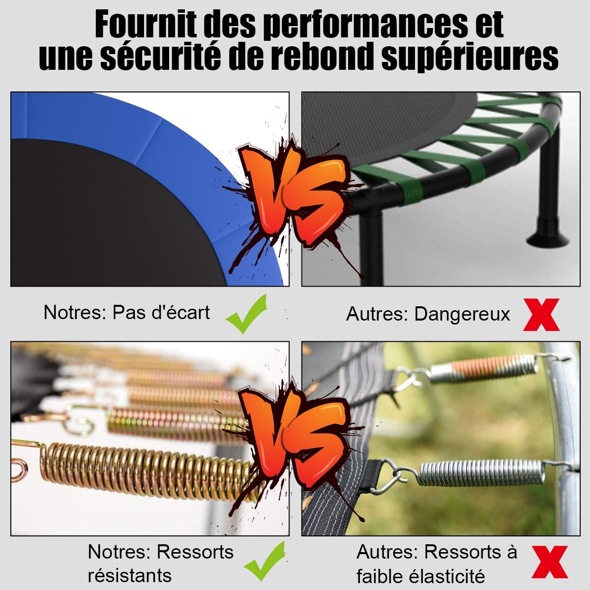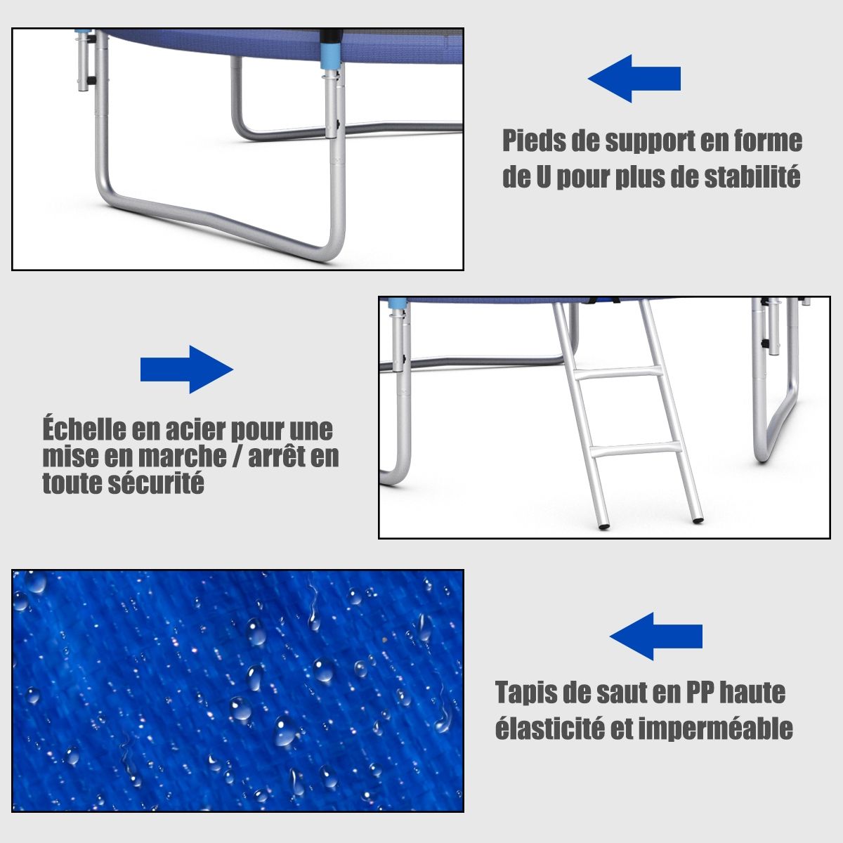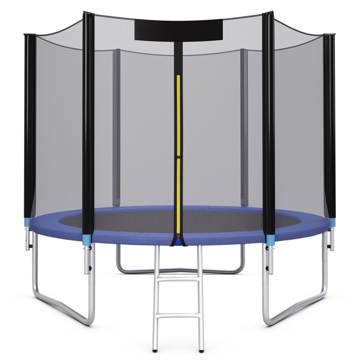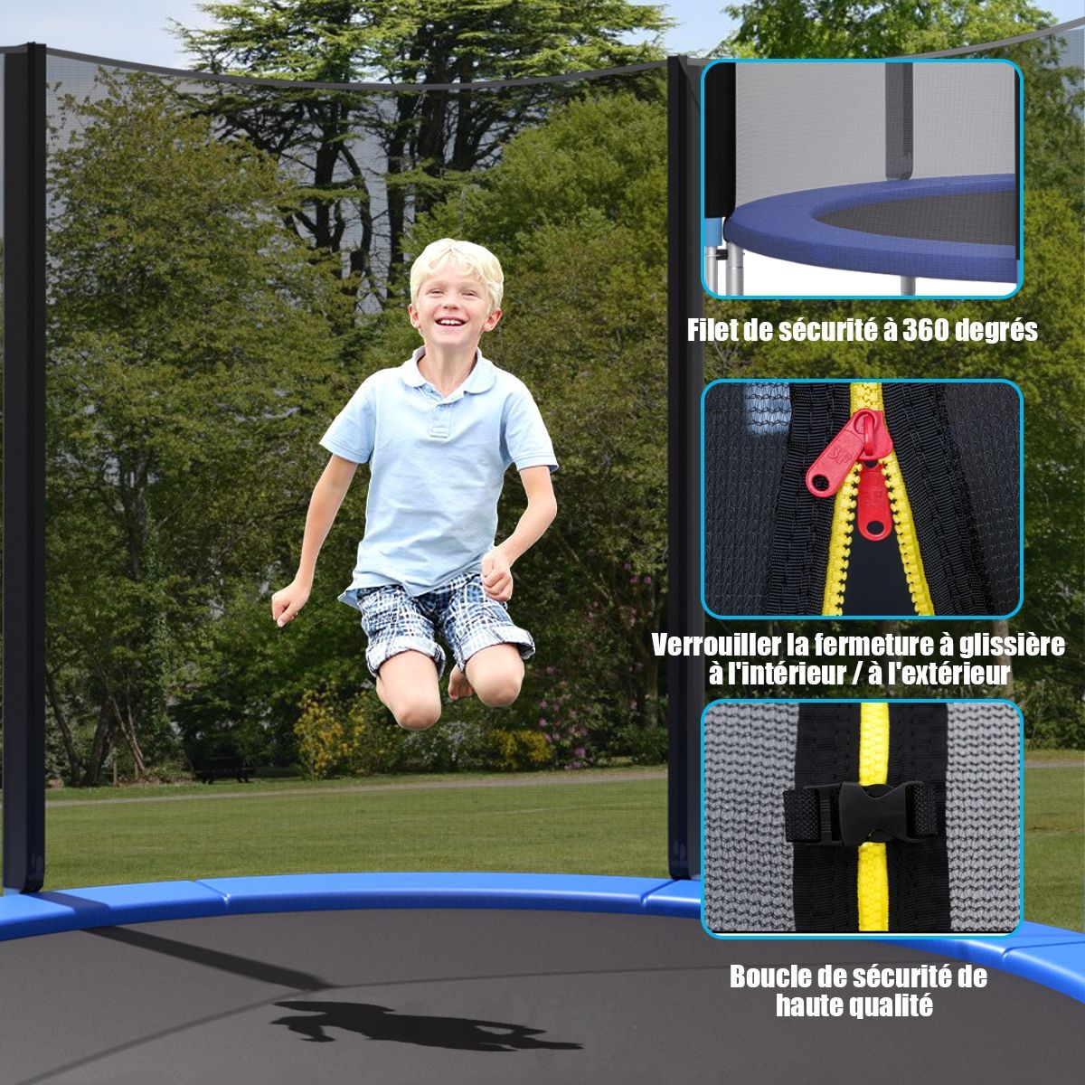 This trampoline is an ideal choice for family leisure and entertainment, especially for families with children. Constructed from rust-resistant galvanized steel and a weather-resistant jumping mat, it is sturdy and durable. With its six U-shaped legs, this outdoor trampoline can support a maximum weight of 120 kg. Safety netting and foam-wrapped posts provide superior impact protection, preventing children from being injured by accidental impacts during jumps. The seamless design between the safety netting and the jumping mat prevents children from getting stuck in gaps. Furthermore, sturdy and durable high-elasticity springs ensure better jumping performance and a longer lifespan. The trampoline provides ample space for activities, enriching social life and promoting parent-child interaction. Product Features: Sturdy Galvanized Steel Trampoline This trampoline features a rust-resistant galvanized steel frame for a longer lifespan and a maximum weight capacity of 120 kg. Six U-shaped support legs are evenly distributed on the bottom of the trampoline, ensuring excellent stability during jumps. Maximum Safety Protection: Our trampoline is equipped with a safety net, providing a safe and clearly visible jumping environment. Safety matting covers all four sides to prevent children's limbs from getting stuck in gaps. In addition, all uprights are wrapped in soft foam to prevent children from getting injured. Superior flexibility and elasticity: Our trampolines use high-strength galvanized springs, firmly attached to the jumping mat and steel frame, preventing deformation and ensuring durability. Furthermore, the breathable jumping mat provides excellent bounce performance, bringing a more comfortable experience so you can enjoy your time to the fullest. Durable surface and convenient access: Our weather-resistant trampolines are sun-proof and waterproof, ideal for long-term outdoor use. High-strength galvanized steel ladders facilitate quick access for children, and the double-sided zipper design allows for easy opening and closing of the safety net from both sides. [Large Outdoor Sports Center] This large recreational trampoline allows children to jump with friends or family, not only exercising but also enriching their social lives. In addition, modern basketball hoops provide children with more entertainment options and added fun. Product Features: Easy to assemble, instruction manual included; spacious interior with strong load-bearing capacity; made of rust-proof galvanized steel for longer service life; sturdy springs offer better elasticity and are less prone to deformation; safety net and seamless design provide a safe environment for exercise; sun-proof and waterproof, suitable for long-term outdoor use; 6 evenly distributed U-shaped support legs for a more stable structure. Product Specifications: Gross weight: 45.18 kg; Net weight: 40.23 kg; Colors: Black and blue; Maximum load capacity: 120 kg; Suitable age: 6 years and up; Material: Steel, PP, EPE, PVC, PE; Product dimensions: 305 x 255 cm. Product Includes: 1 x Trampoline; 1 x Trampoline Ladder; 1 x Assembly Tool; 1 x User Manual.