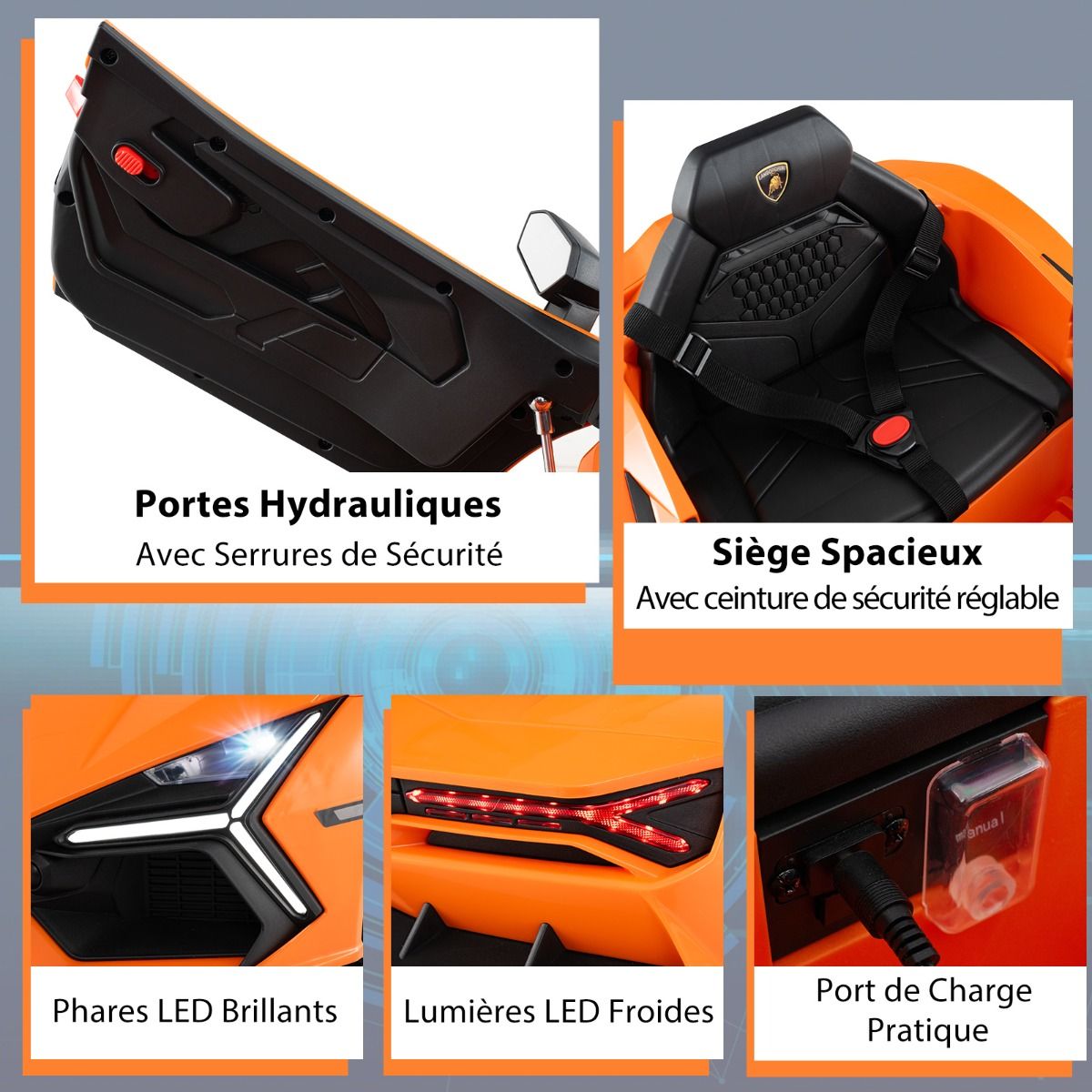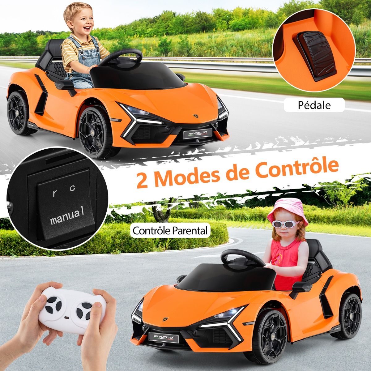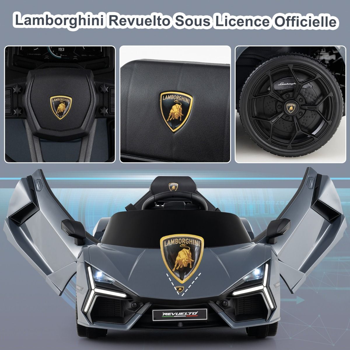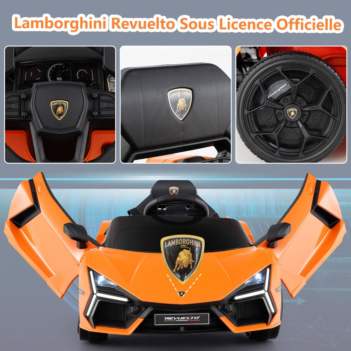 • Revuelto Licensed 12V Electric Ride-On Car for Children with Remote Control and Hydraulic Doors, Suitable for Ages 37-95 Months, Grey/Orange