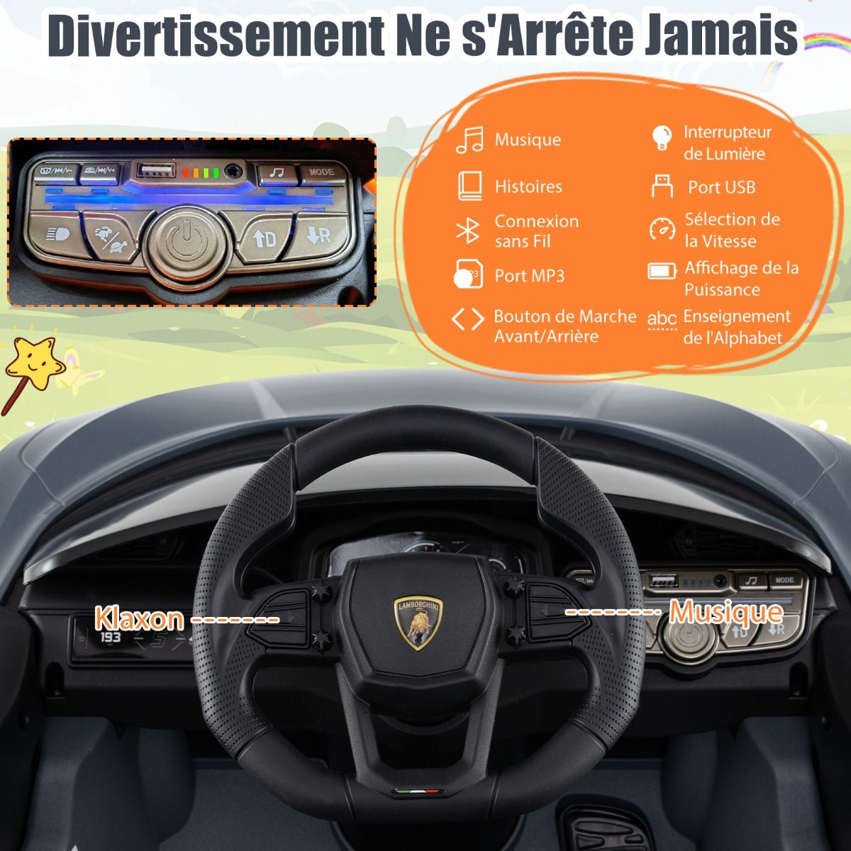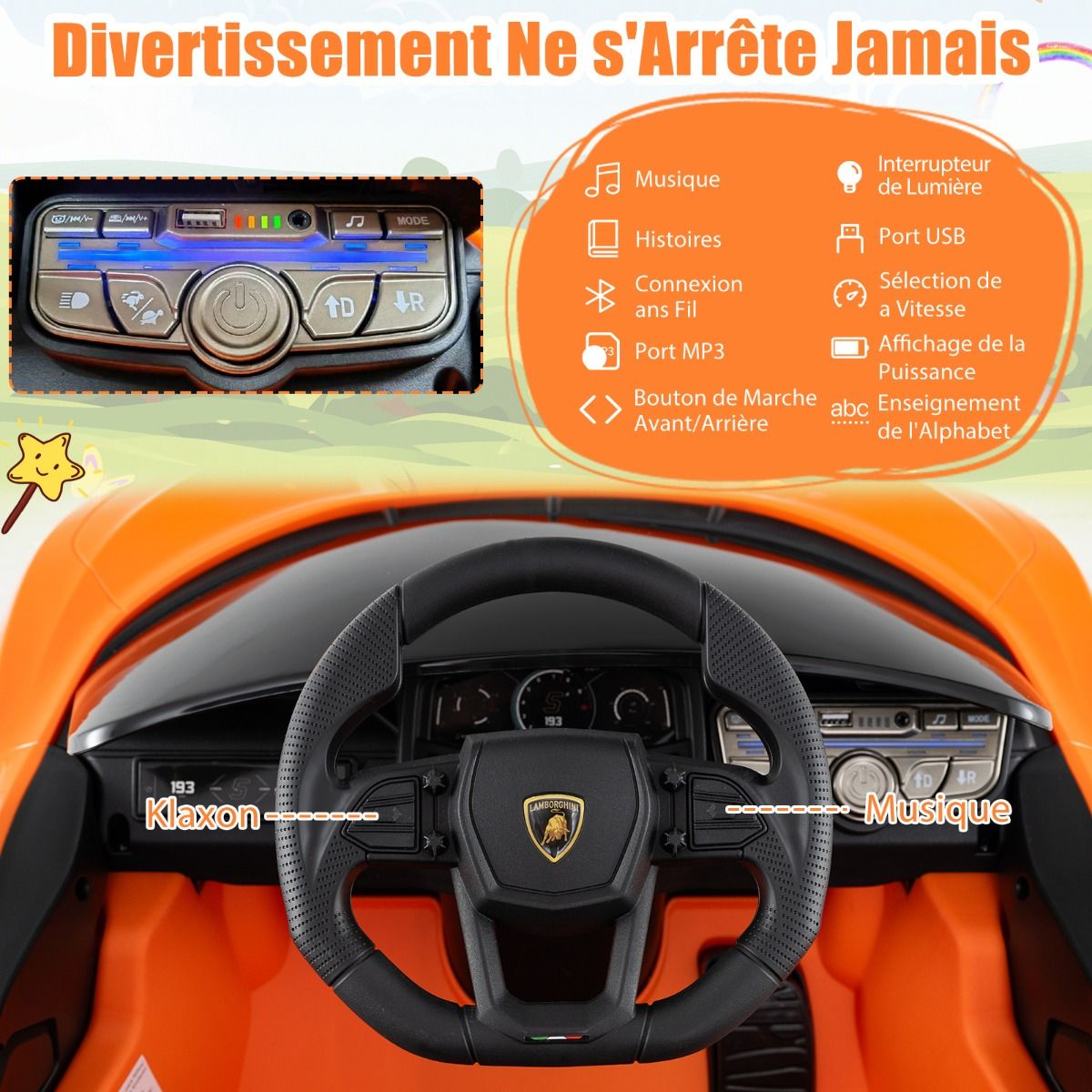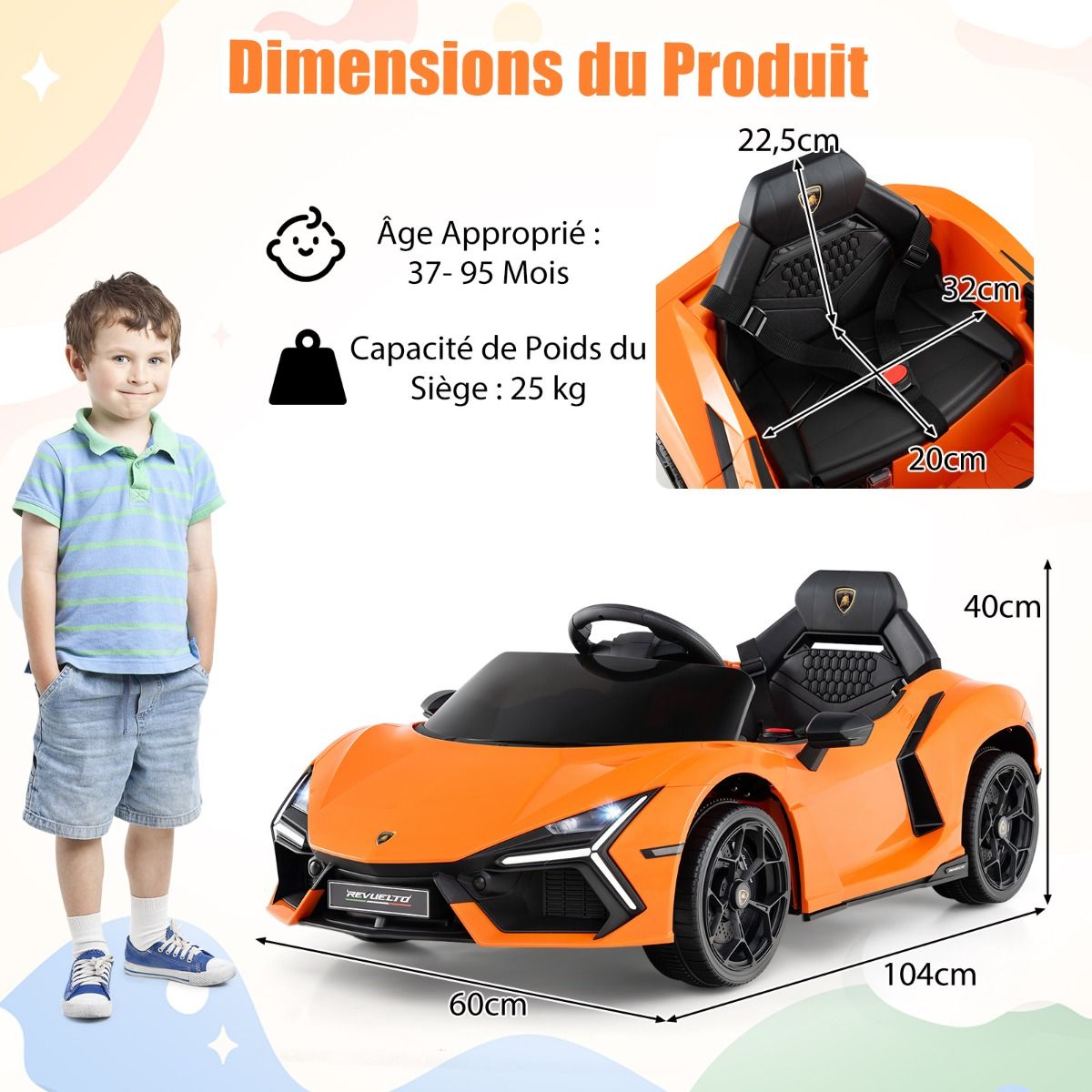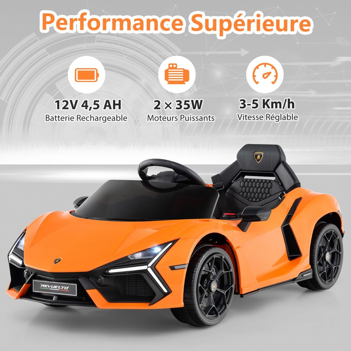 This electric car for children offers an autonomous driving mode and parental controls for safety. Powered by two 35W motors and a 12V rechargeable battery, the Lamborghini Revuelto combines power and style for an exciting driving experience. Hydraulic doors, four-wheel spring suspension, and soft-start function ensure a safe and comfortable ride. With its intuitive controls, smooth ride, and wireless, USB, and MP3 connectivity, this car can provide hours of fun for children. Features: Dual ControlsThis car offers two driving modes, perfect for children (2nd speed) or parents (3rd speed). Balancing safety and fun, it provides a perfect balance of control and independence for children aged 37 to 95 months. Simple and Smooth Driving ExperienceThis electric car features a child-friendly steering wheel, pedals, and buttons for forward, reverse, left, and right turns. Equipped with two transport wheels, it ensures a smooth ride and easy storage. [Safety First] This sports car is equipped with four off-road tires with spring-loaded shock absorbers, ensuring safe and comfortable driving on various road surfaces. Hydraulic doors with safety locks enhance security, while soft start and stop functions prevent bumps. [Non-stop Fun] It features bright LED headlights and taillights, as well as an entertainment system that includes a horn, music, stories, and alphabet lessons. With wireless connectivity, USB, and MP3 interfaces, you can add personalized media, starting a new adventure every time. [Powerful Performance, Officially Licensed Design] This Lamborghini Revuelto is powered by two 35W motors, providing exceptional performance and durability. A 12V rechargeable battery provides children with continuous playtime and can be easily charged via the power display and charging port. Features: Offers autonomous driving and parental control modes. The steering wheel, pedals, and buttons are designed for easy child operation. Two built-in transport wheels make this car easy to move. All four wheels are equipped with spring suspension for a more comfortable driving experience. Smooth starts and stops prevent startling children. Built-in horn, music, stories, and alphabet learning functions provide a fun driving experience. Bright LED headlights and taillights create a stylish appearance. Equipped with wireless connectivity, USB, and MP3 interfaces, it can connect to external devices for added entertainment. A 12V 4.5Ah rechargeable battery extends battery life. Two powerful 12V 35W motors deliver exceptional performance. Hydraulic doors with safety locks ensure safety. Spacious seats with adjustable seatbelts enhance ride comfort. This officially licensed Lamborghini Revuelto makes an ideal gift for children. Assembly required. Specifications: Color: Gray/Orange. Material: PP, Metal. Product Dimensions: 105 * 60 * 40 cm (L x W x H) Seat Dimensions: 32 * 20 * 22.5 cm (L x W x H) Maximum Weight Capacity: 25 kg Recommended Age: 37 to 95 months Motors: 2 x 12V 35W Battery: 12V 4.5Ah Speed: 3 to 5 km/h Charging Time: 8 to 10 hours Remote Control Batteries: 2 x AAA Batteries (Not Included) Net Weight: 12 kg Package Contents: 1 x Bicycle 1 x Remote Control 1 x Charger 1 x Data Cable 1 x Instruction Manual
